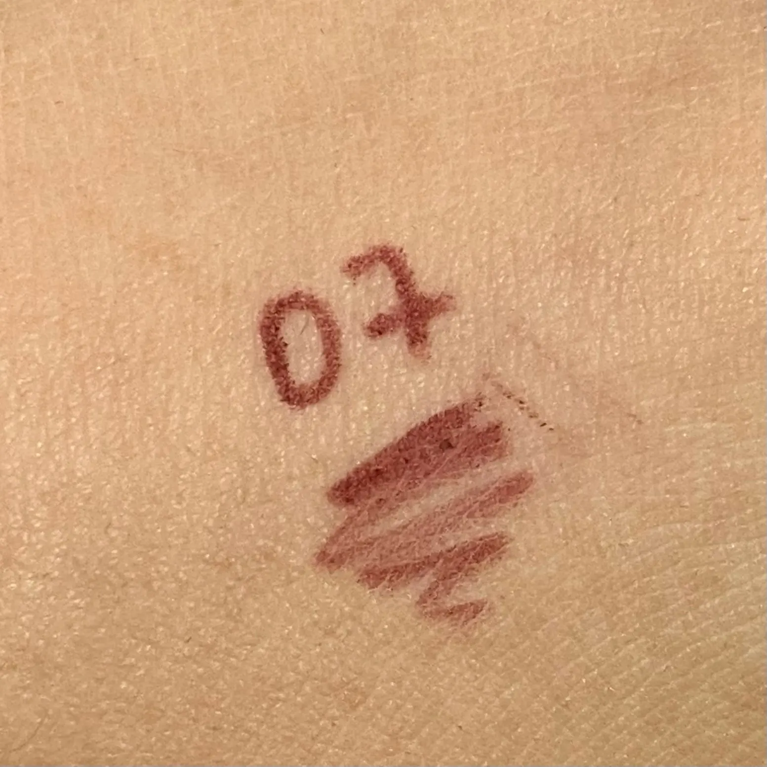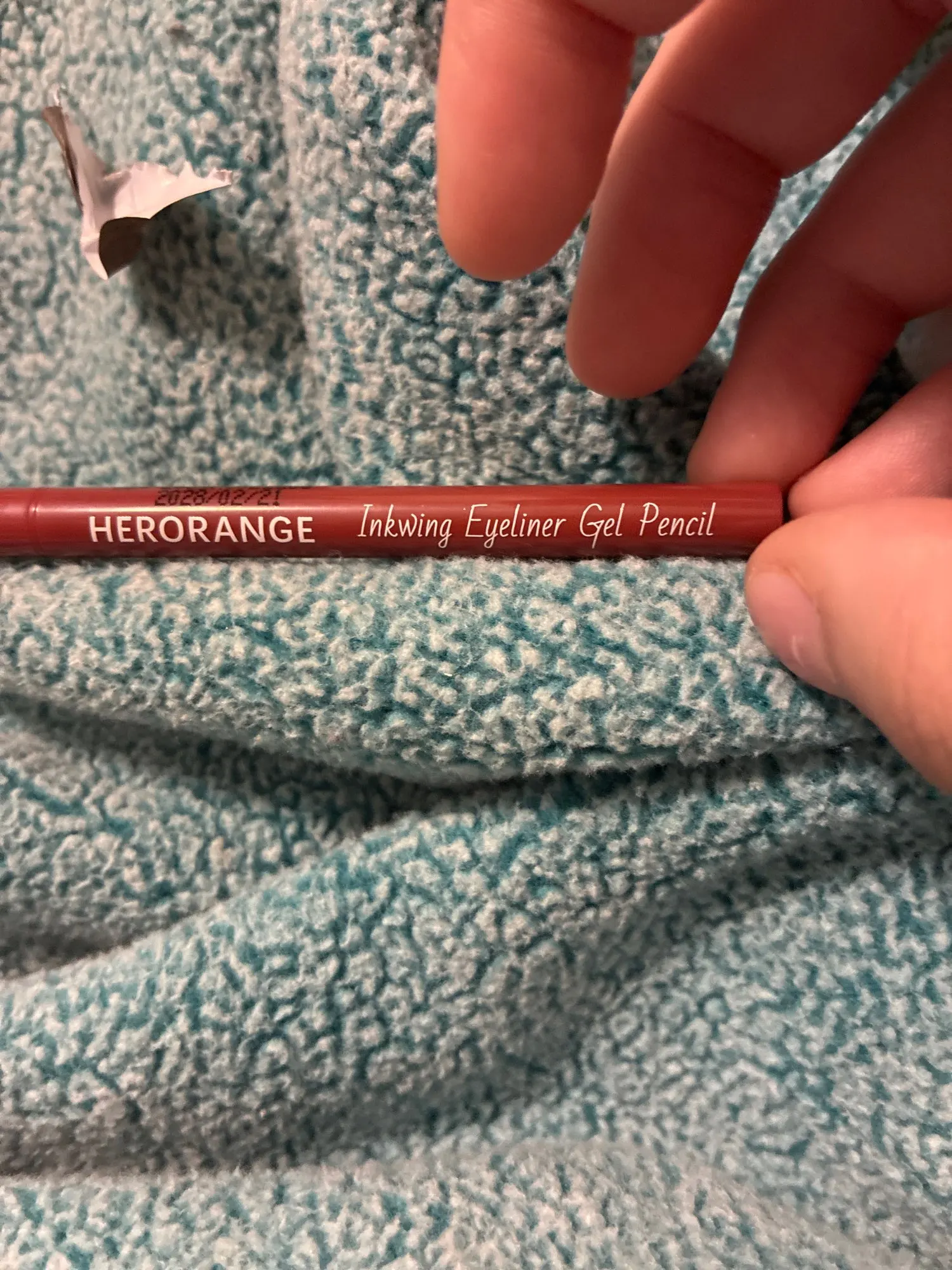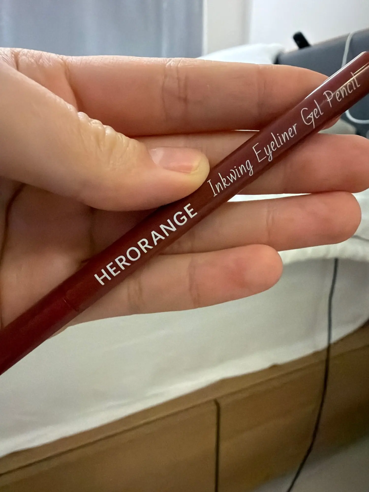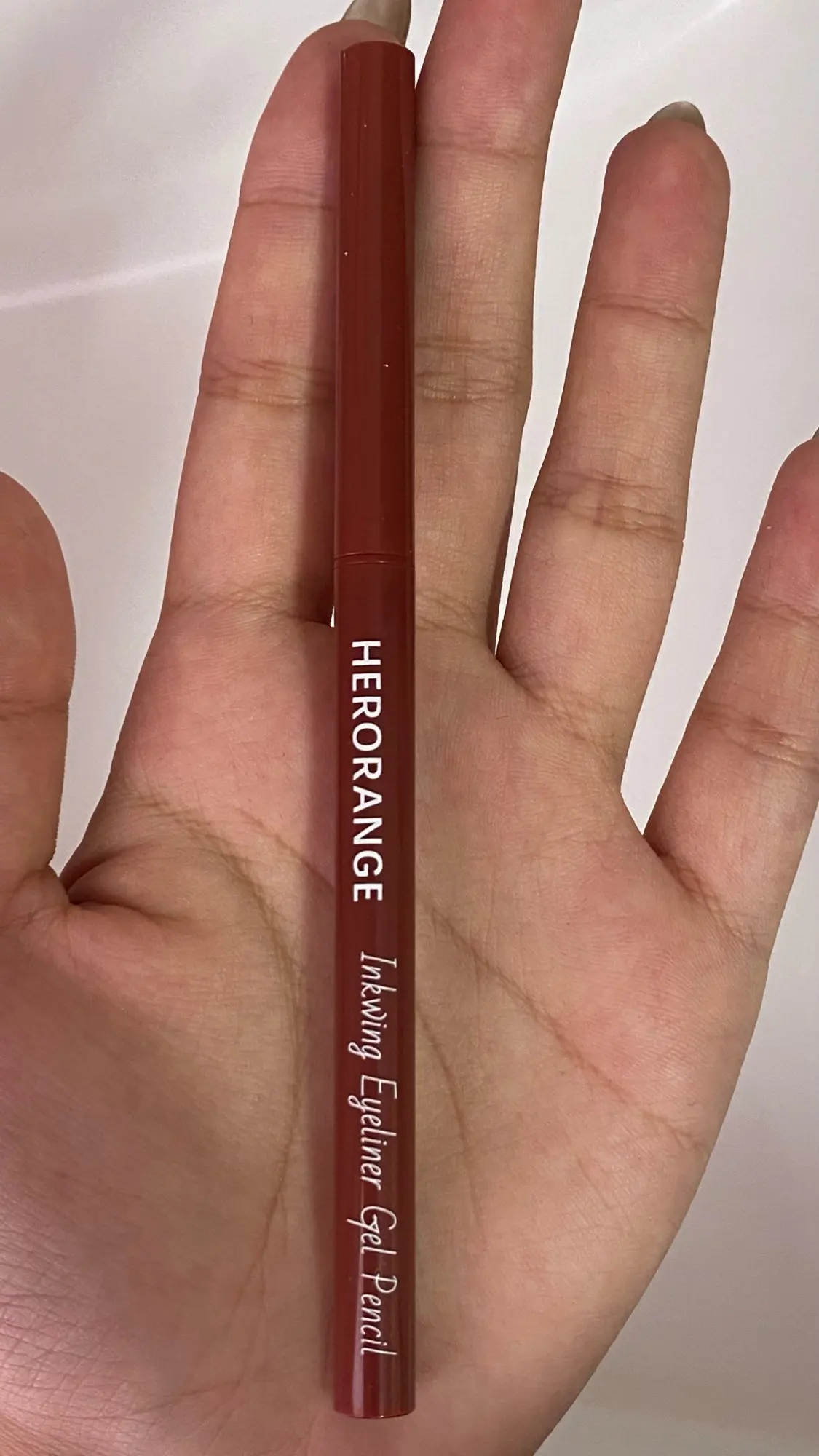 It's thin and has good color payoff. It's an orange-brown color that looks like a deep wine color.