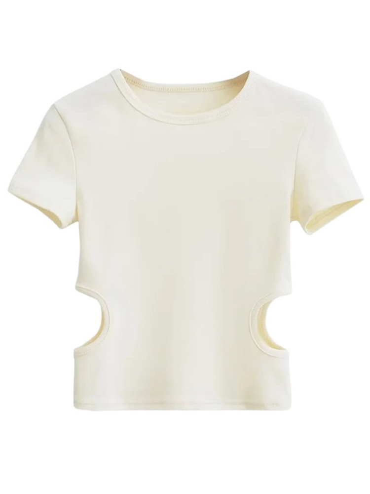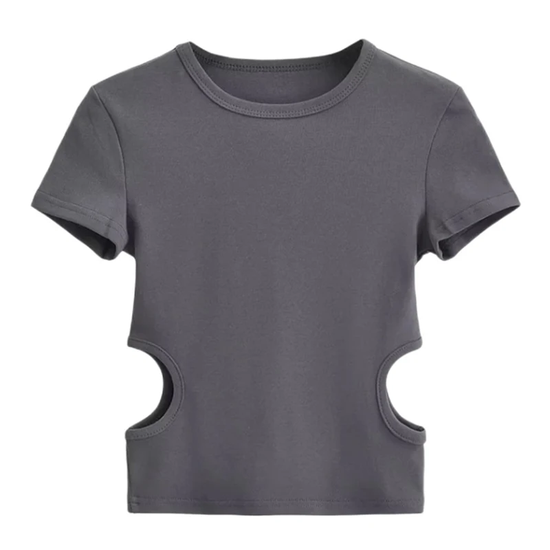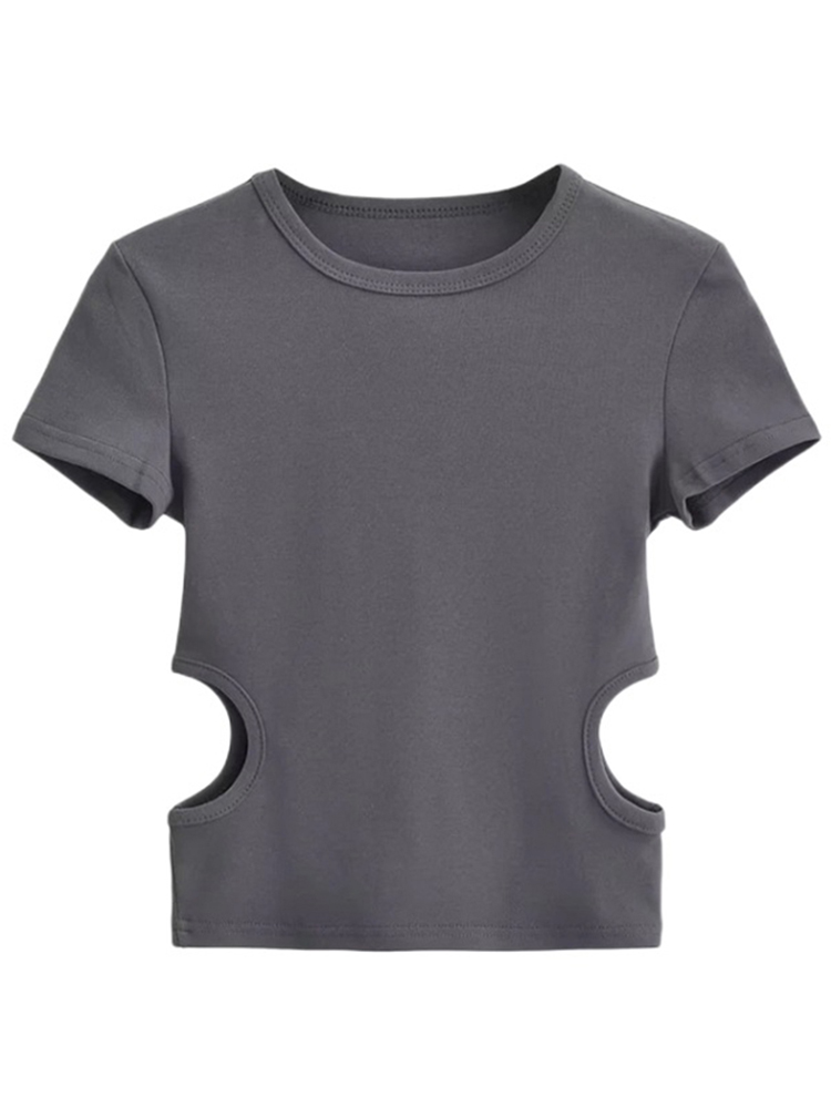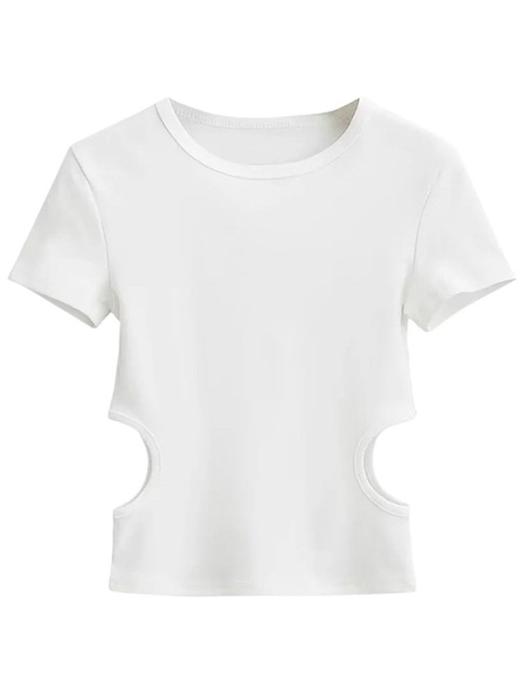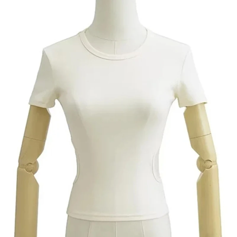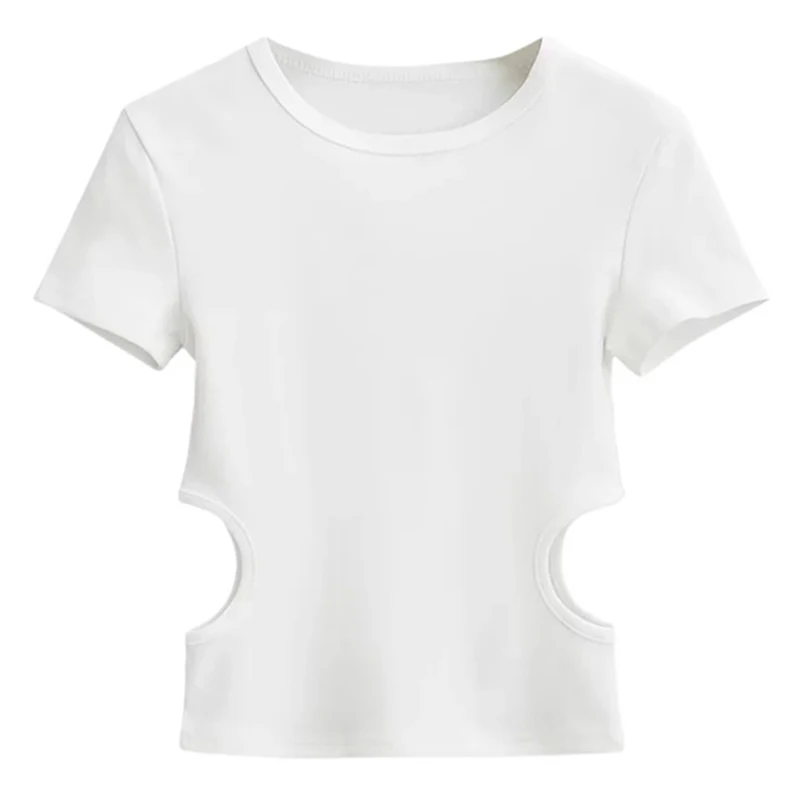 2023 Side Waist Off Short Top Women’s Round Neck Slim Fit Versatile Solid Color Short Sleeve T-shirt Summer