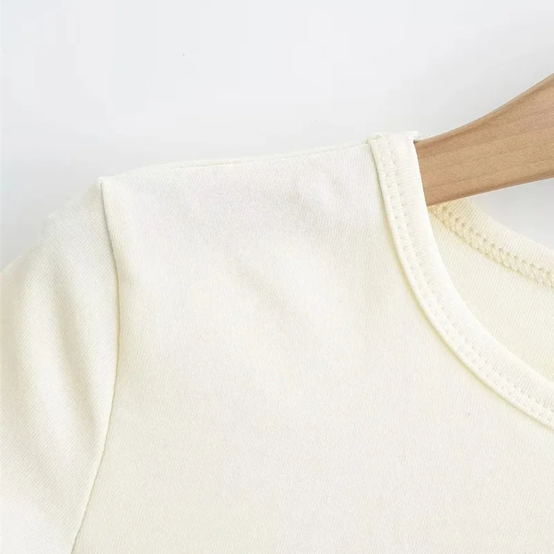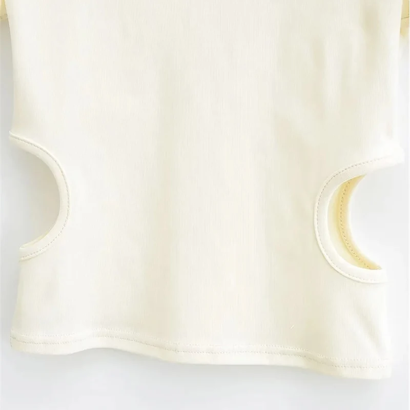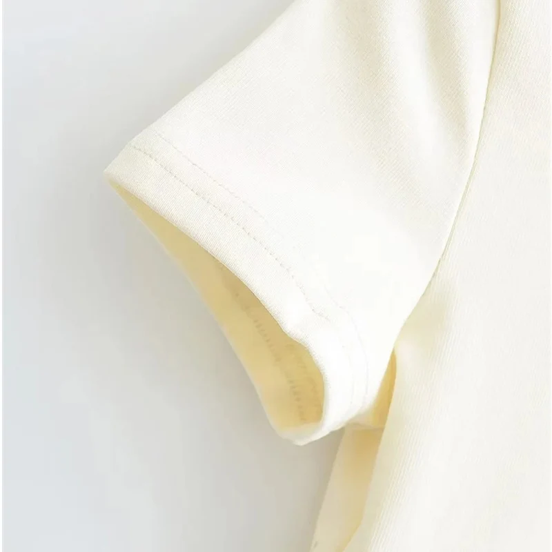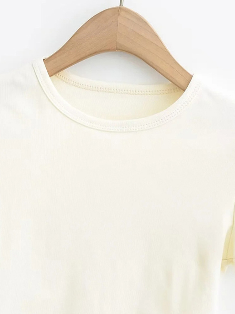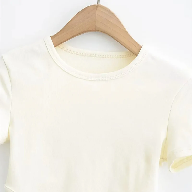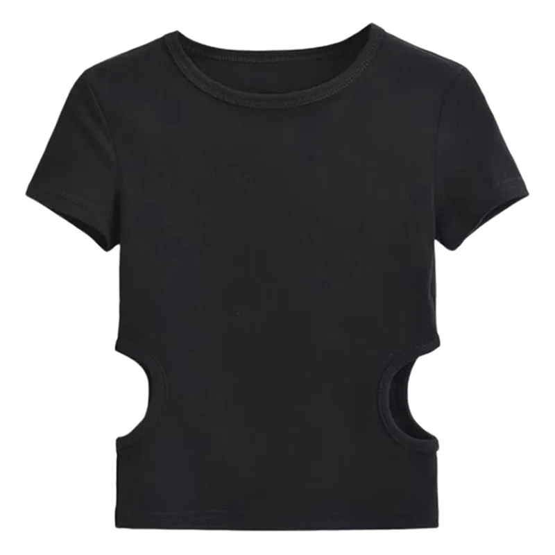 2023 Side Waist Off Short Top Women’s Round Neck Slim Fit Versatile Solid Color Short Sleeve T-shirt Summer