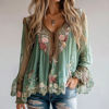 2025 Autumn New Women’s Blouse V-neck Long Sleeve Floral Print See-through Sleeves Shirt Splicing Asymmetrical Hem Loose Blouse