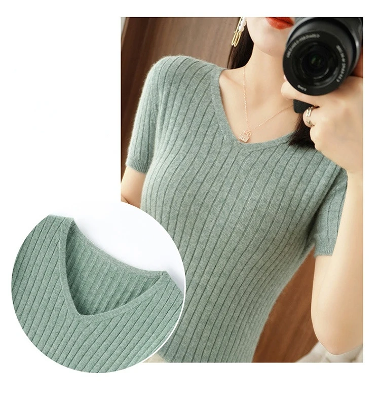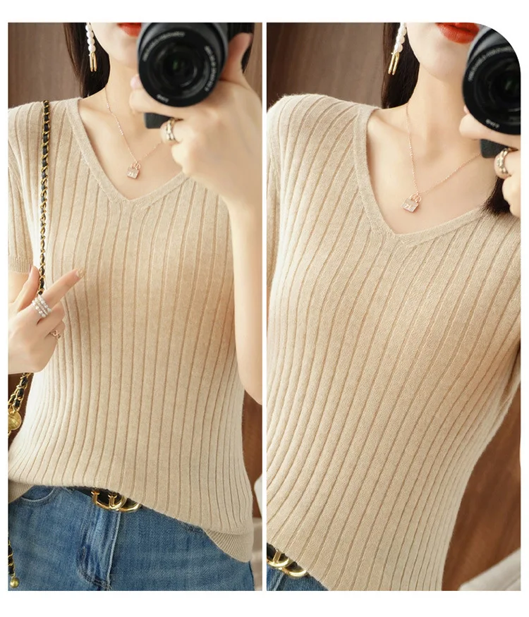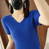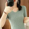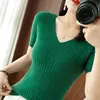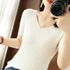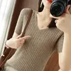 2025 Spring Summer Women Sweater V-neck Short Sleeve Tshirt Korean Fashion Knitwears Slim Fit Pullovers Bottoming Inner Knit Top