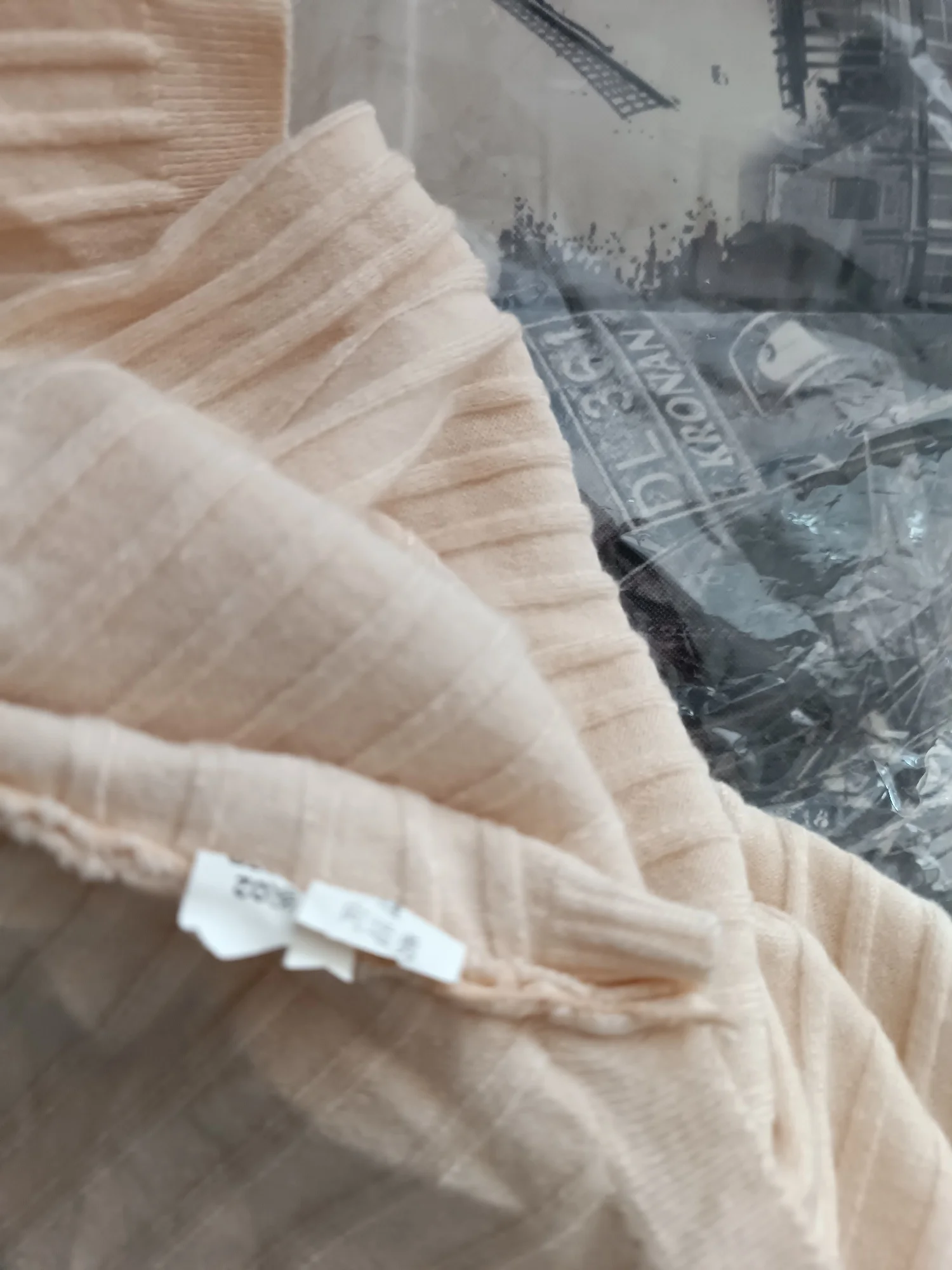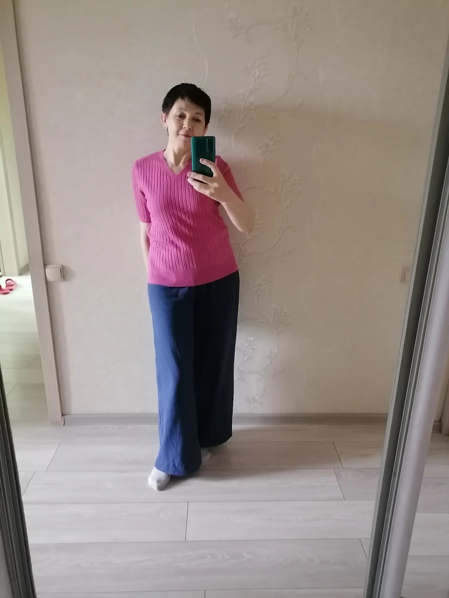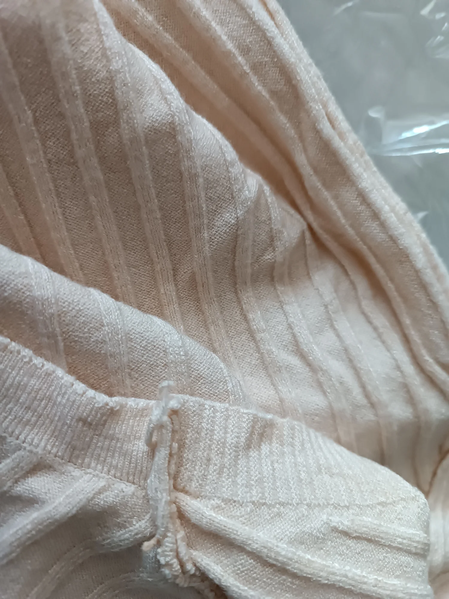 The size matches. Fits comfortably on a chest measurement of 105 cm and waist measurement of 80 cm. The labels are cut off, it feels like acrylic rather than cotton. The weave is dense with some elasticity. I think up to size 52 in Russian will be fine. For short stature, it almost reaches mid-thigh, so it will also fit tall individuals. The color is peachy, pleasant. The stitching isn't very good.