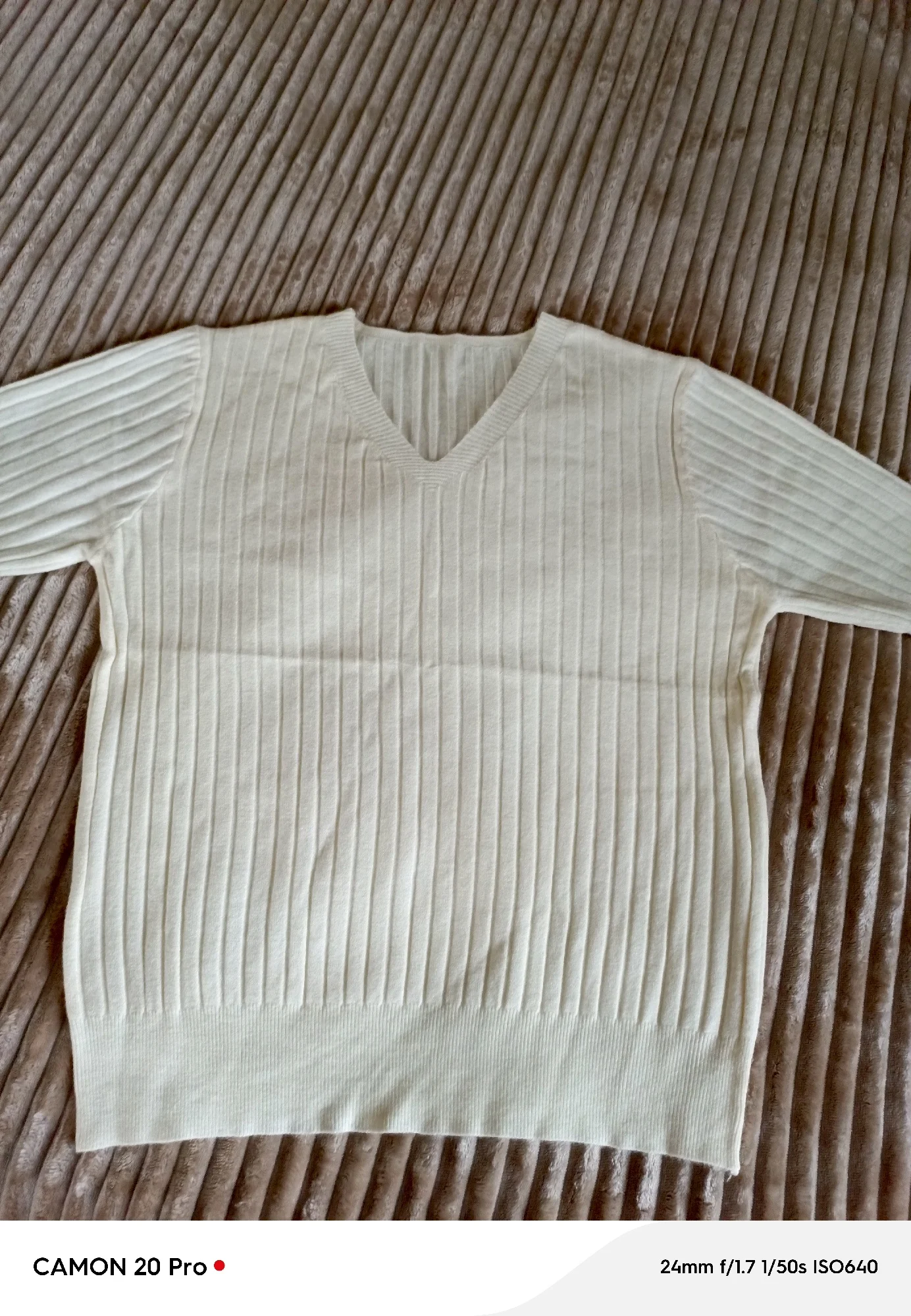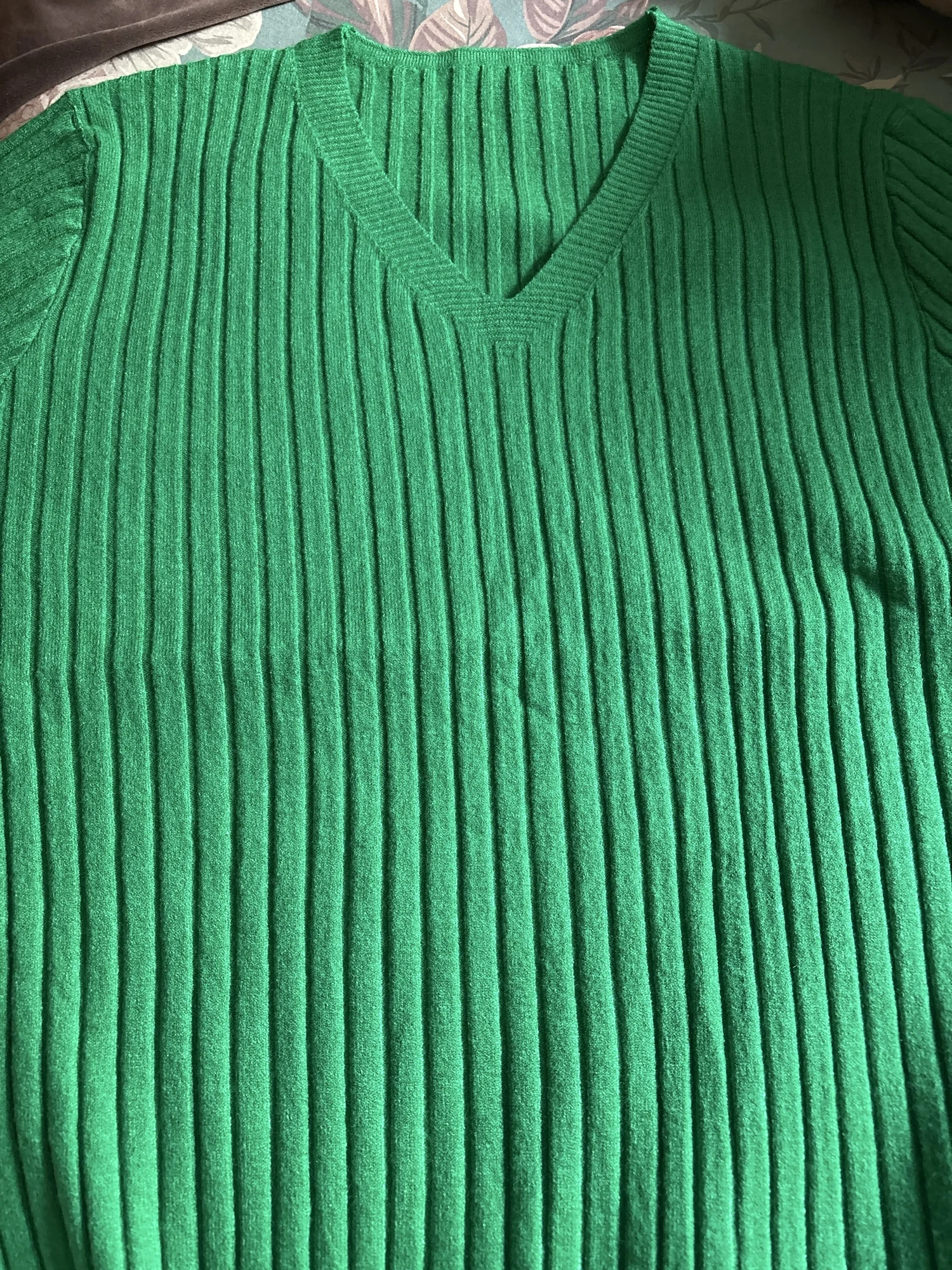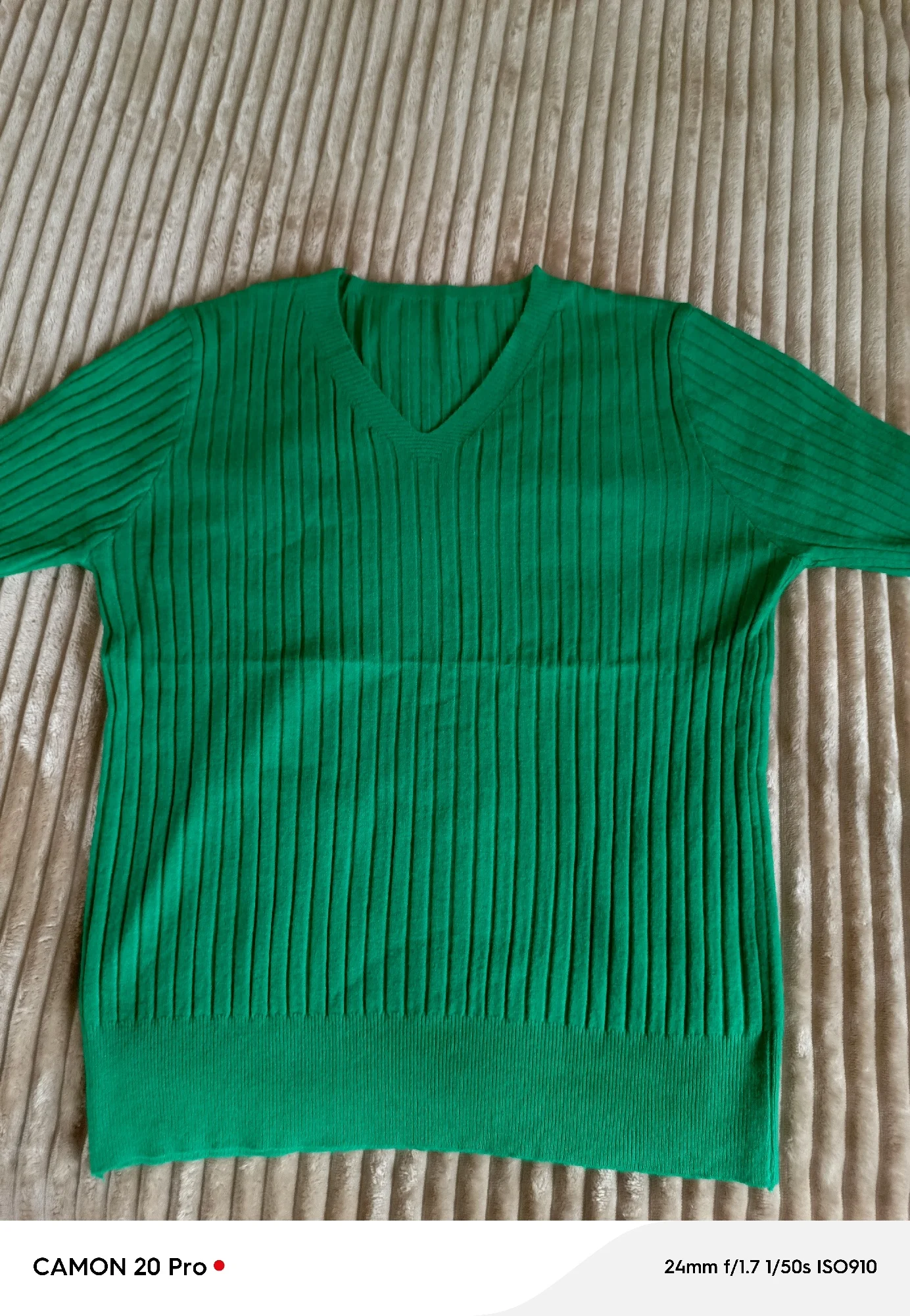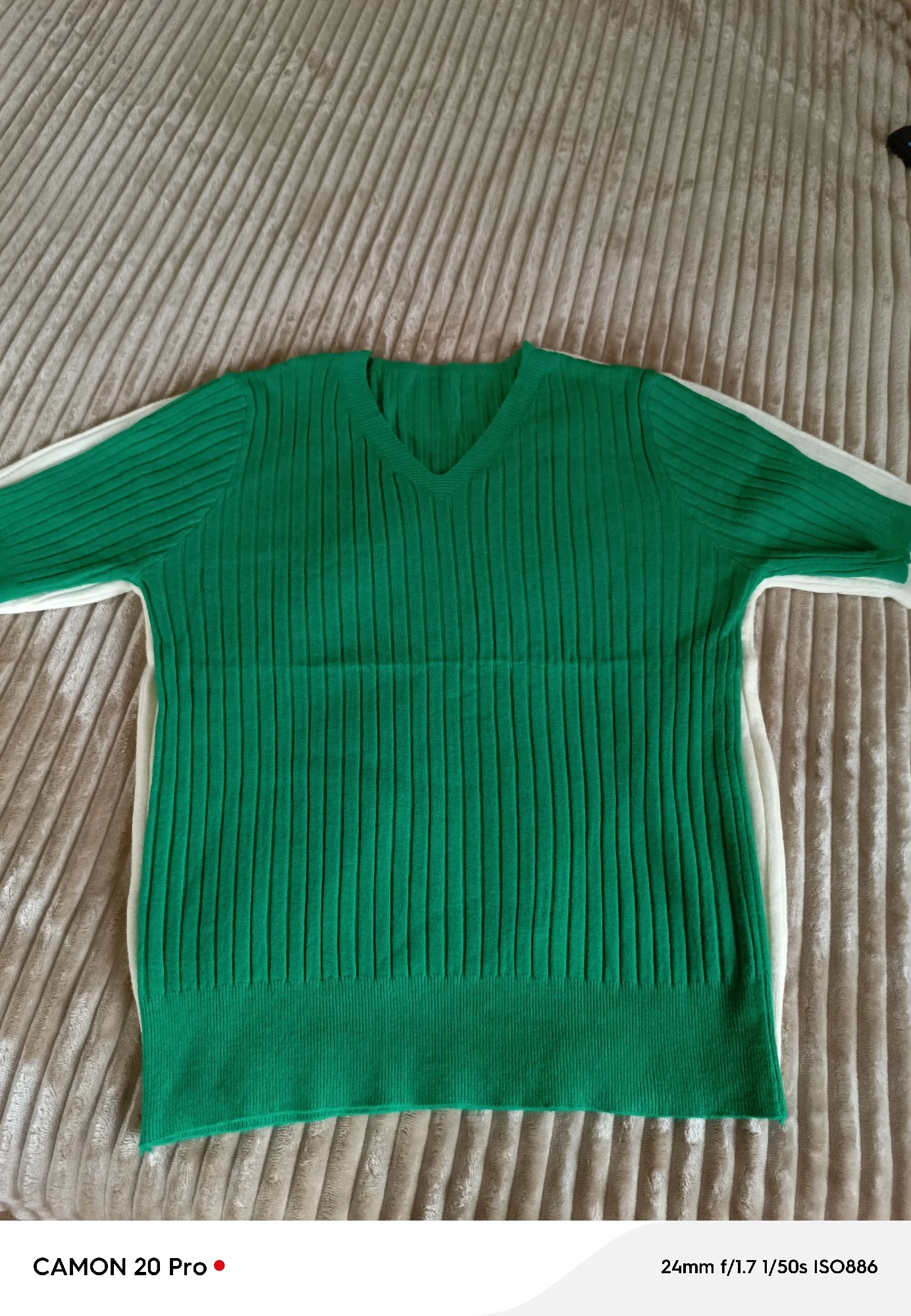 The size matches. Fits comfortably on a chest measurement of 105 cm and waist measurement of 80 cm. The labels are cut off, it feels like acrylic rather than cotton. The weave is dense with some elasticity. I think up to size 52 in Russian will be fine. For short stature, it almost reaches mid-thigh, so it will also fit tall individuals. The color is peachy, pleasant. The stitching isn't very good.