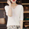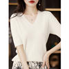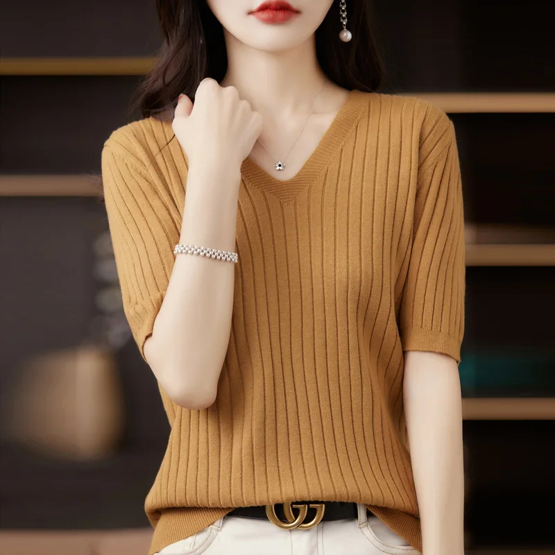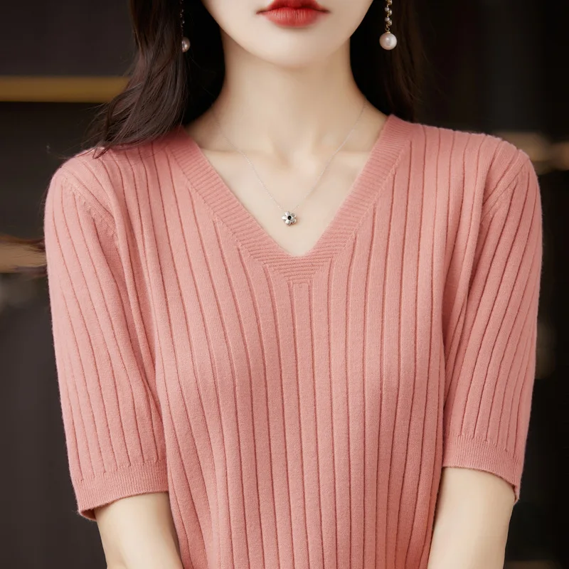 2025 Women Sweater Short Sleeve Spring Summer Knitwears Korean Fashion Stripe Pullovers Slim Fit Knit Tops Casual V-neck Jumpers