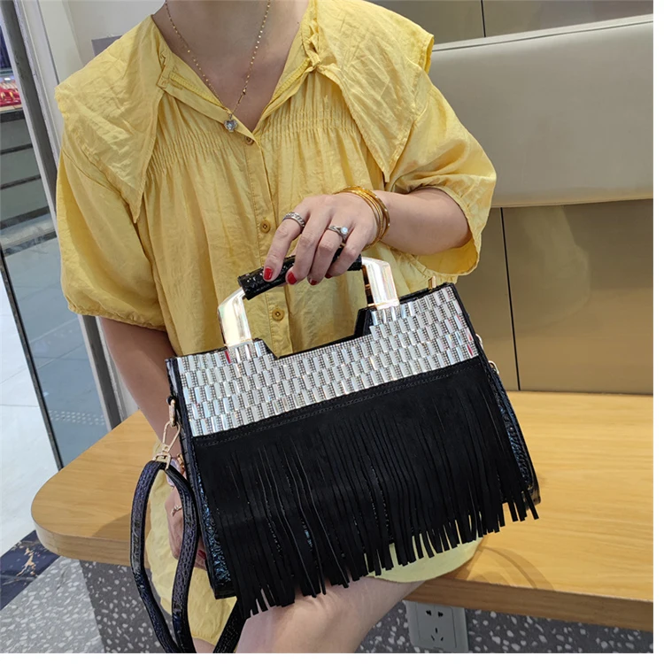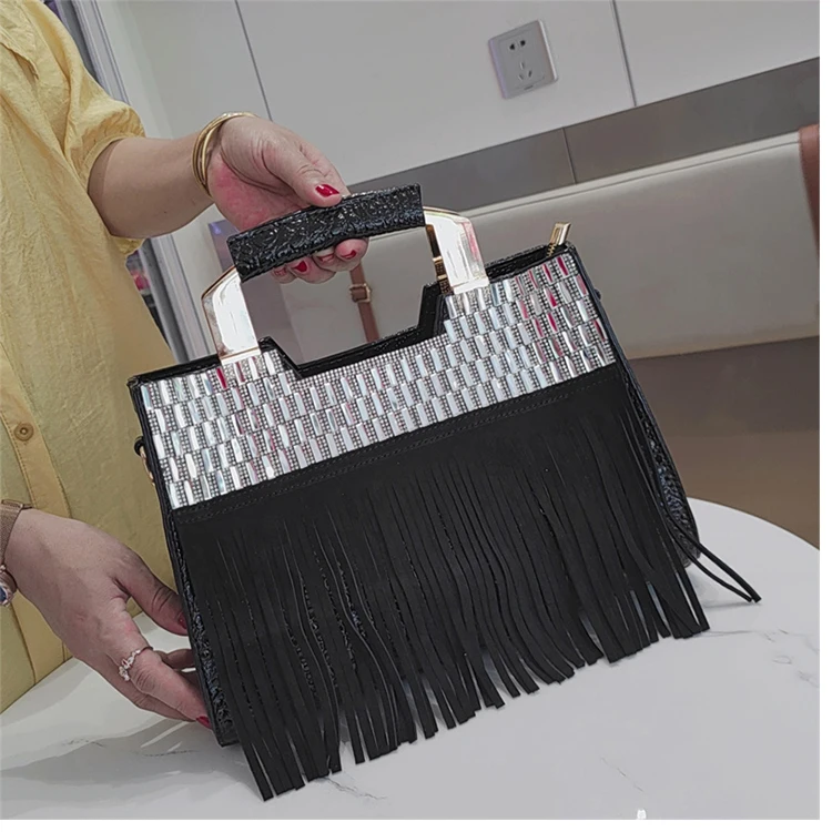 Genuine Leather Portable Women Bag 2023 Luxury Fashion Diamonds Lady Handbags Cowhide Tassel Rhinestone Shoulder Crossbody Bags
