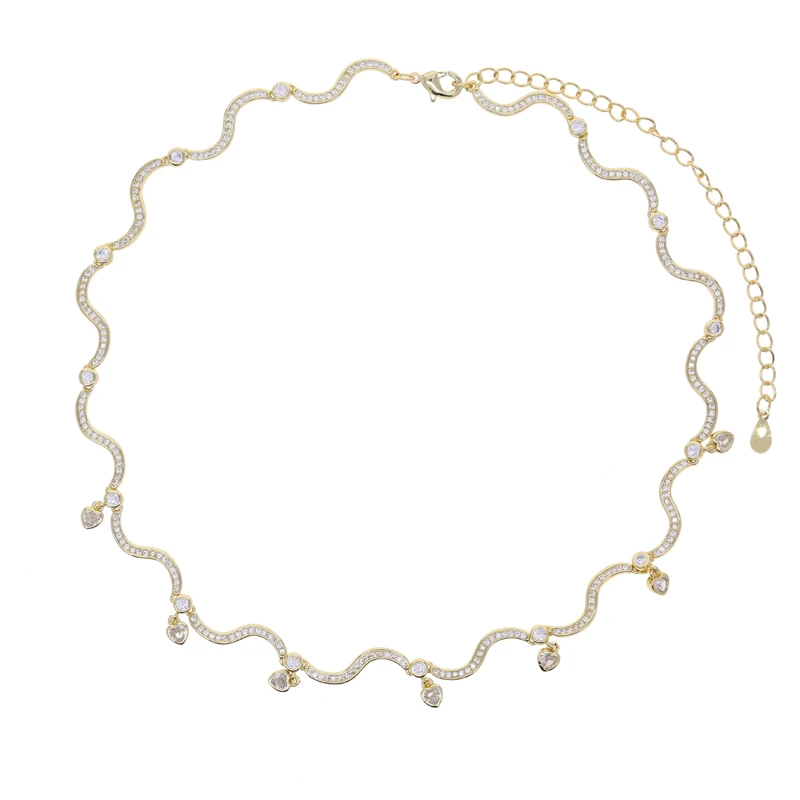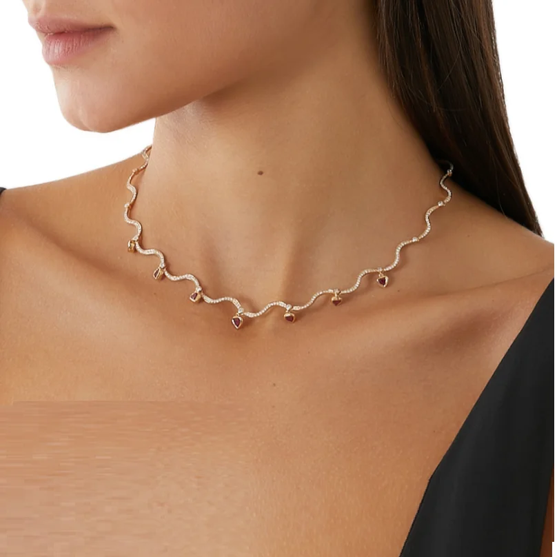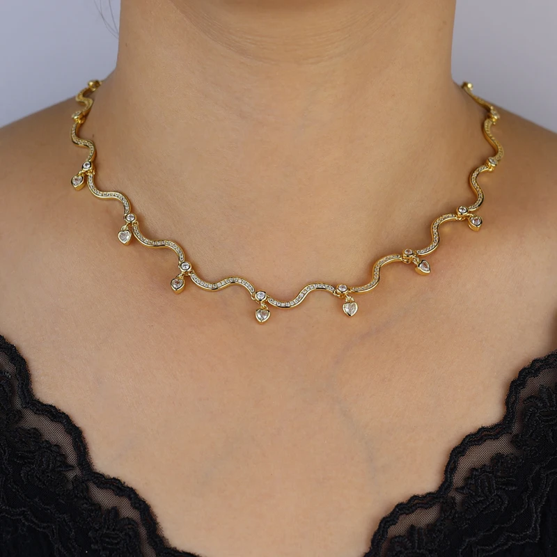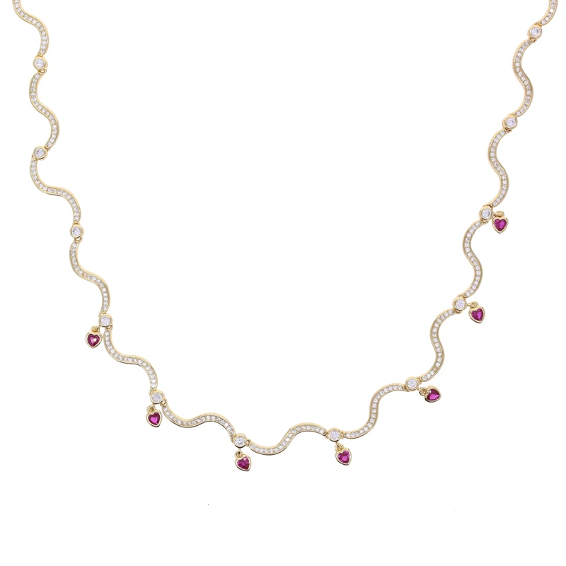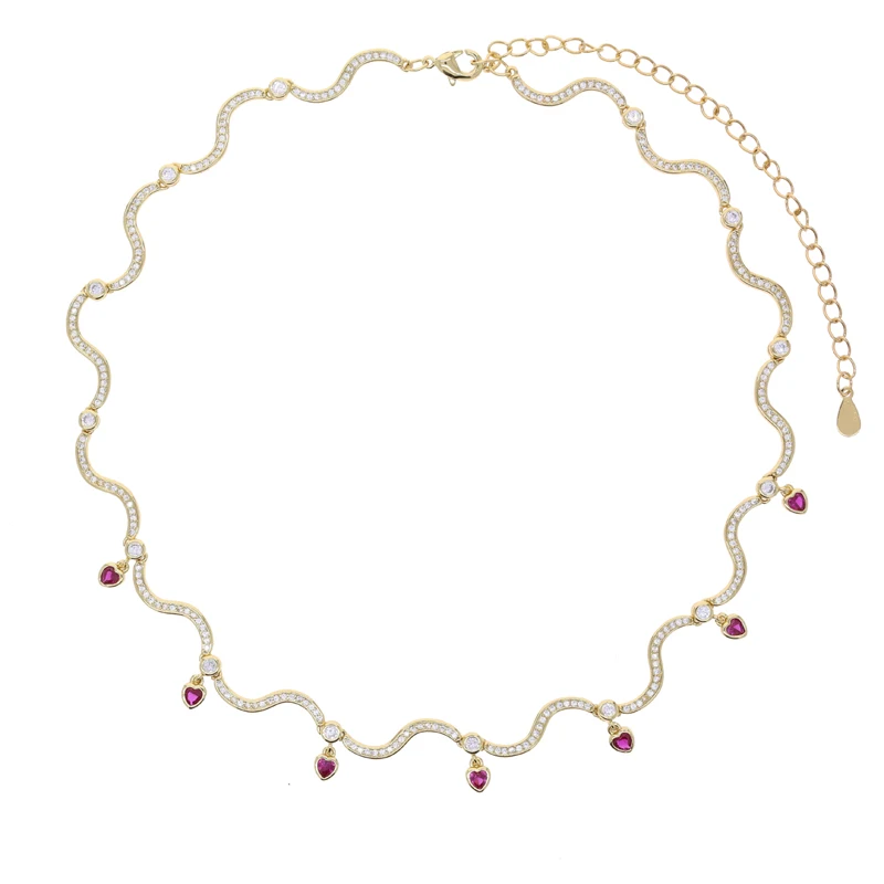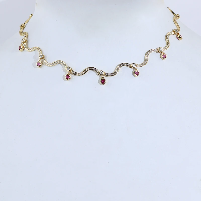 2026 New Micro Paved CZ Wave Link Chain Bezel White Red Heart Shaped Charm Tassel Choker Women Necklace