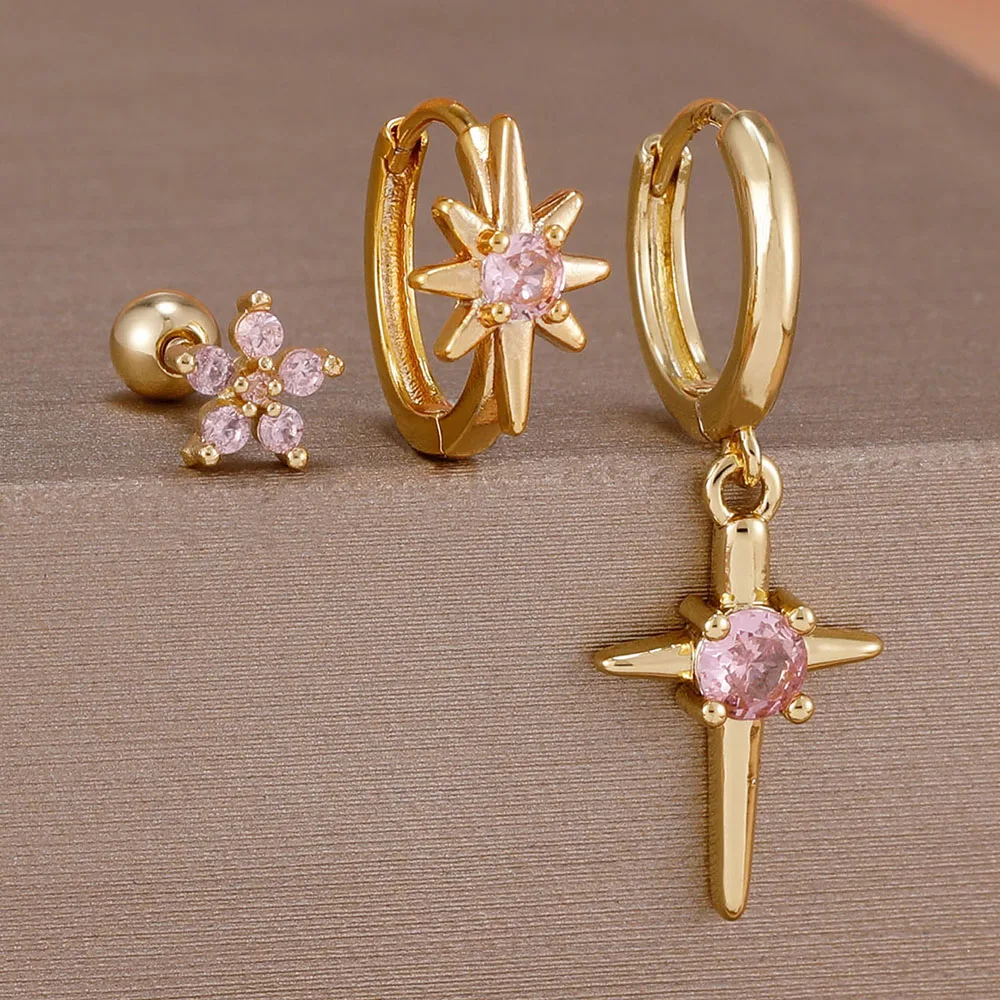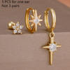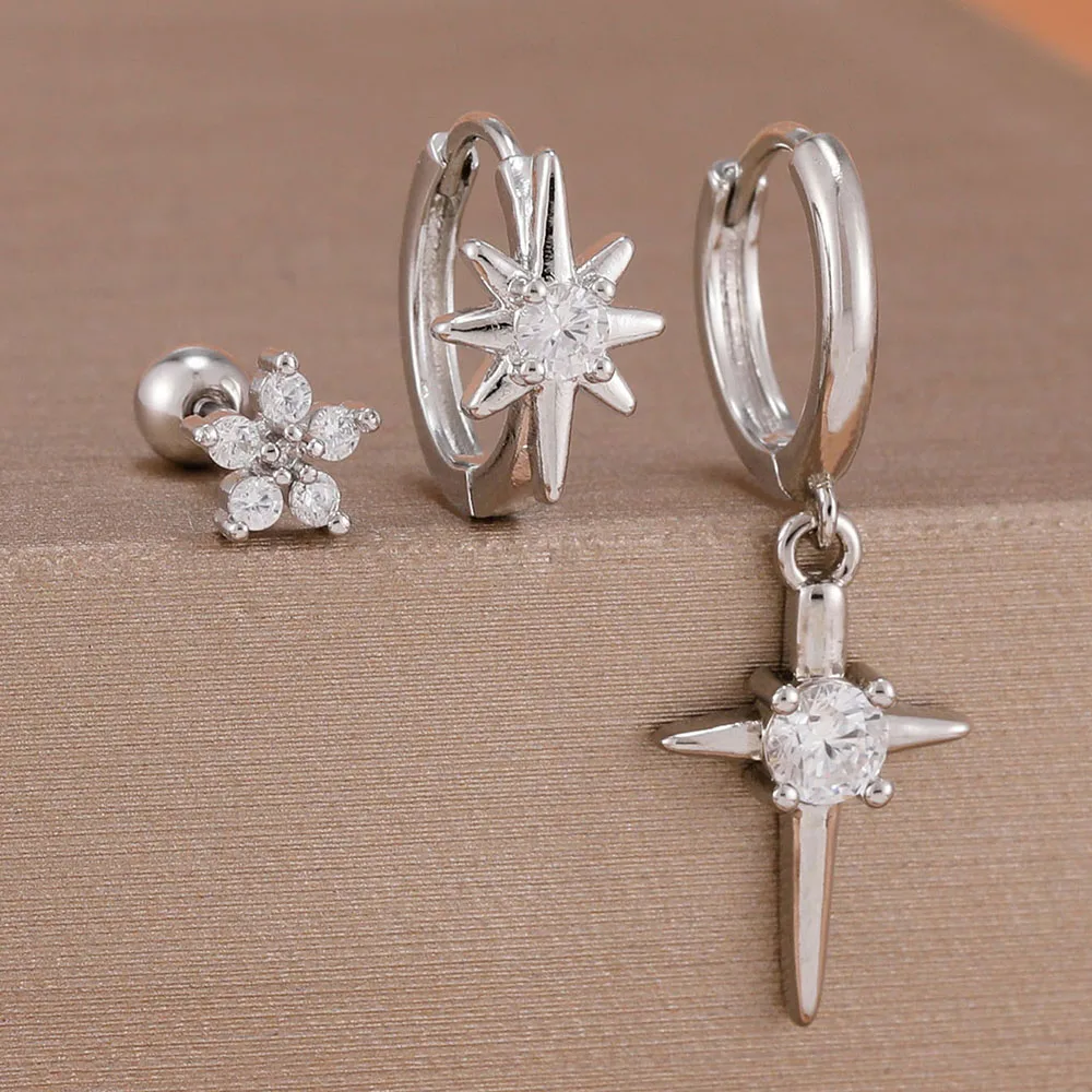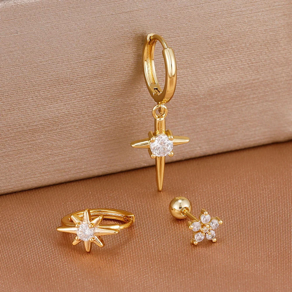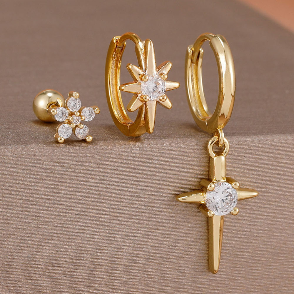 3 PCS Fashion Stainless Steel Star Cross Hoop Earrings Set for Women 14K Gold Plated Shiny Zircon Punk Unisex Rock Earring