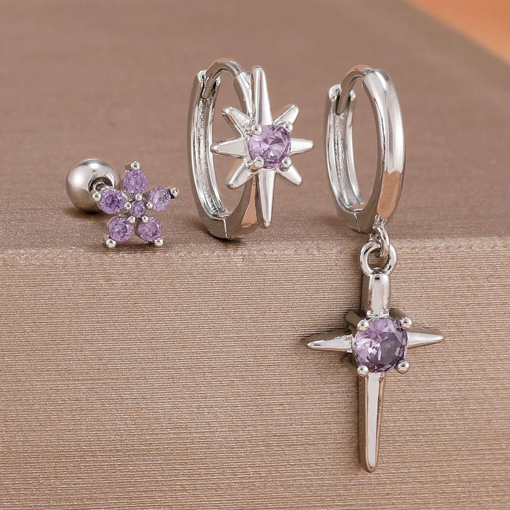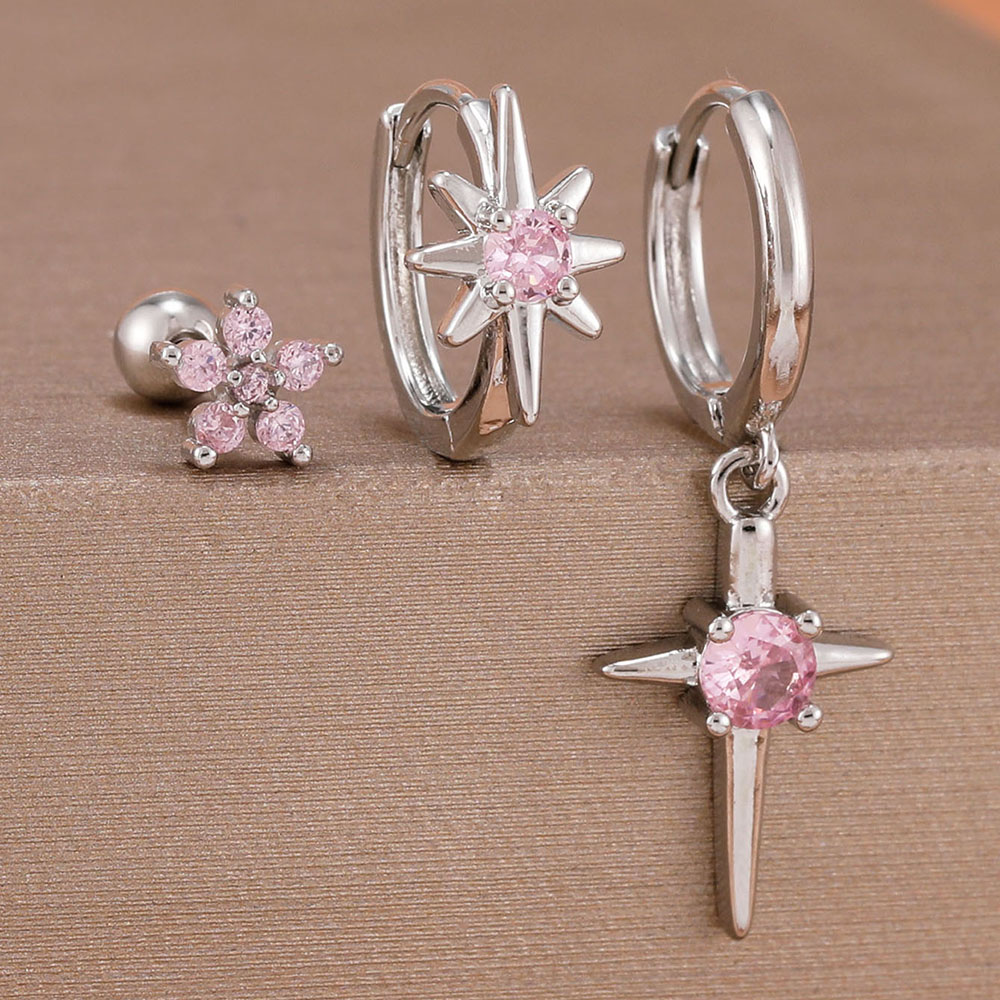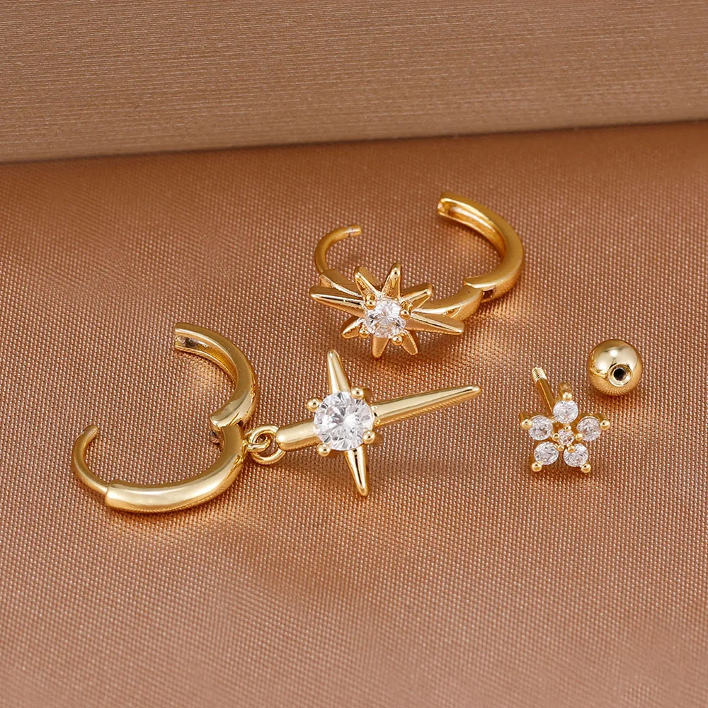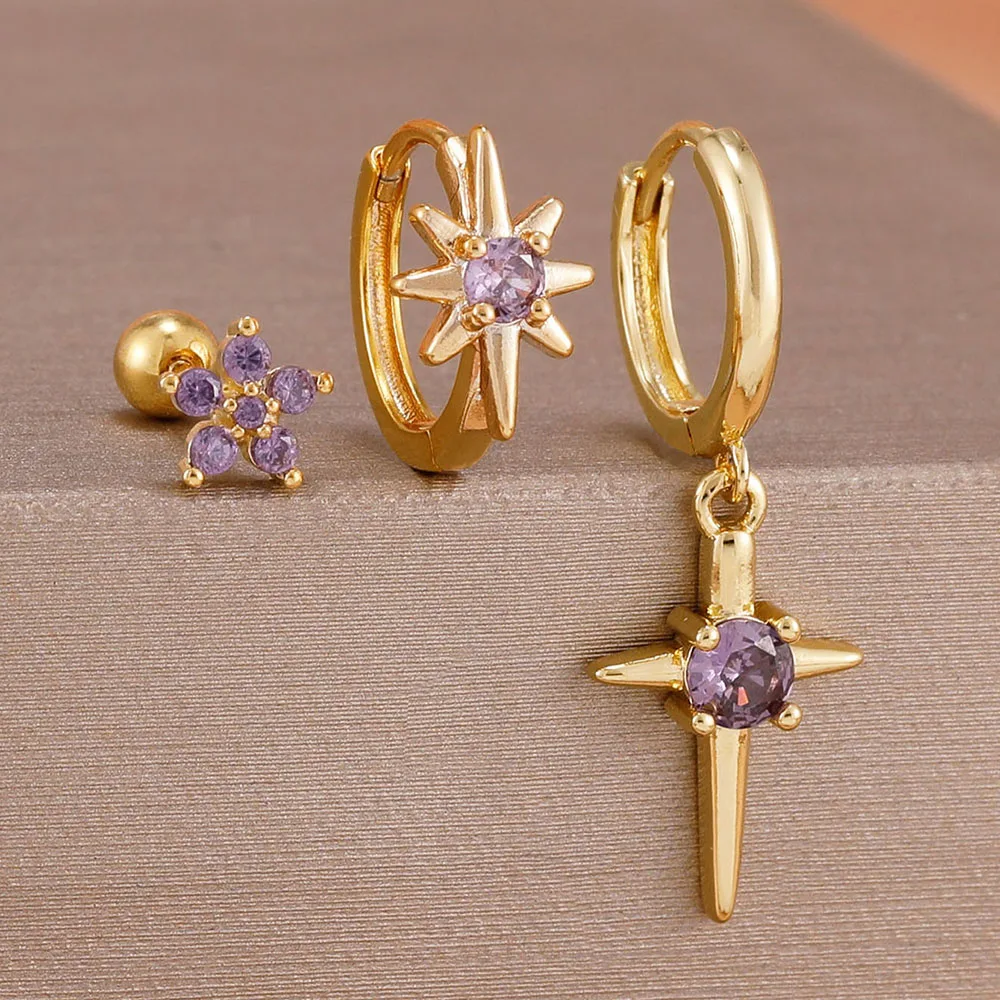3 PCS Fashion Stainless Steel Star Cross Hoop Earrings Set for Women 14K Gold Plated Shiny Zircon Punk Unisex Rock Earring