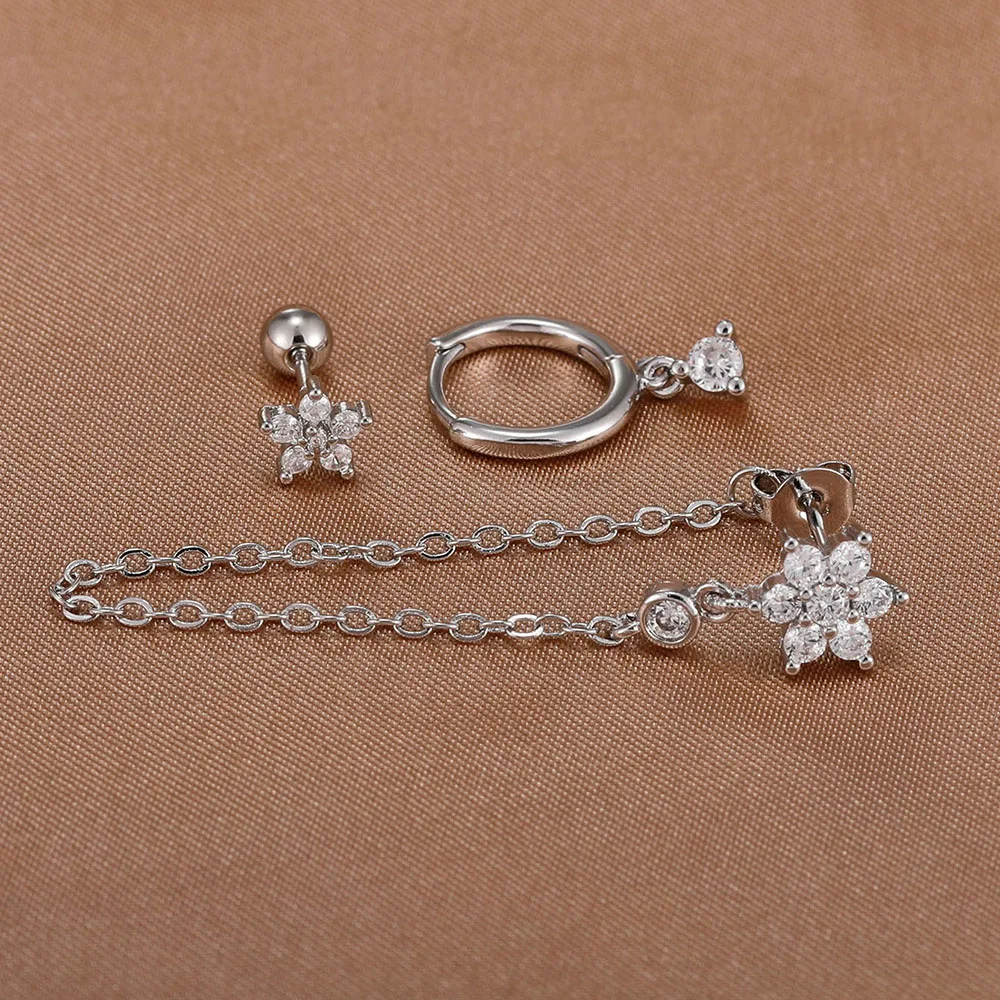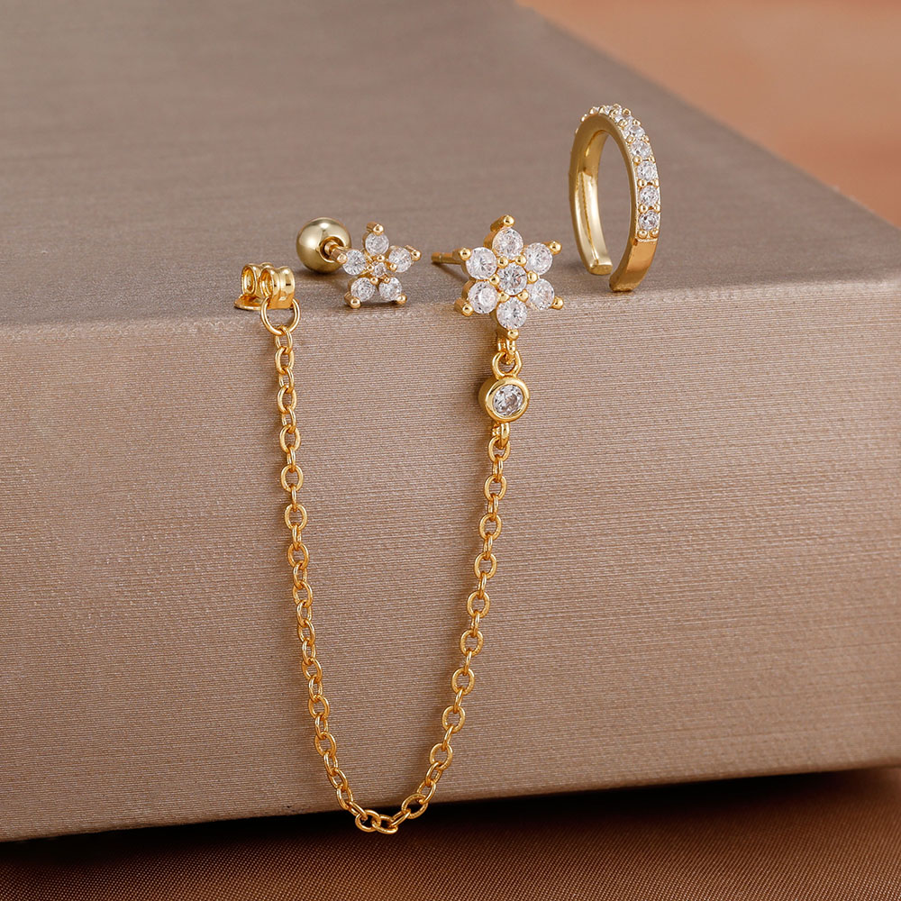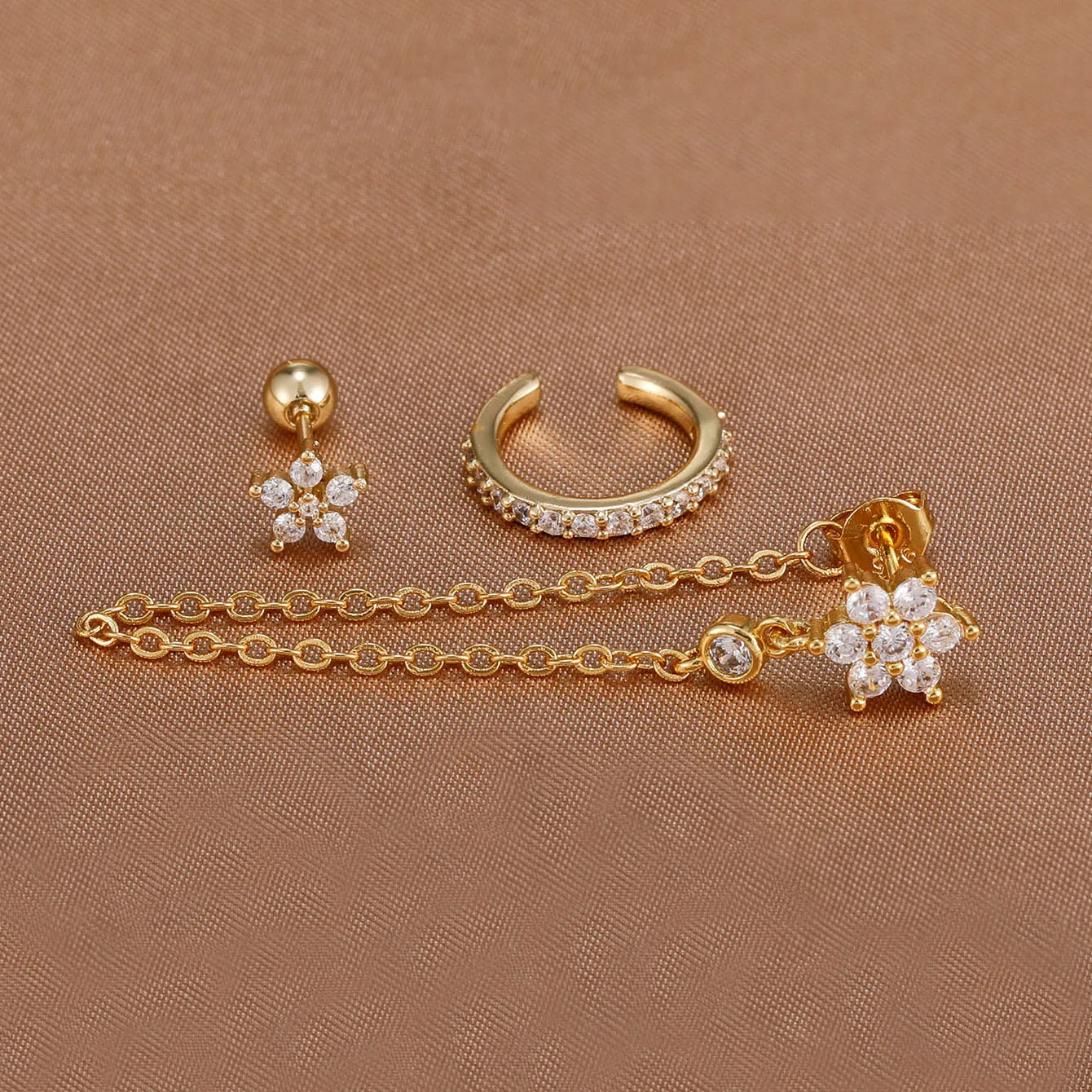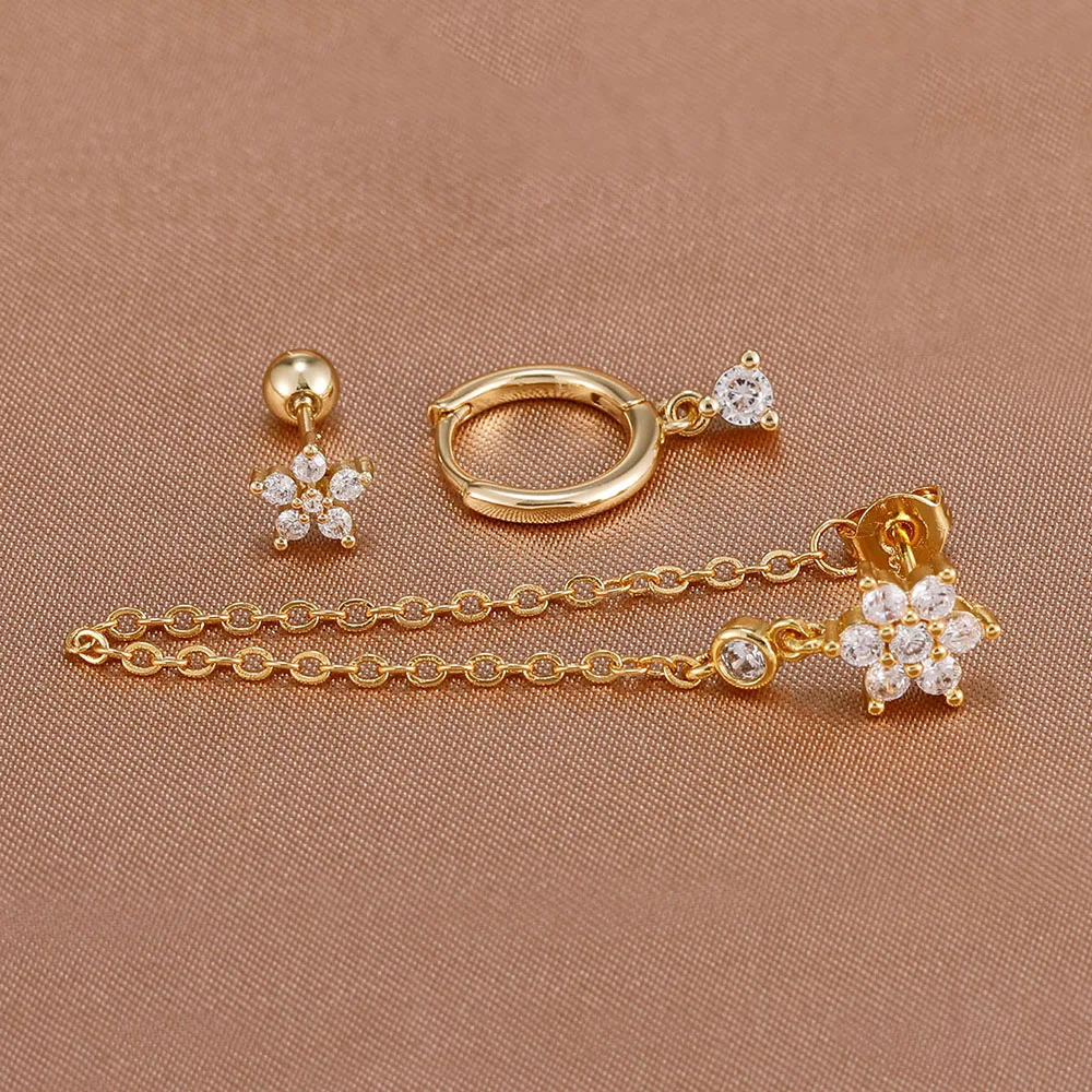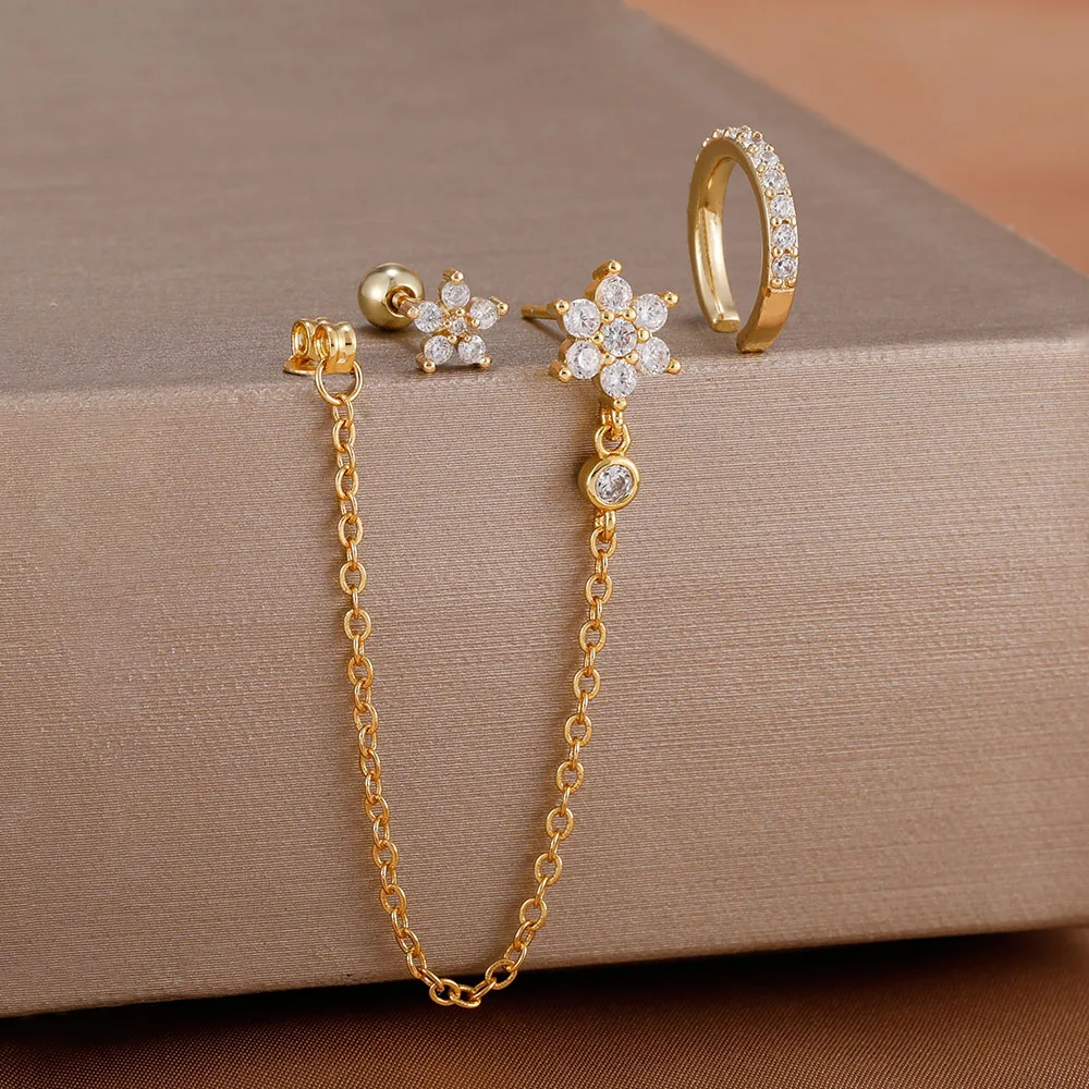 3PCS Cute Delicate Crystal Two Flower Earrings Set For Women 14K Gold Plated Stainless Steel Chain Ear Stud Piercing Jewelry