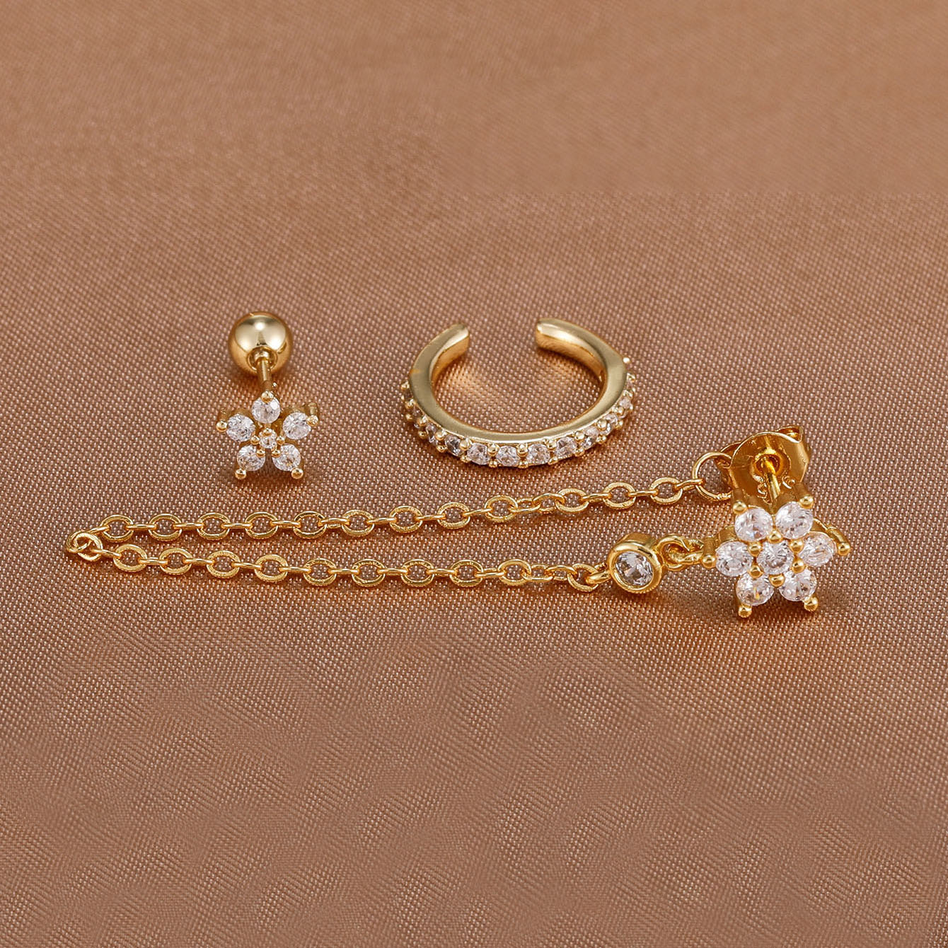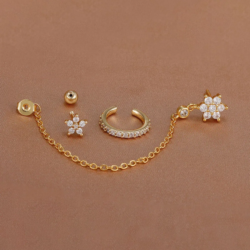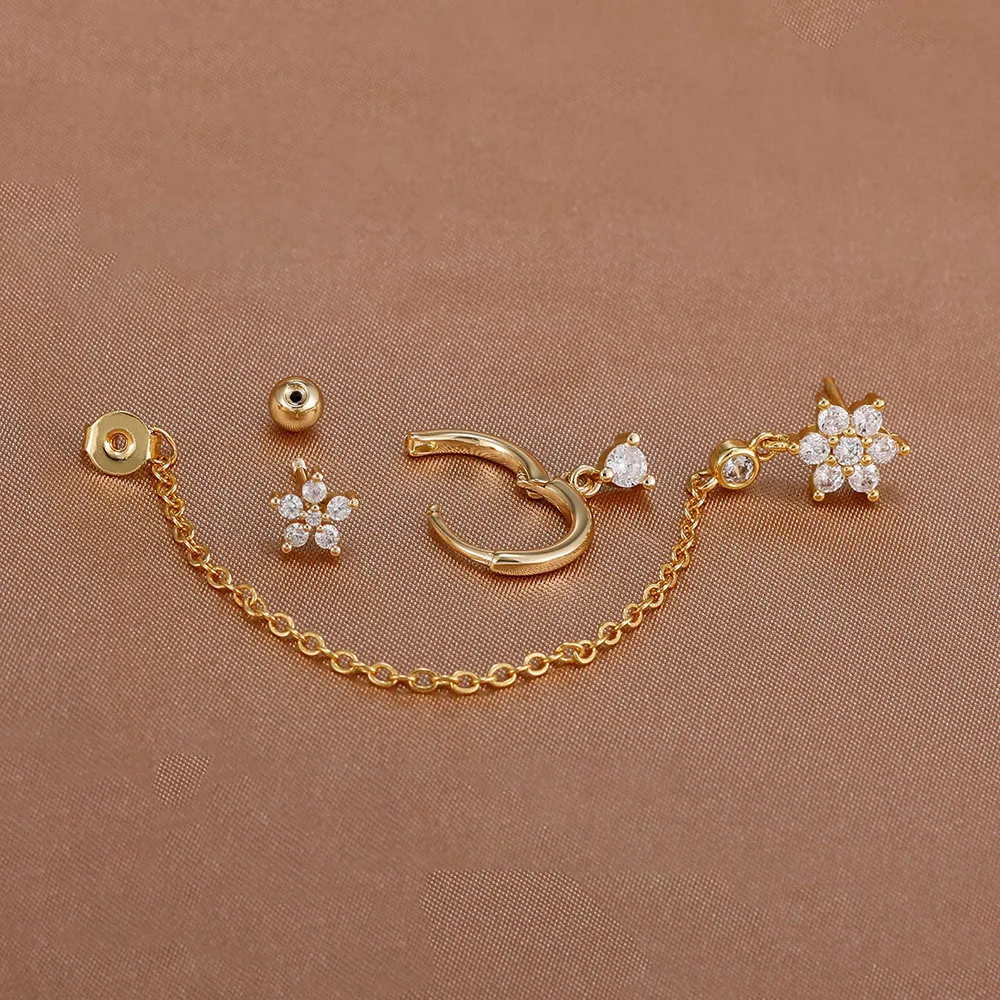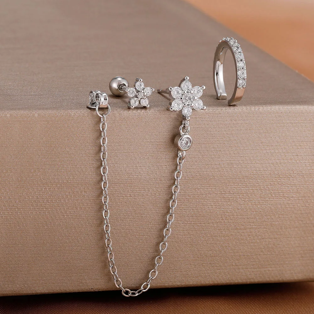 3PCS Cute Delicate Crystal Two Flower Earrings Set For Women 14K Gold Plated Stainless Steel Chain Ear Stud Piercing Jewelry
