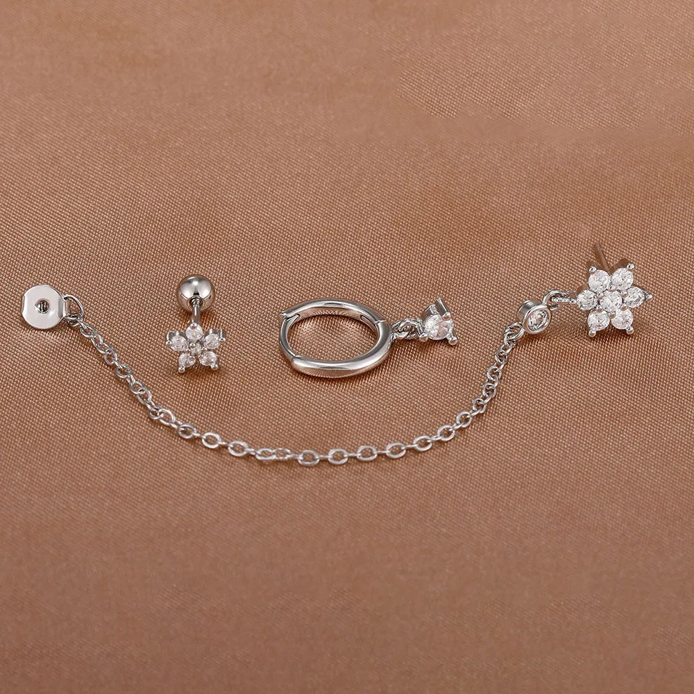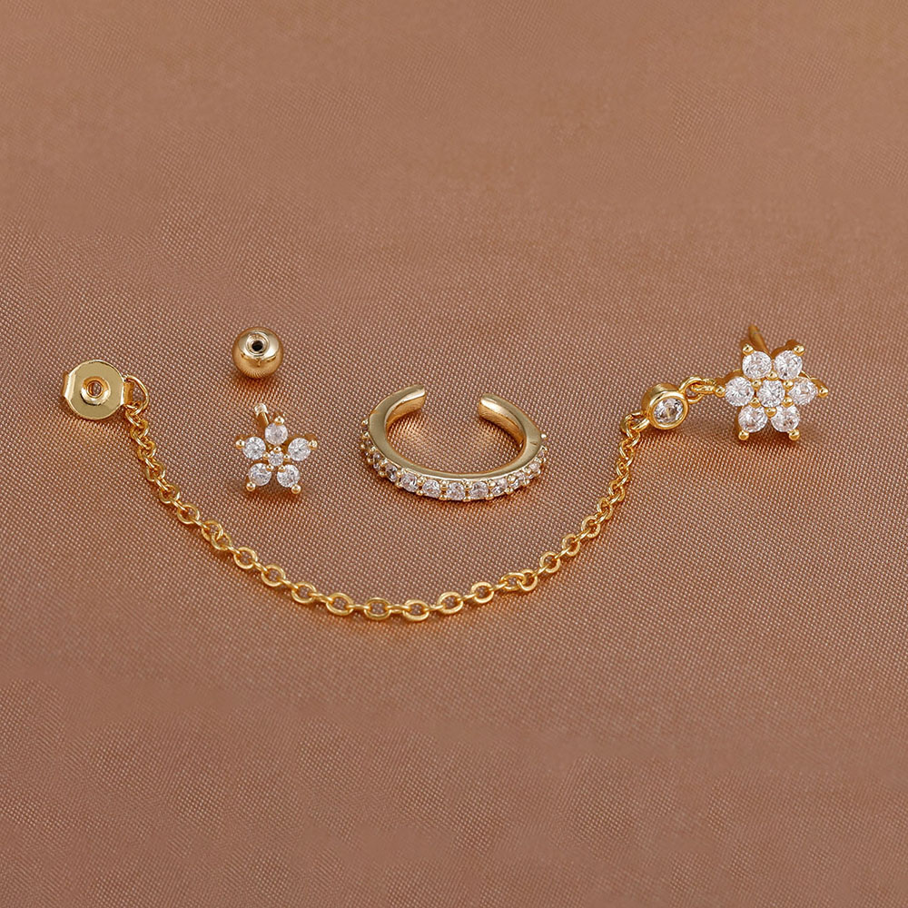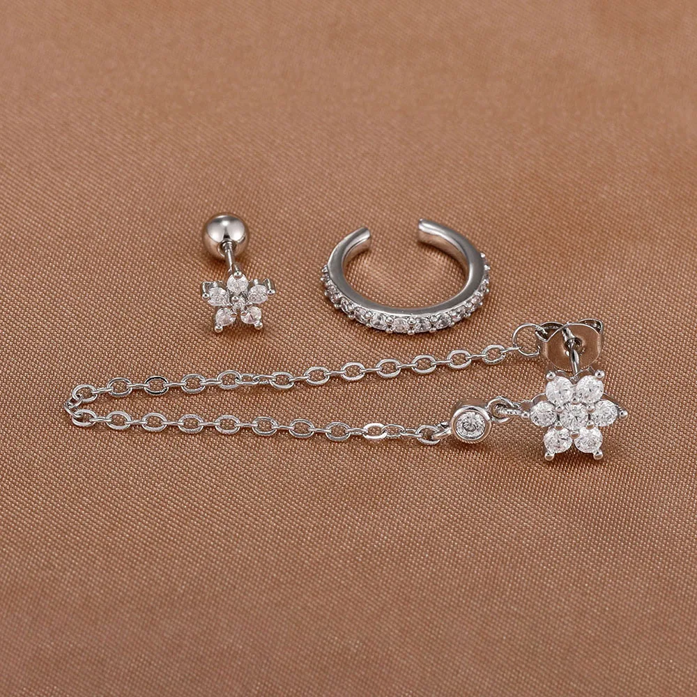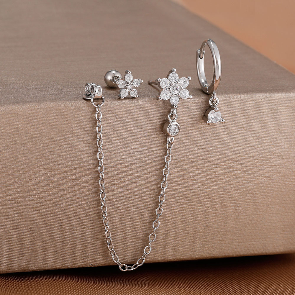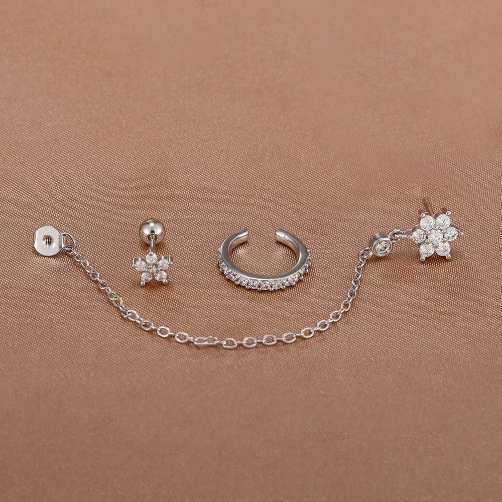 3PCS Cute Delicate Crystal Two Flower Earrings Set For Women 14K Gold Plated Stainless Steel Chain Ear Stud Piercing Jewelry