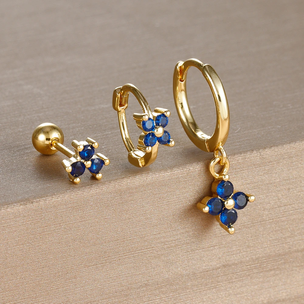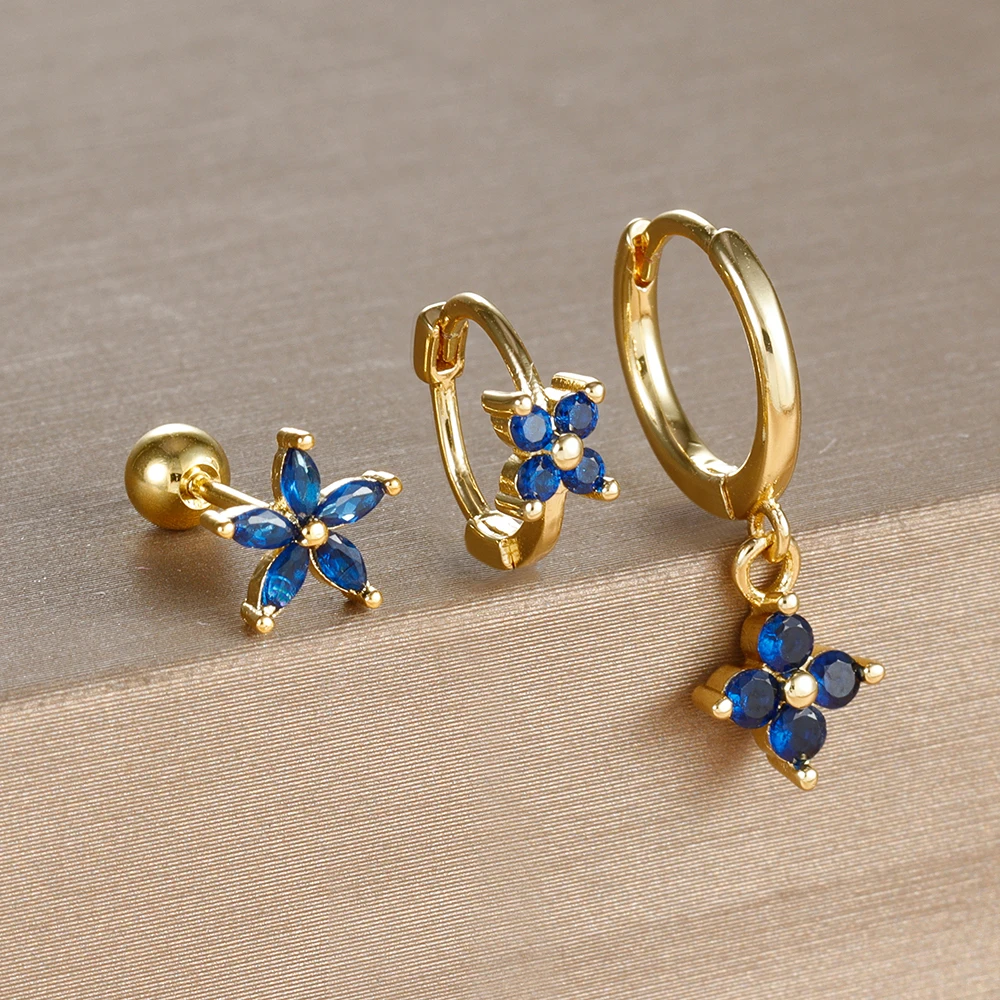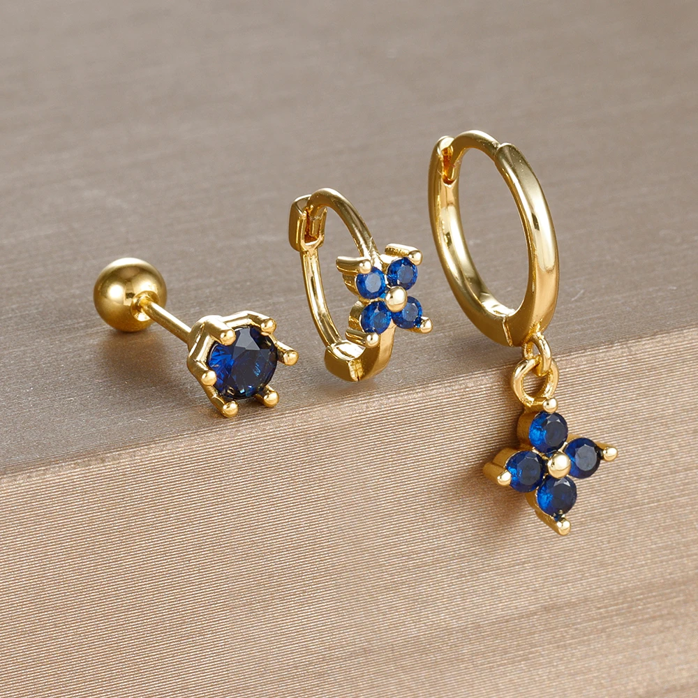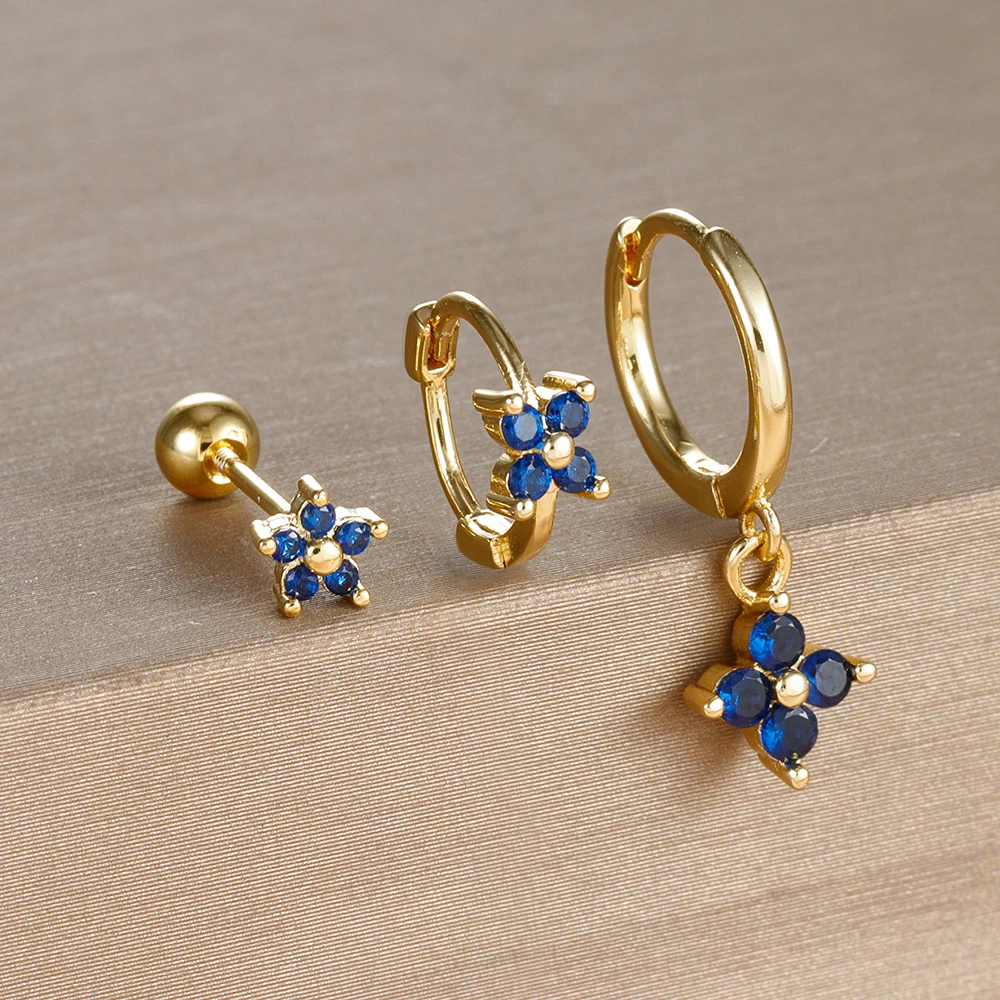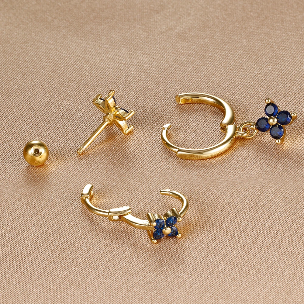3PCS Dainty Flower Stainless Steel Blue Four Zircons Small Hoop Earrings Set For Women Tragus Helix Cartilage Piercing Jewelry