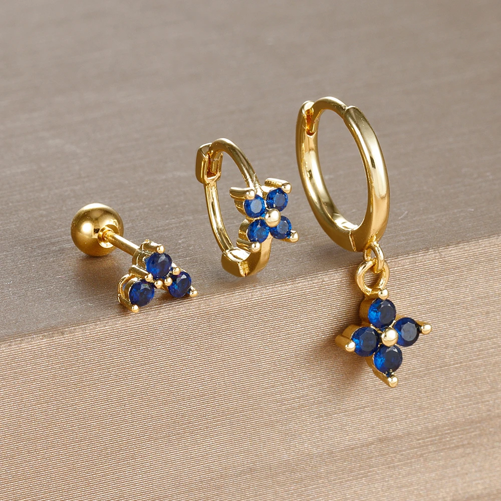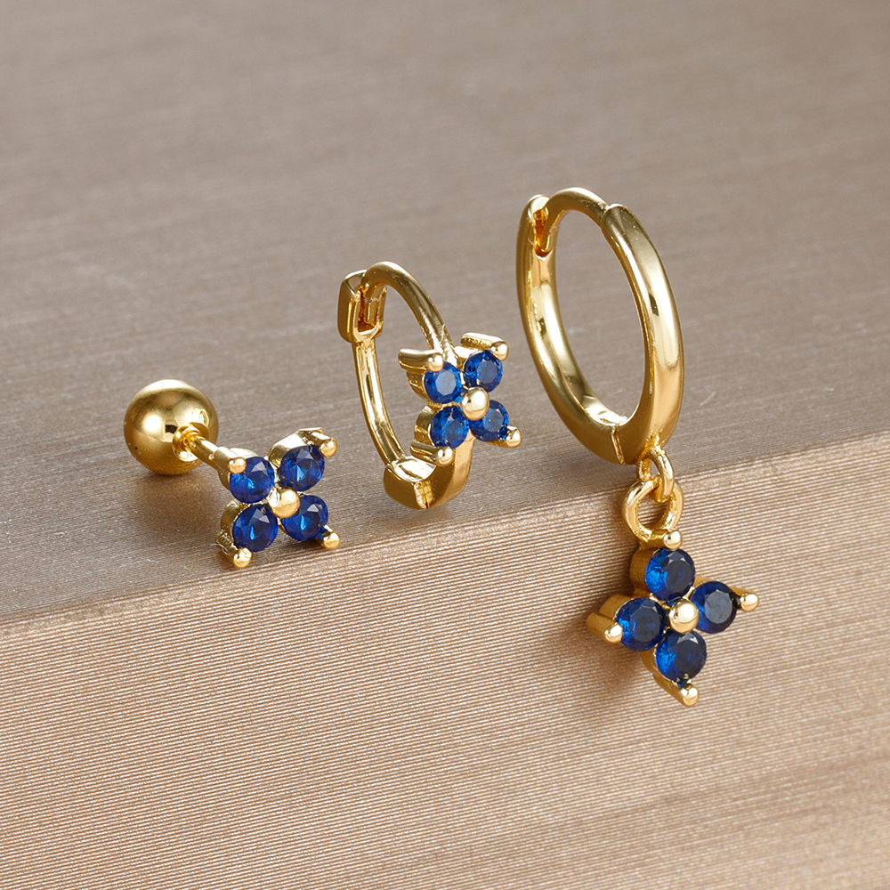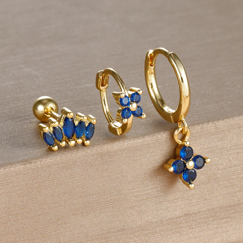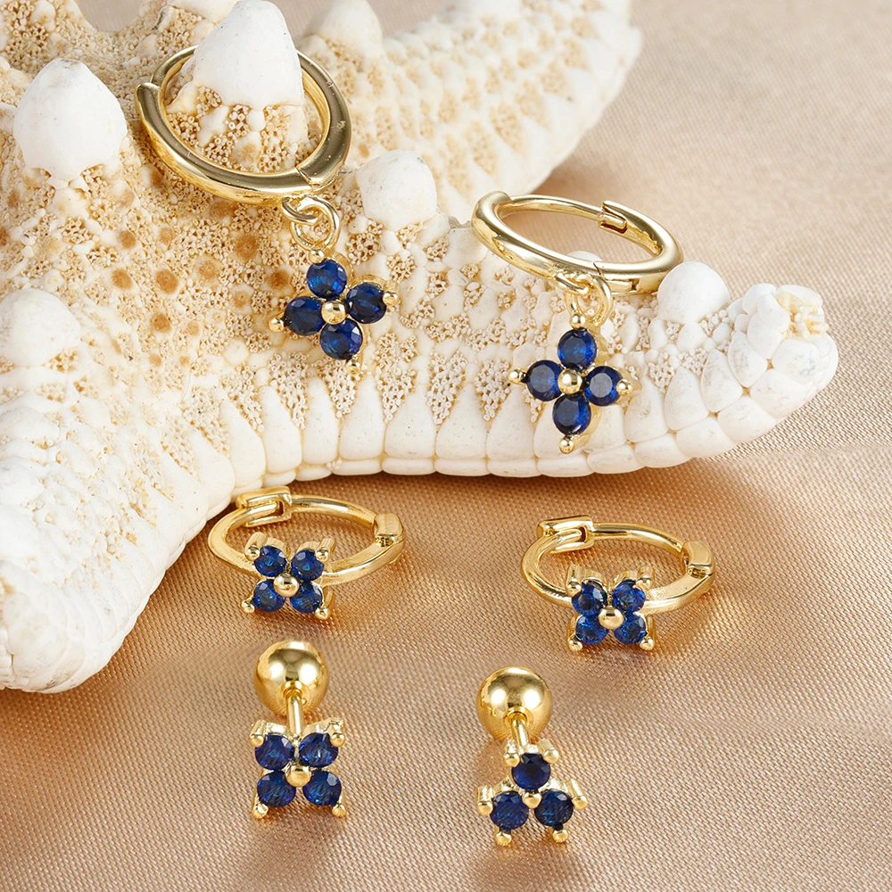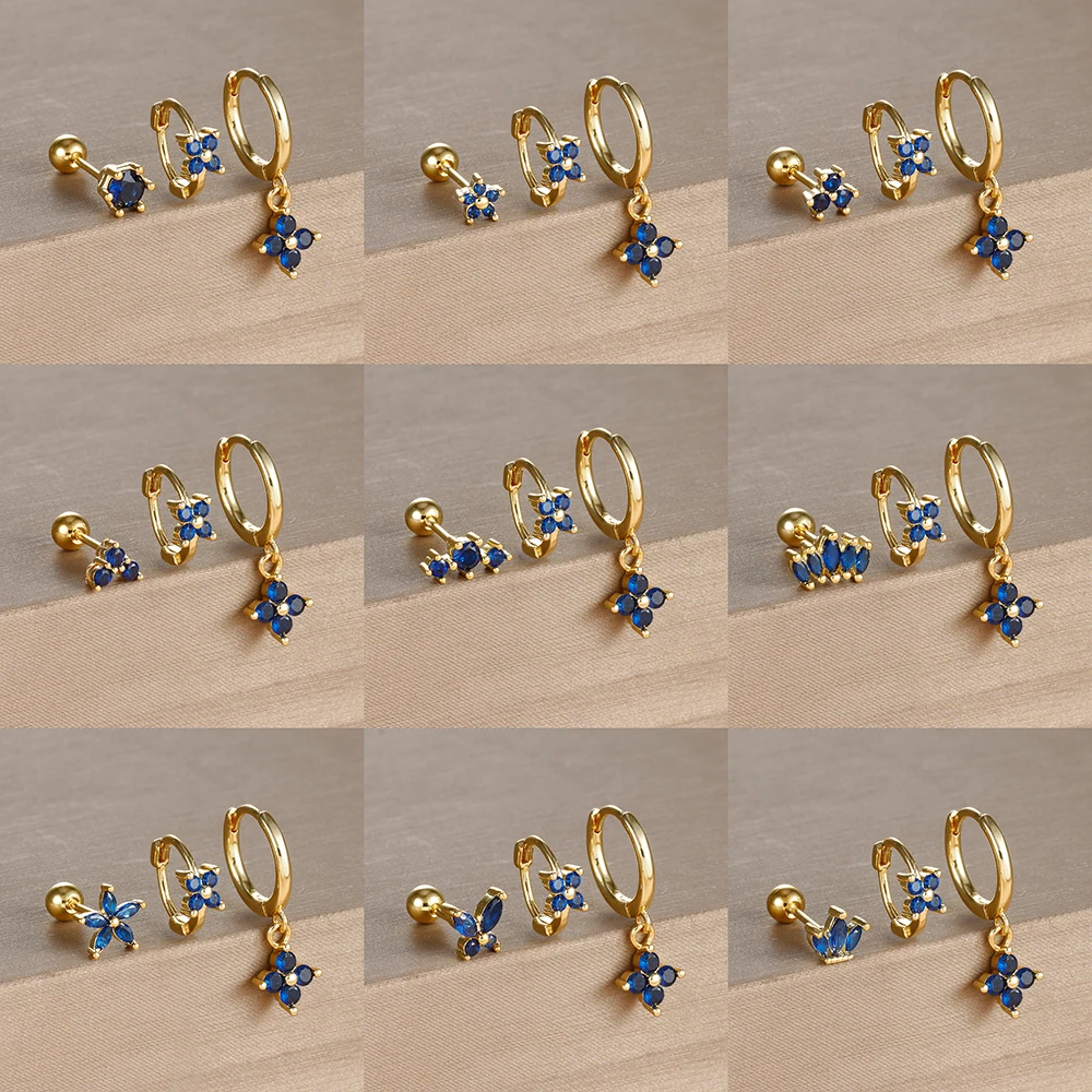3PCS Dainty Flower Stainless Steel Blue Four Zircons Small Hoop Earrings Set For Women Tragus Helix Cartilage Piercing Jewelry