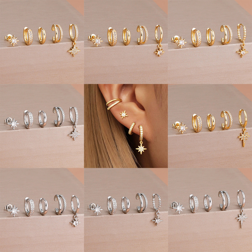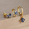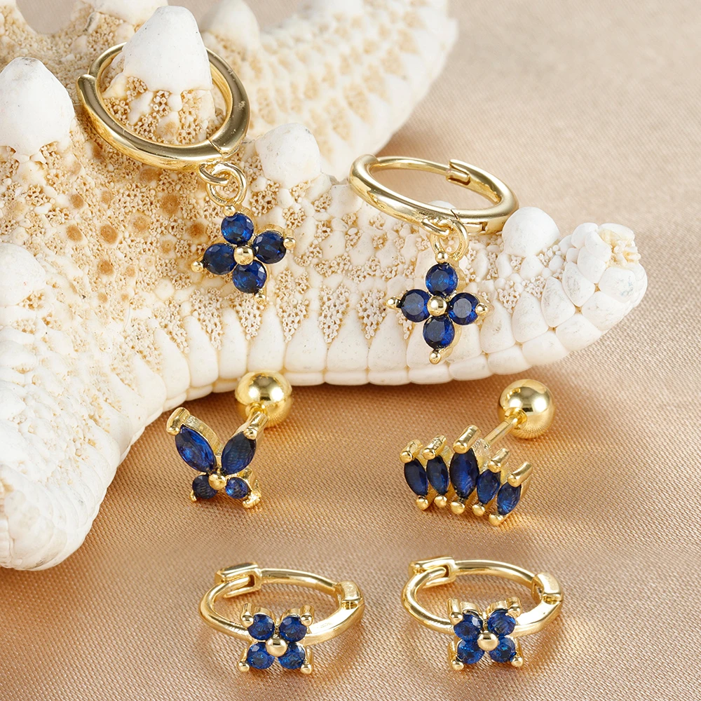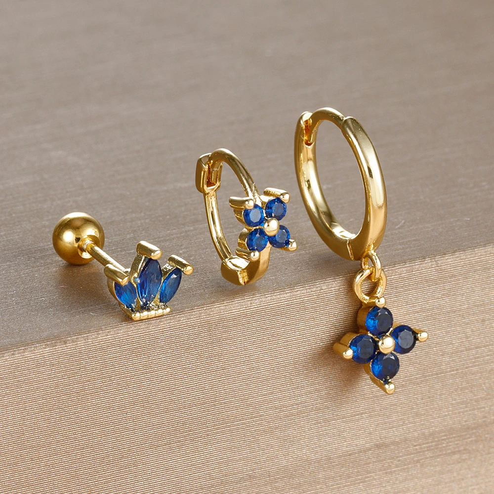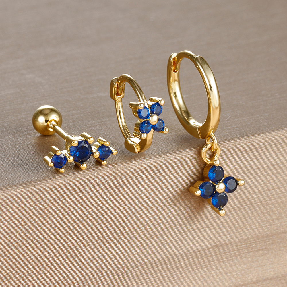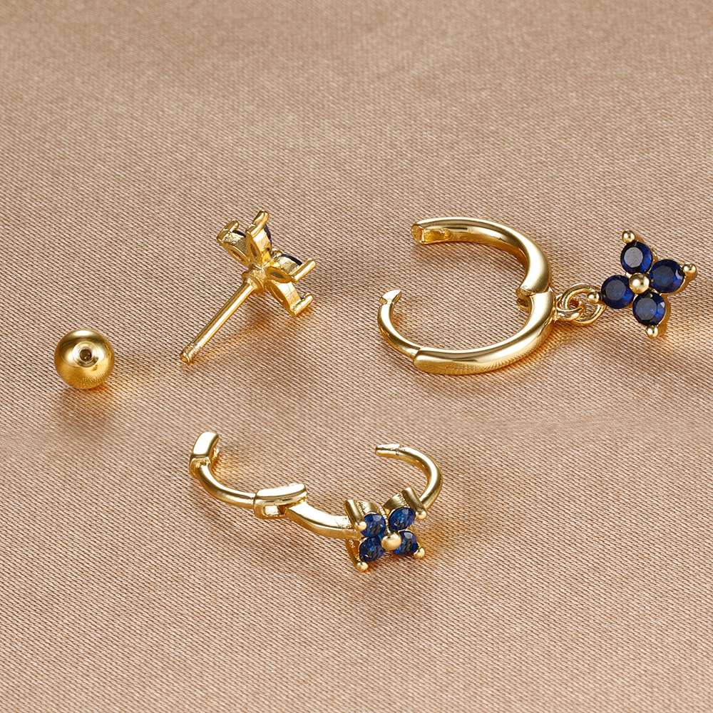 3PCS Dainty Flower Stainless Steel Blue Four Zircons Small Hoop Earrings Set For Women Tragus Helix Cartilage Piercing Jewelry
