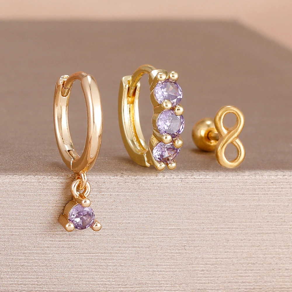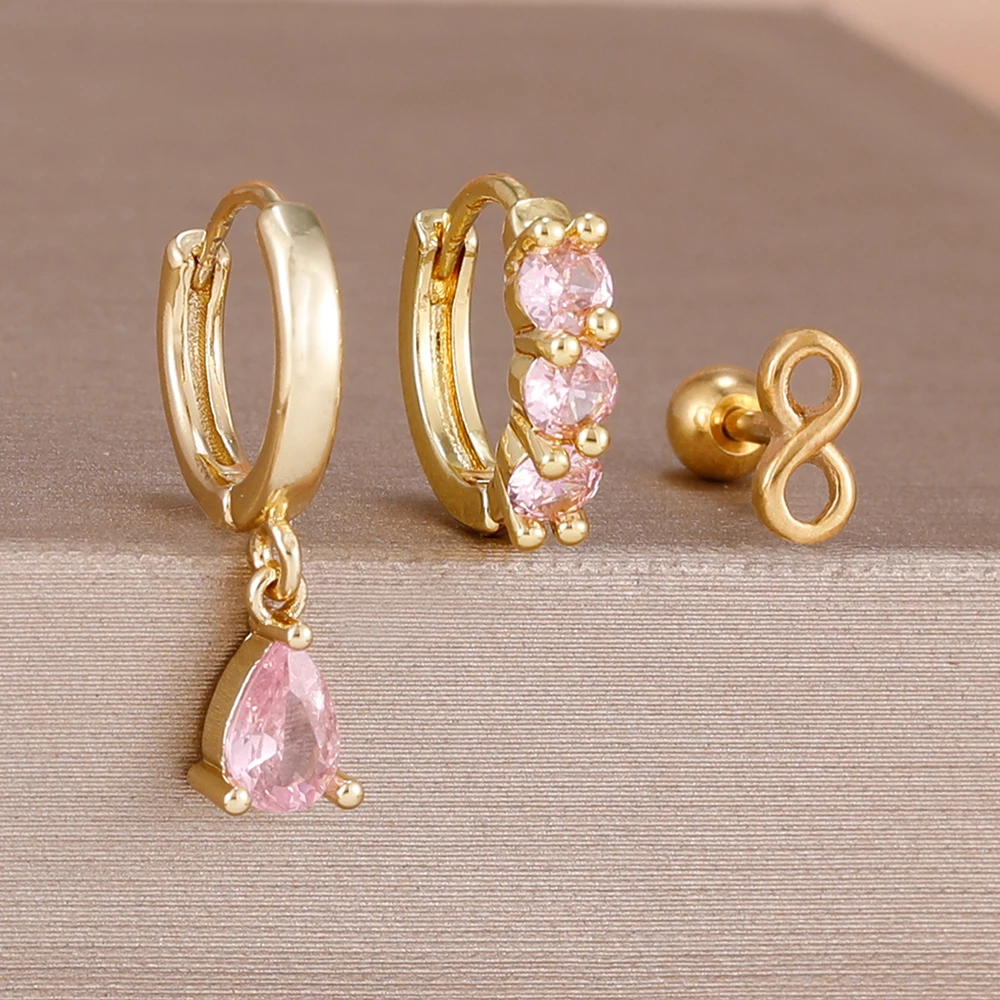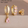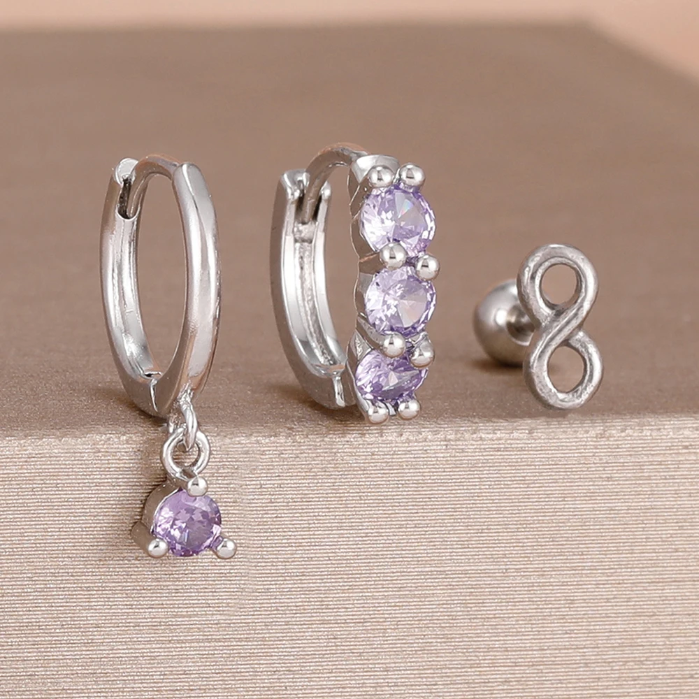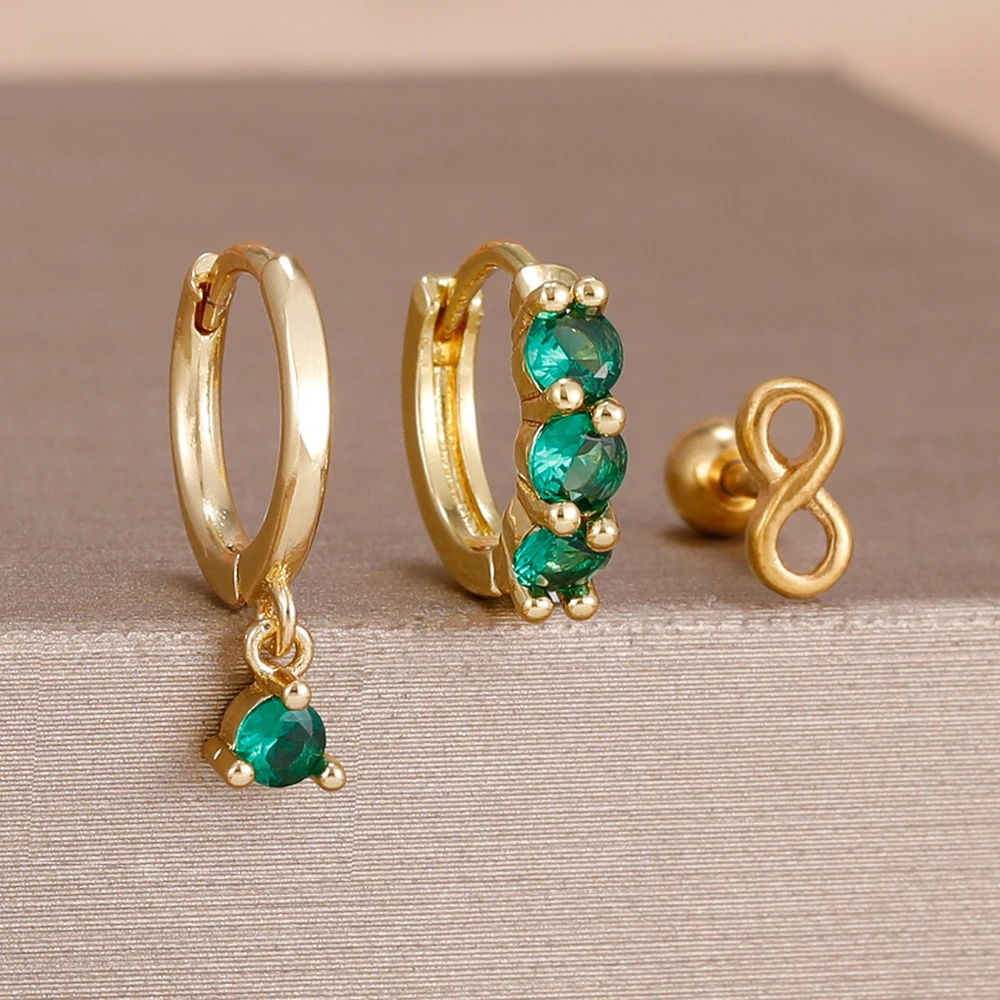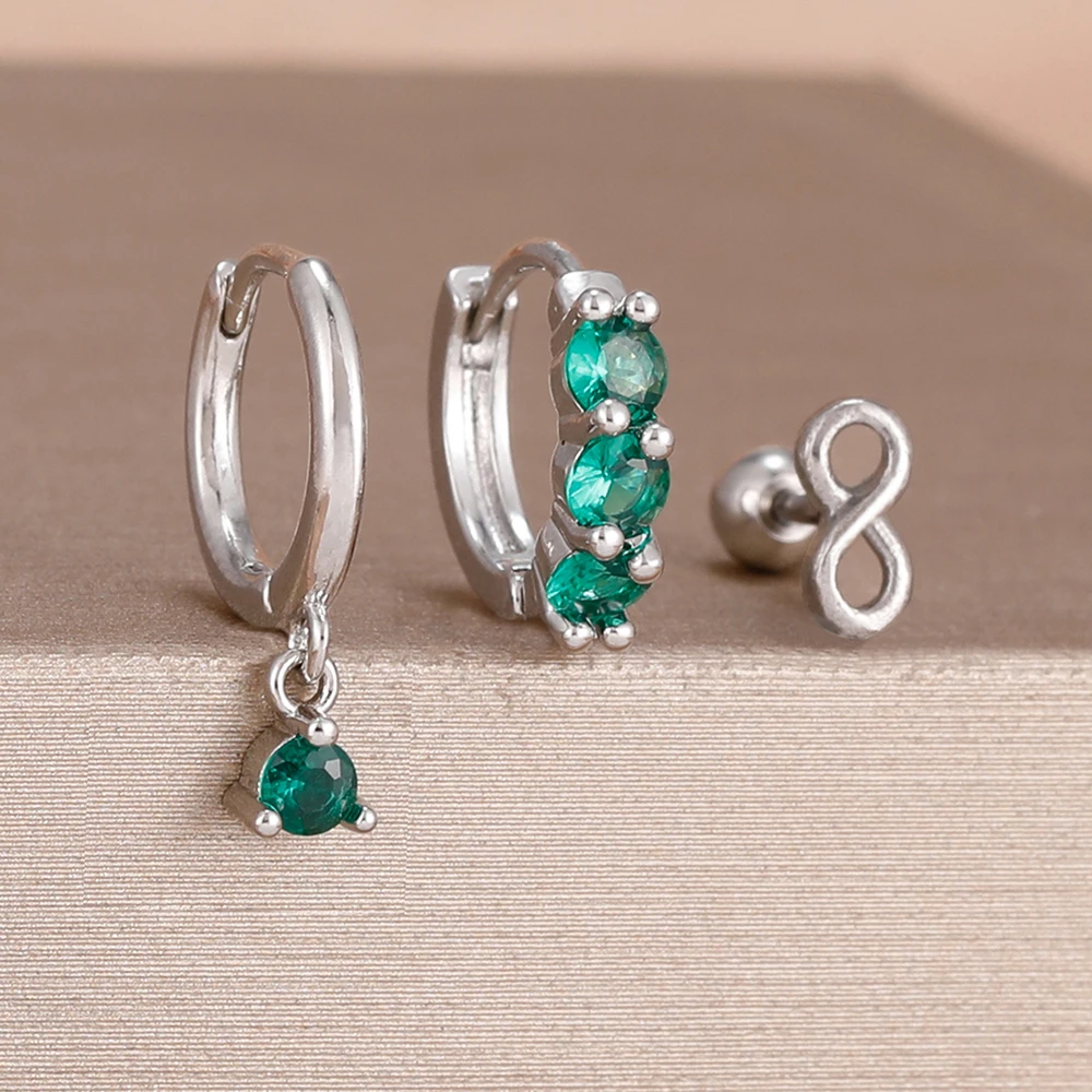 3PCS Fashion Green/Pink/Purple Cubic Zirconia Hoop Earrings Set for Women Stainless Steel Bridal Wedding Party Piercing Jewelry