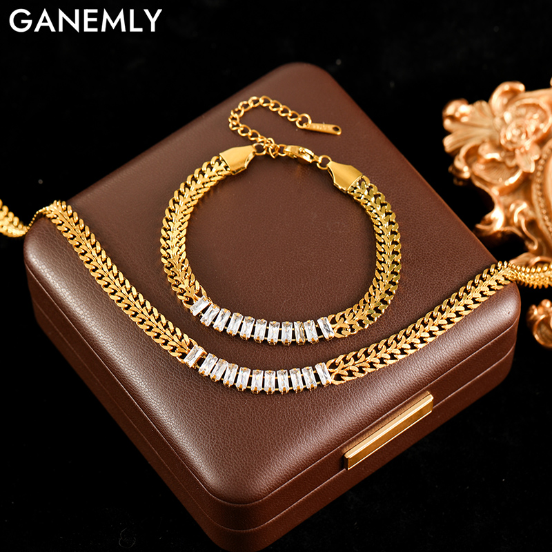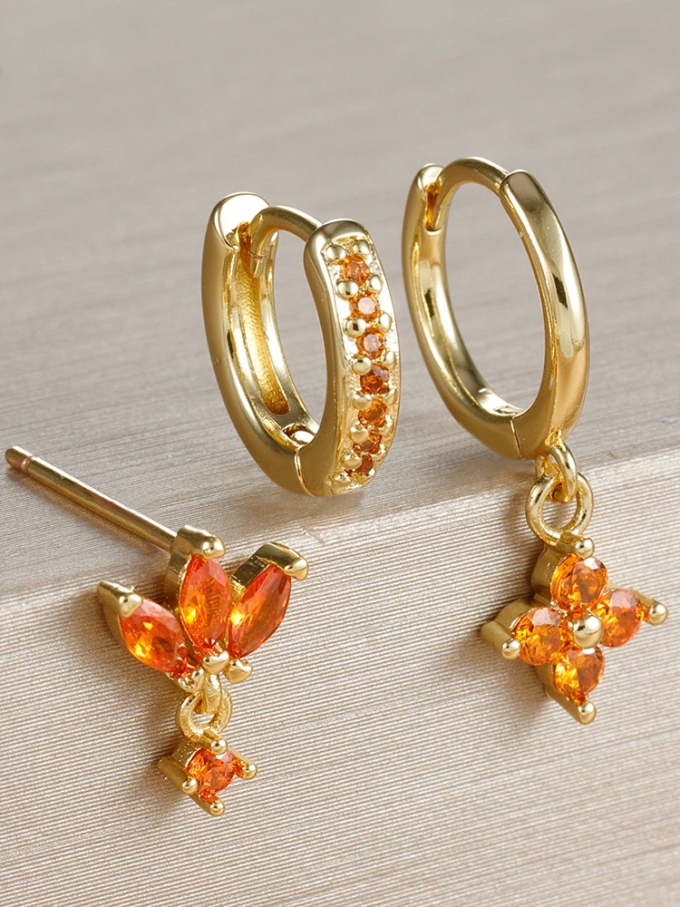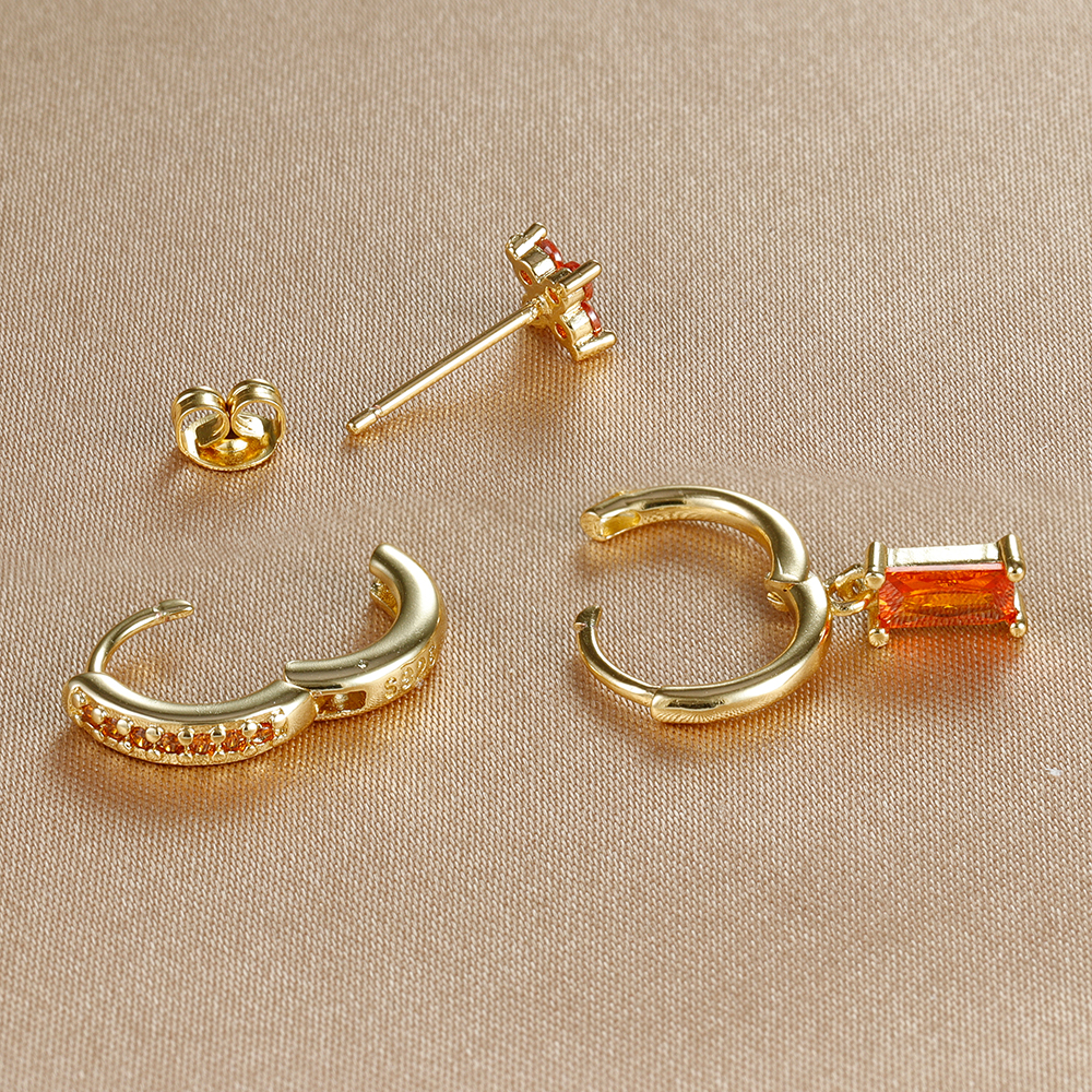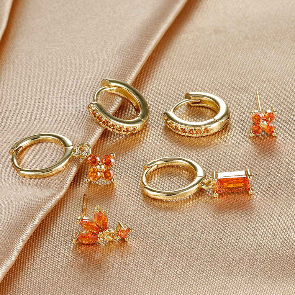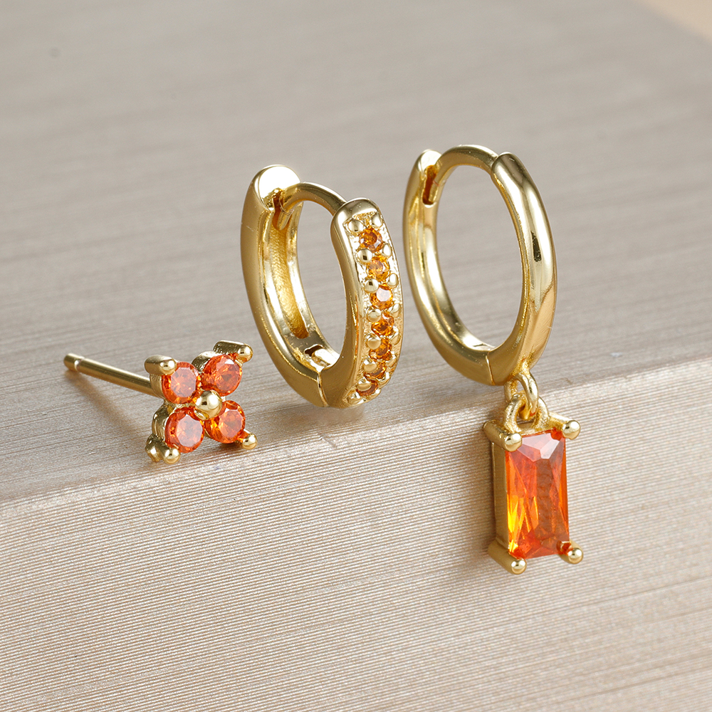 3PCS Fashion Sparkling Orange Zircon Drop Earrings Set For Women 18K Gold Plated Geometric Square Piercing Earring Party Jewelry