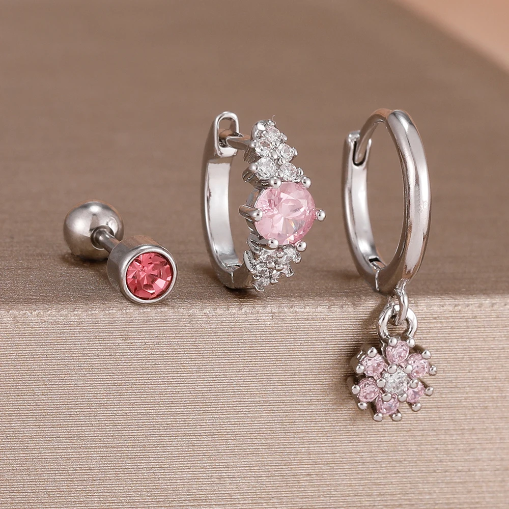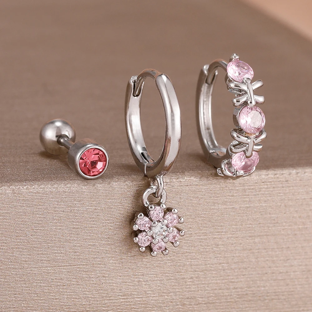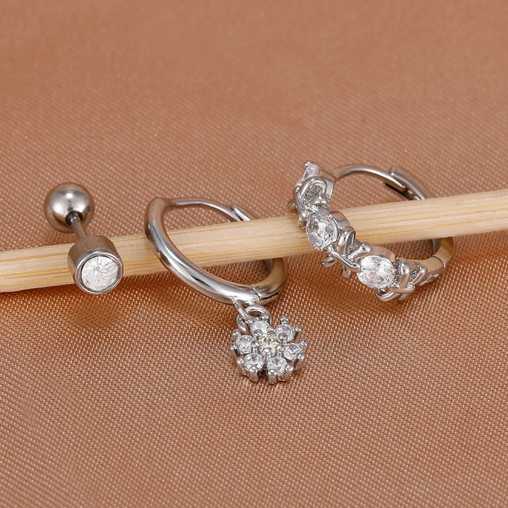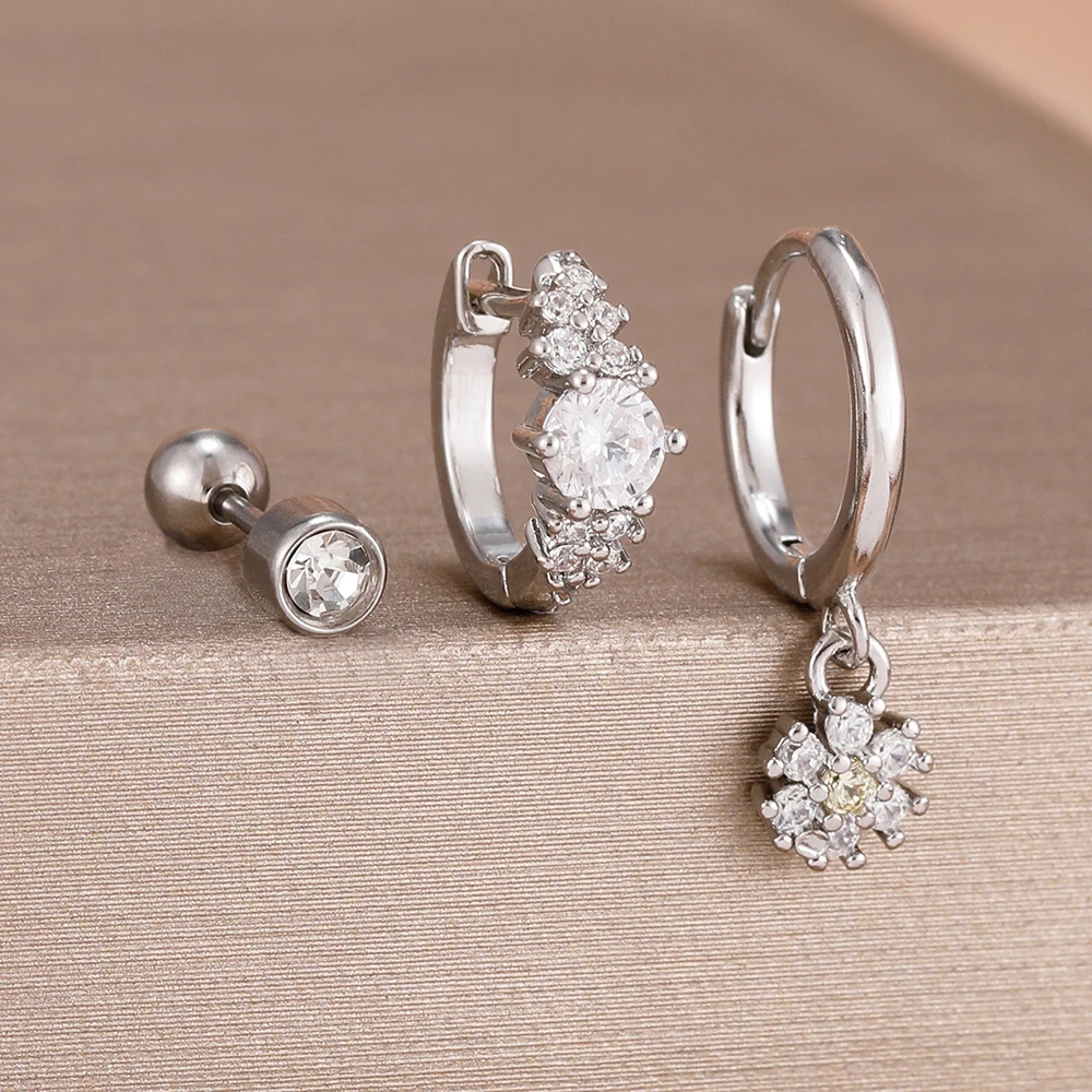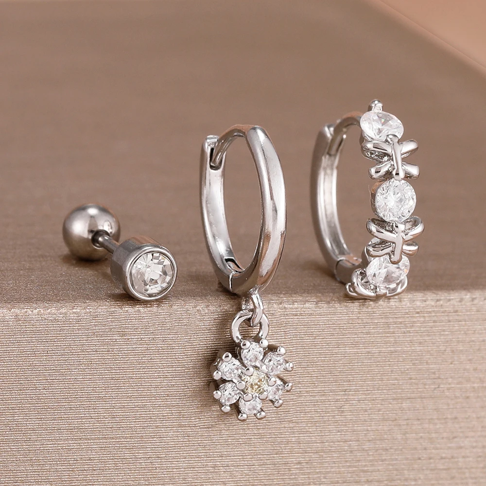 3Pcs Fashion Stainless Steel Hoop Earrings Set For Women Exquisite Pendant Crystal Flower Huggie Piercing Earring Jewelry