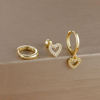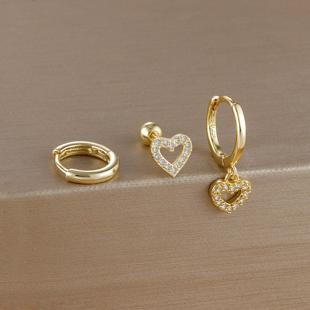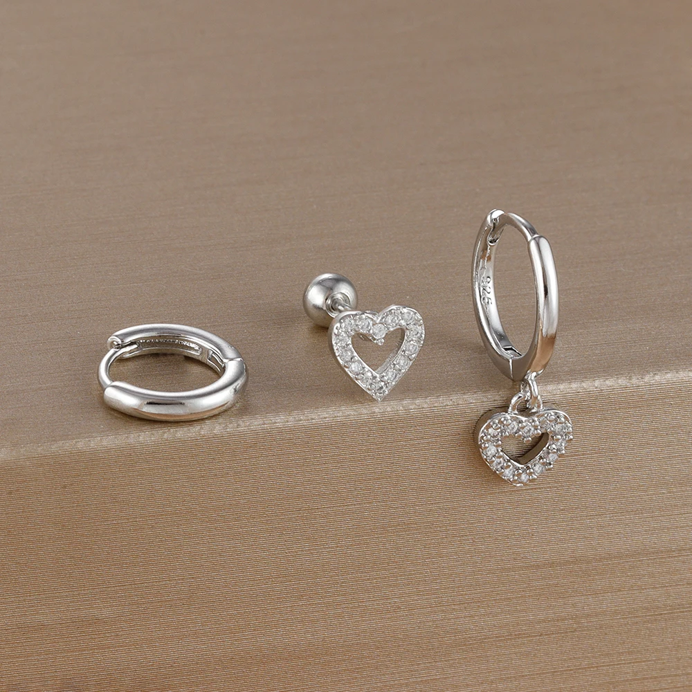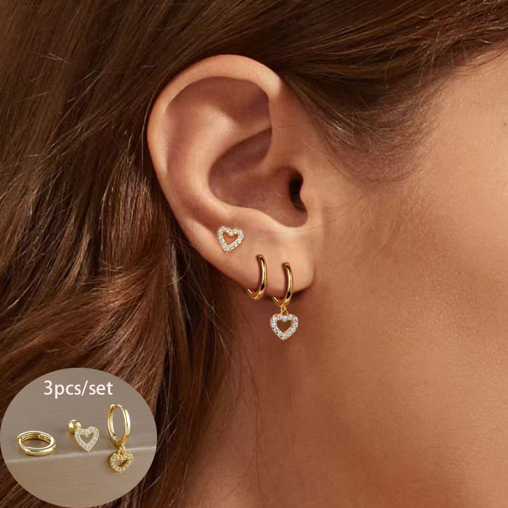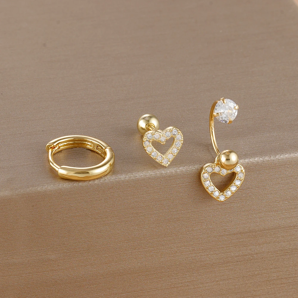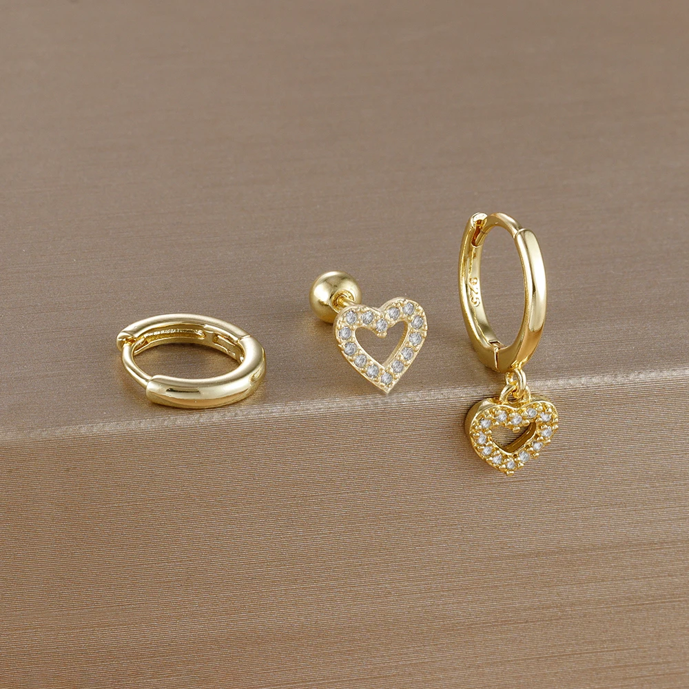 3PCS Heart-Shaped Zircon Pendant Hollow Hoop Earrings Set for Women Stainless Steel Gold Color Round Earrings Fashion Jewelry