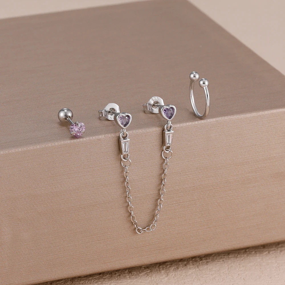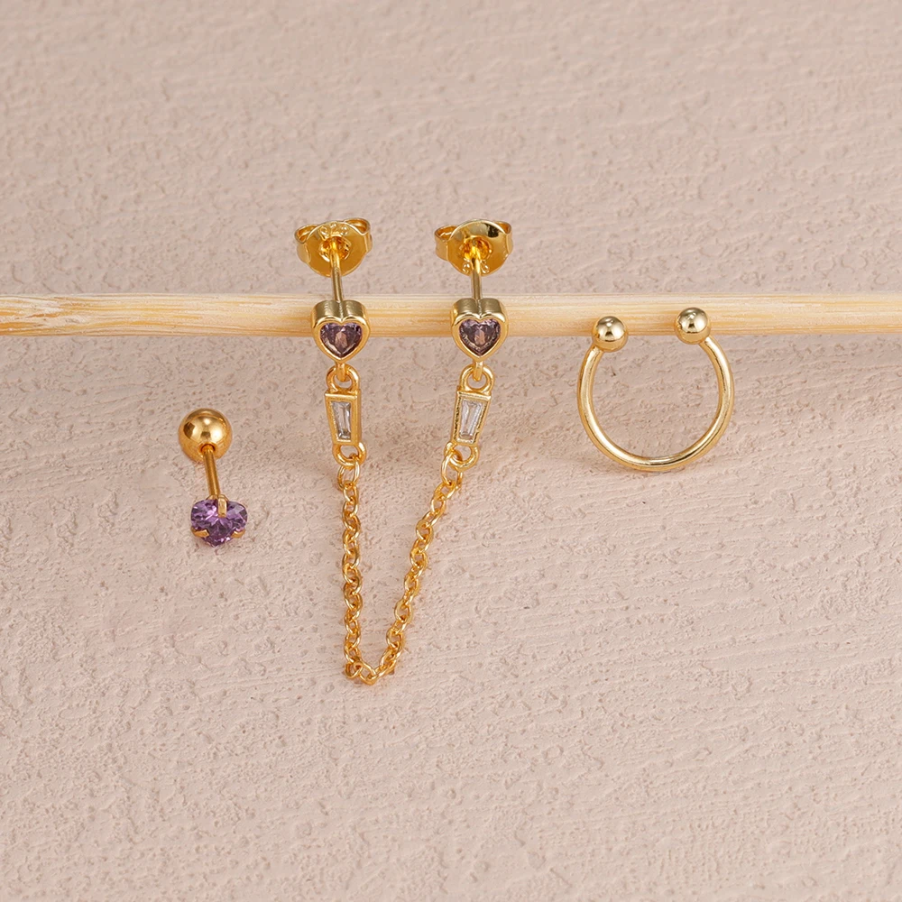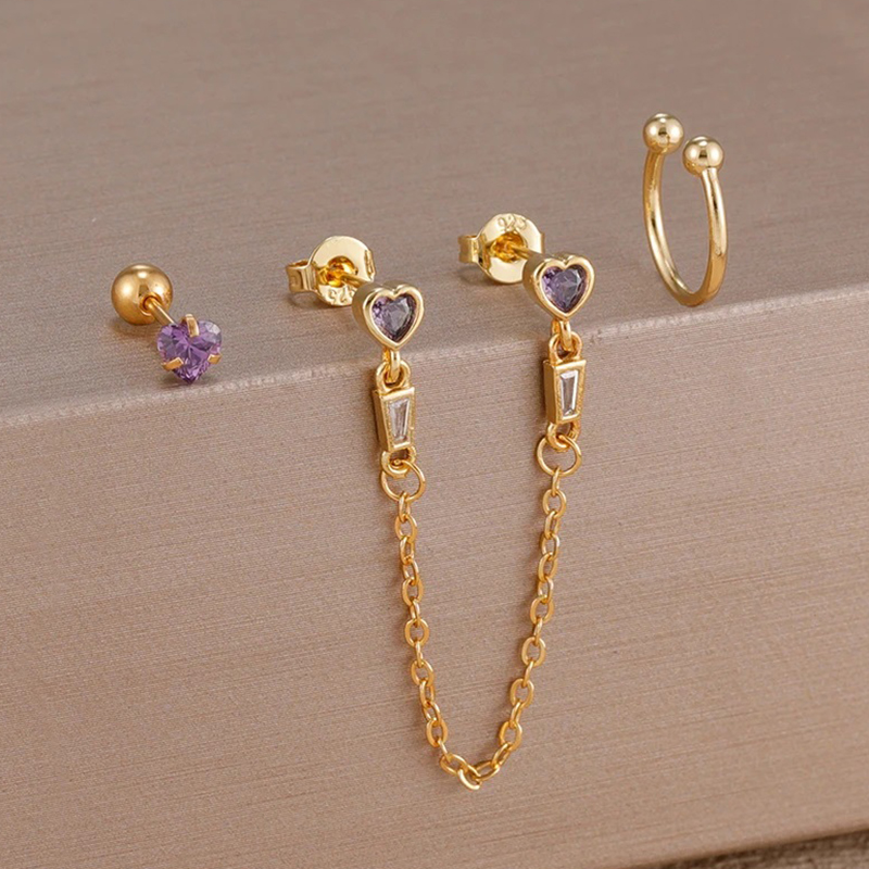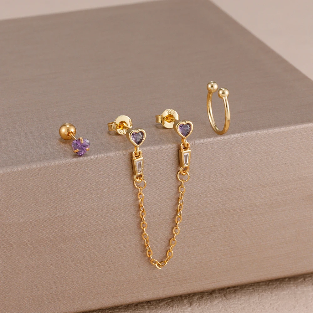 3PCS Heart Square Purple Zircon Tassel Chain Earrings Set For Women Gold Plated Elegant Studs Hoop Earring Girl Party Jewelry