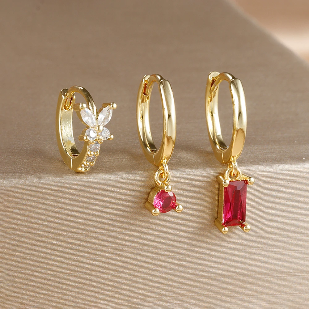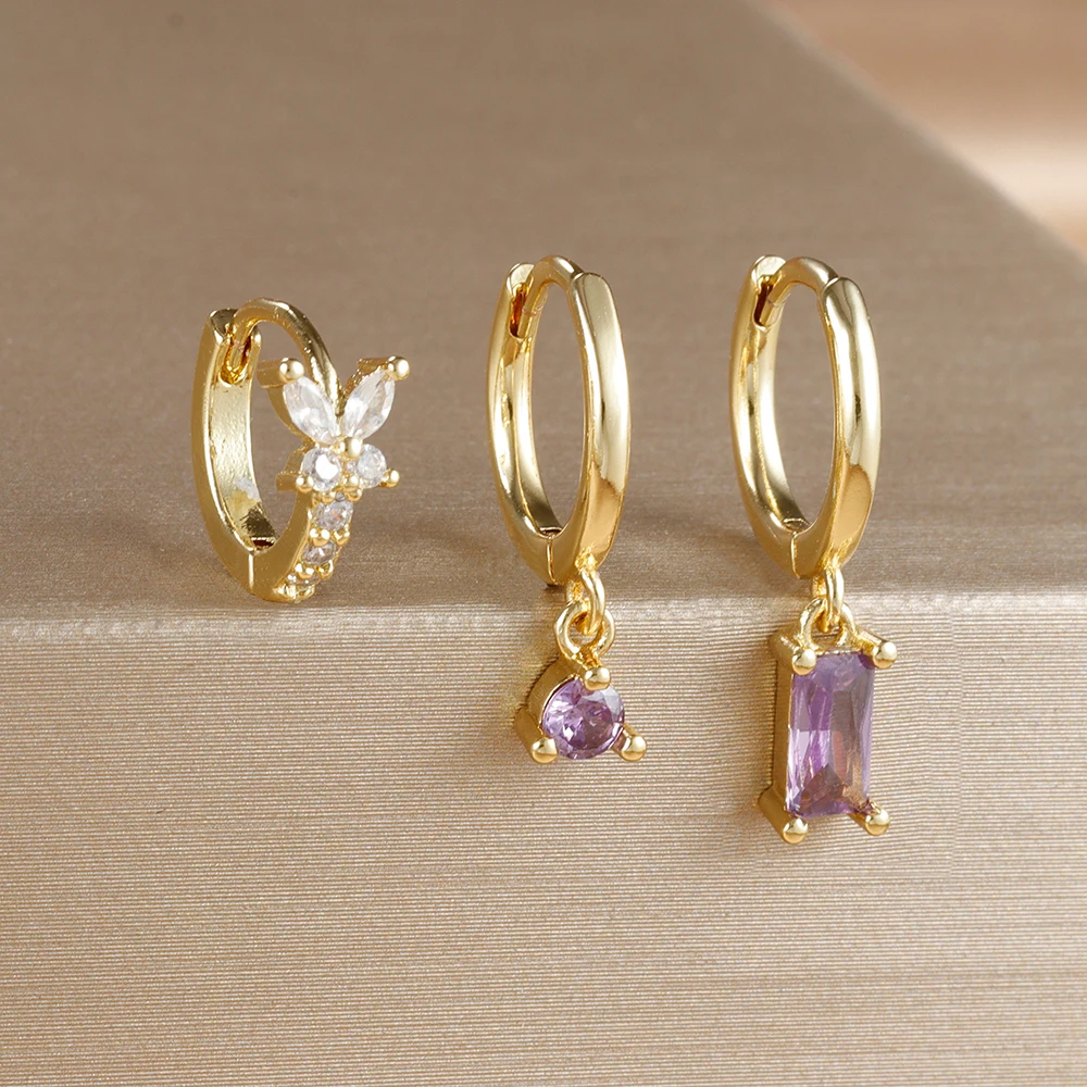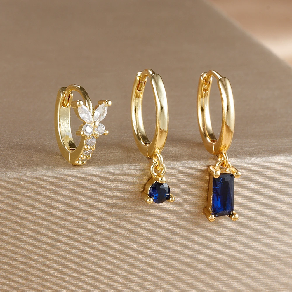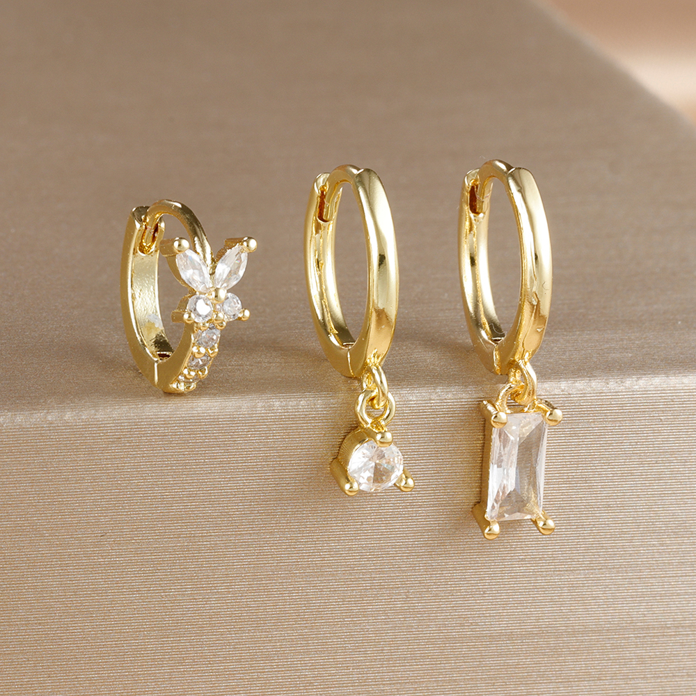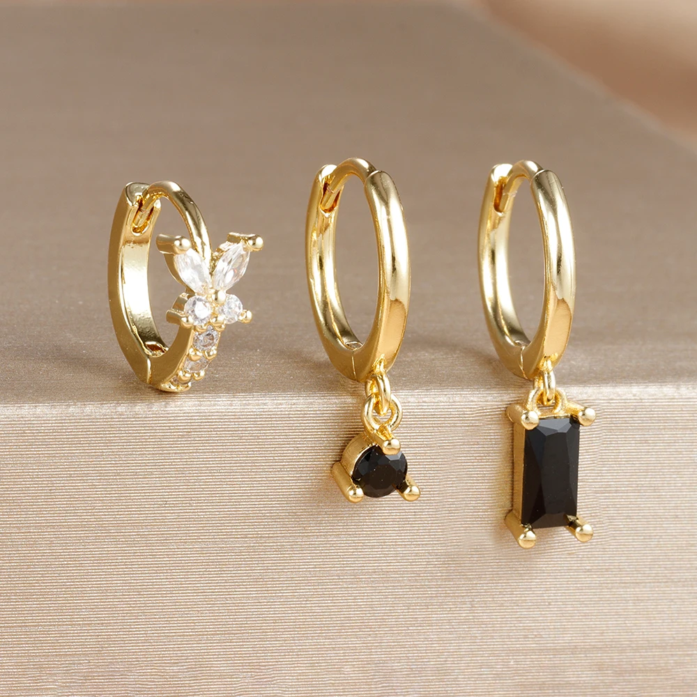 3PCS Luxury Design Zircon Butterfly Hoop Earrings Set for Women Tiny 18K Gold Plated Square Pendant Earring Piercing Jewelry