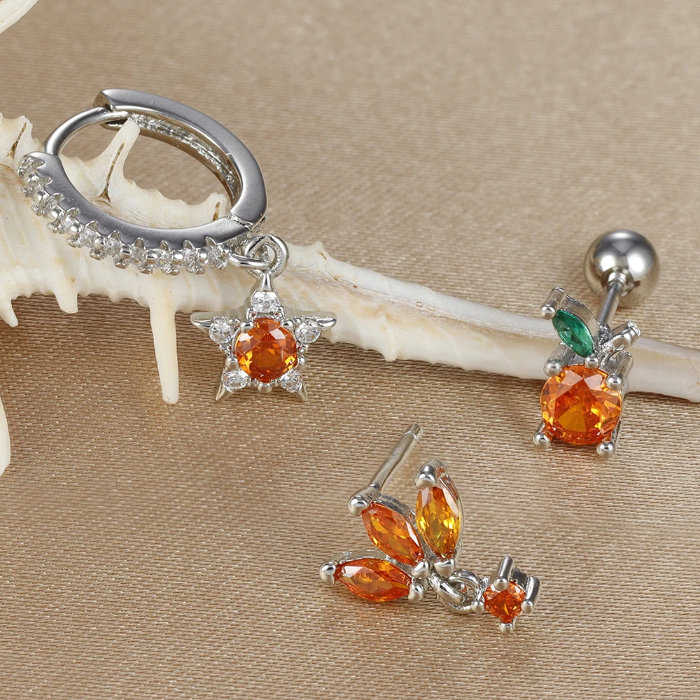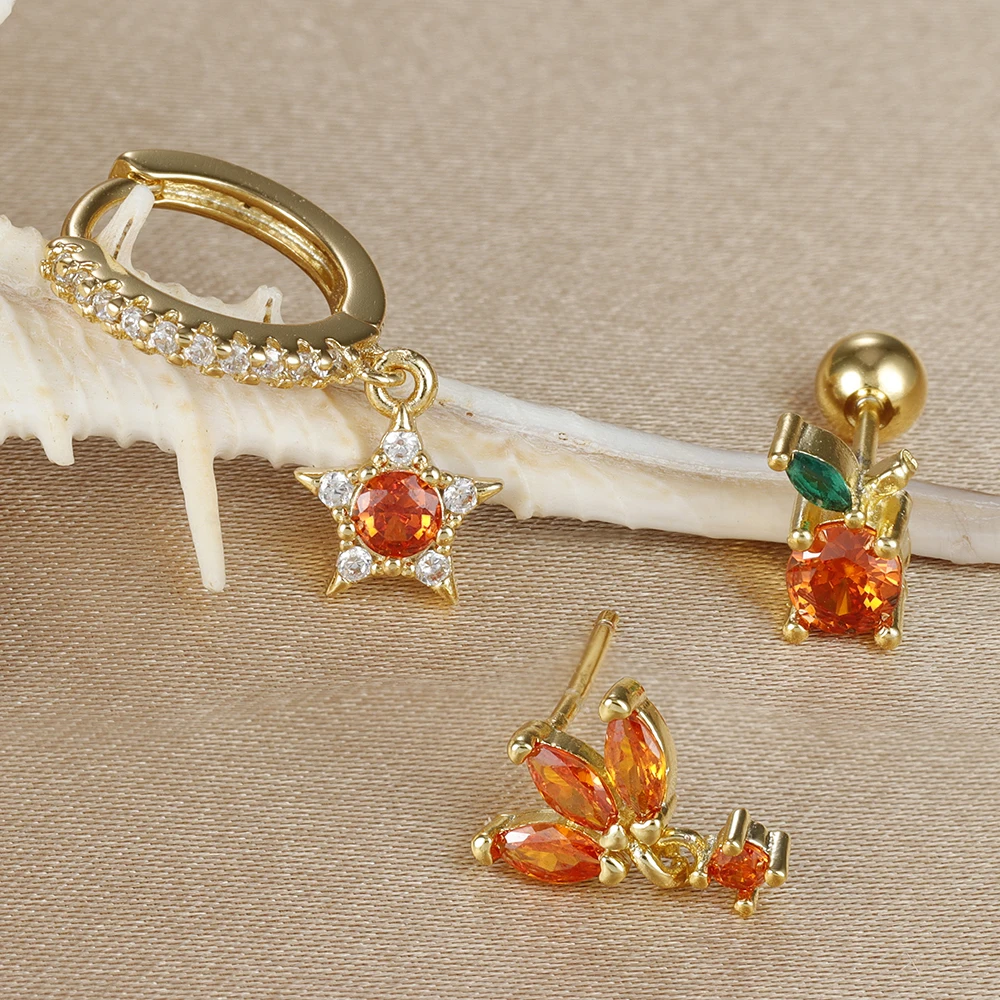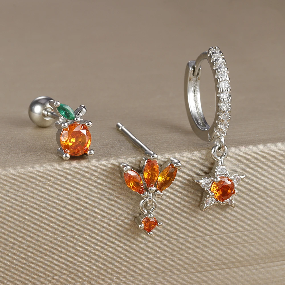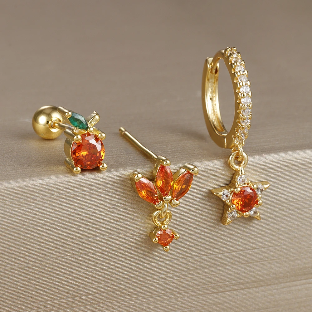 3pcs New Arrival Stainless Steel Star Zircon Earrings Set For Women Orange Ear Studs Helix Cartilage Piercing Fashion Jewelry