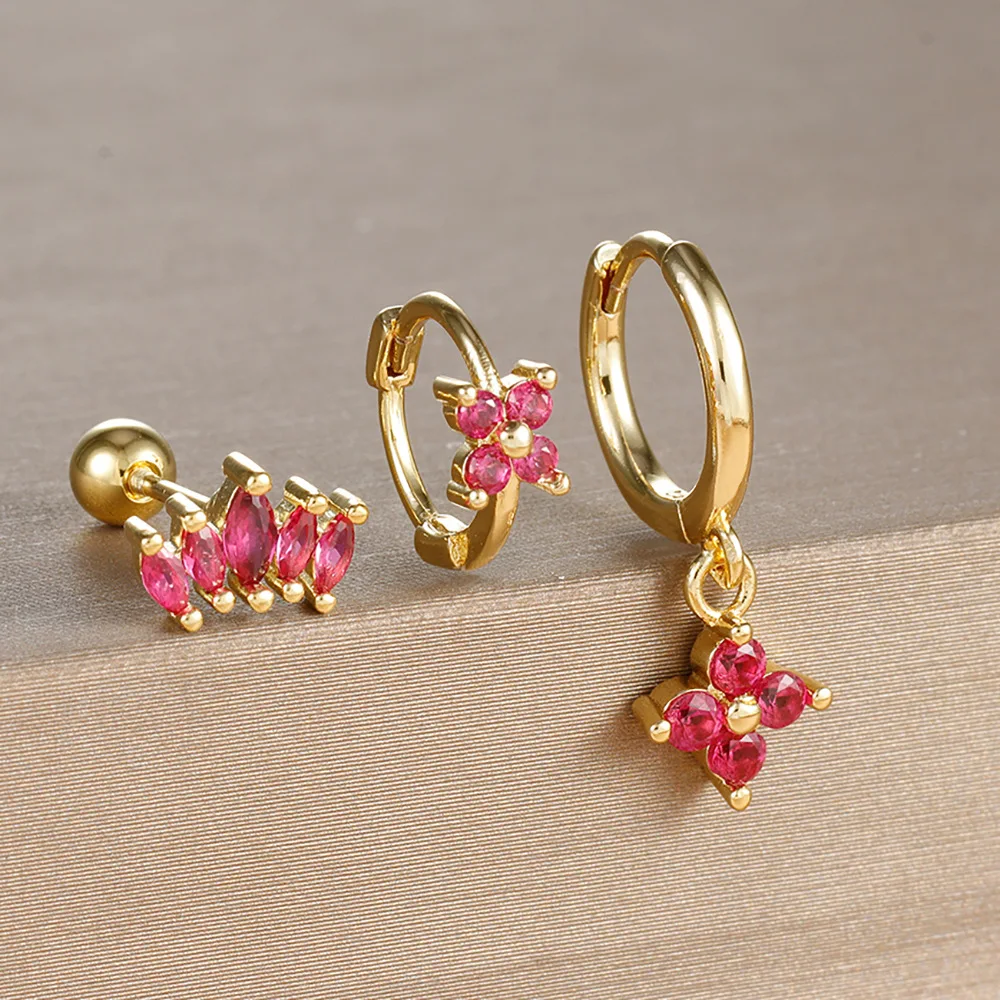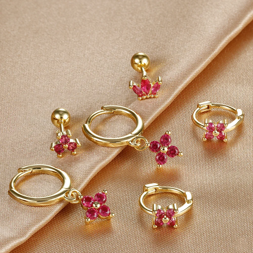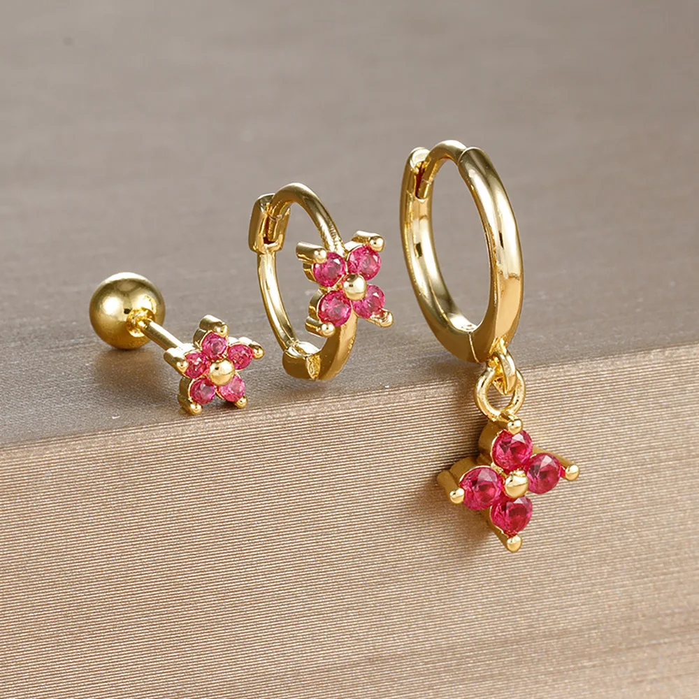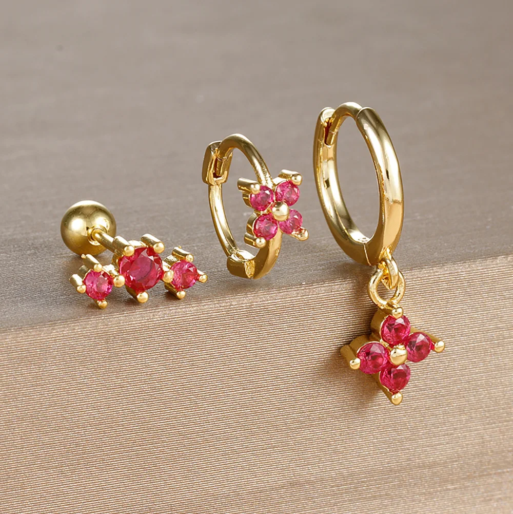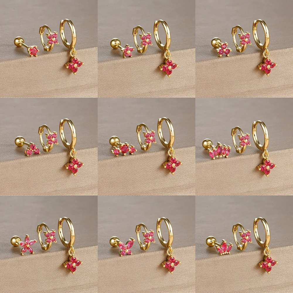 3PCS Rose Red Zircon Stainless Steel Crown Huggie Earrings Set for Women Tiny Round Flower Dangle Earring Piercing Jewelry