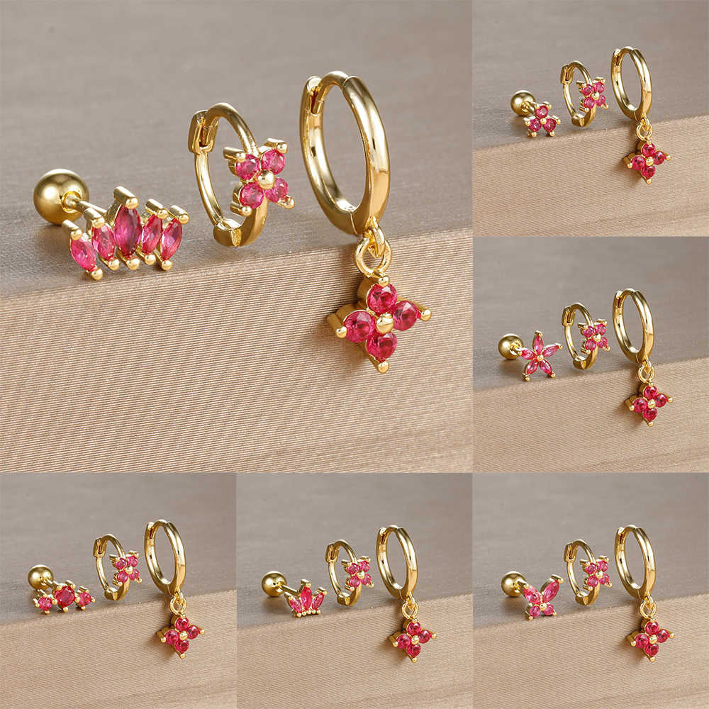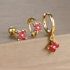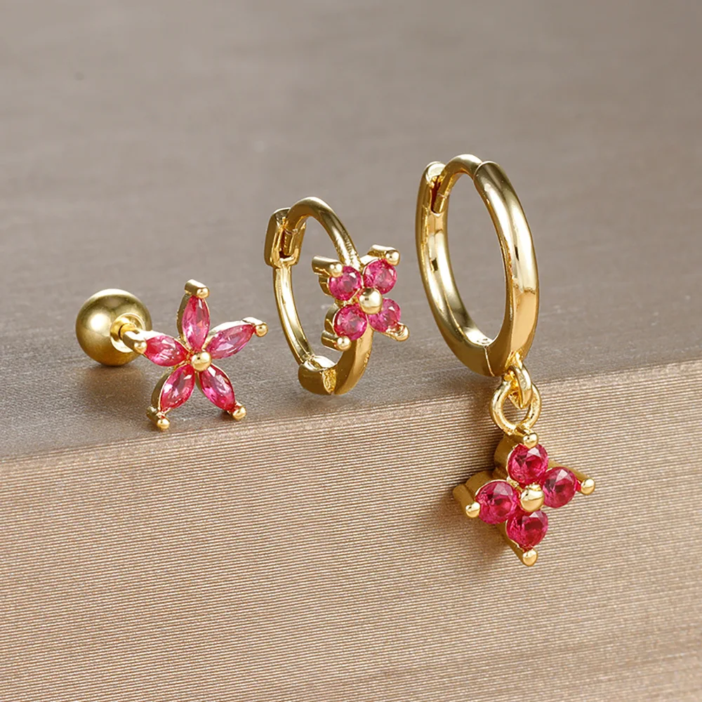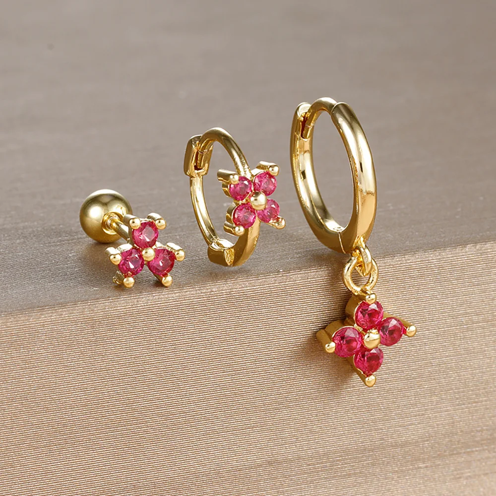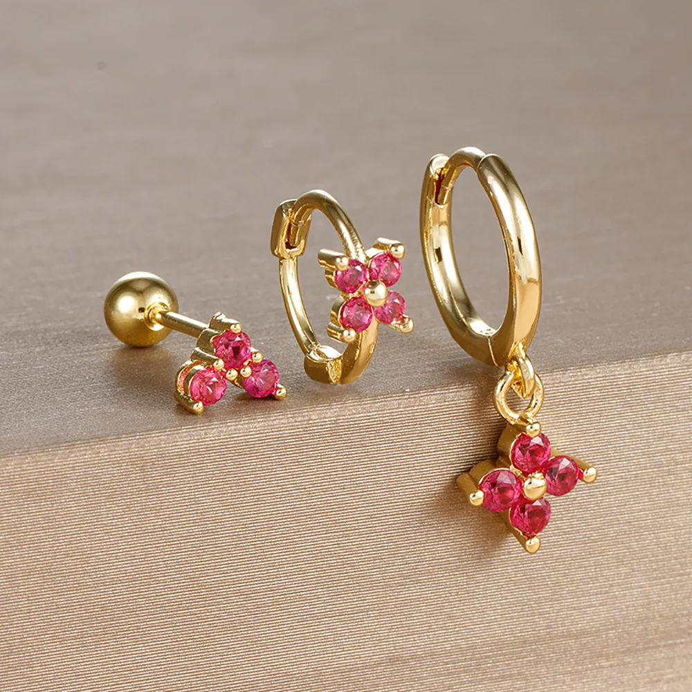 3PCS Rose Red Zircon Stainless Steel Crown Huggie Earrings Set for Women Tiny Round Flower Dangle Earring Piercing Jewelry