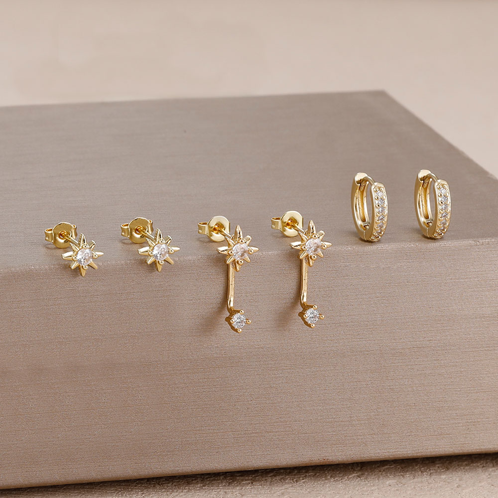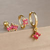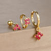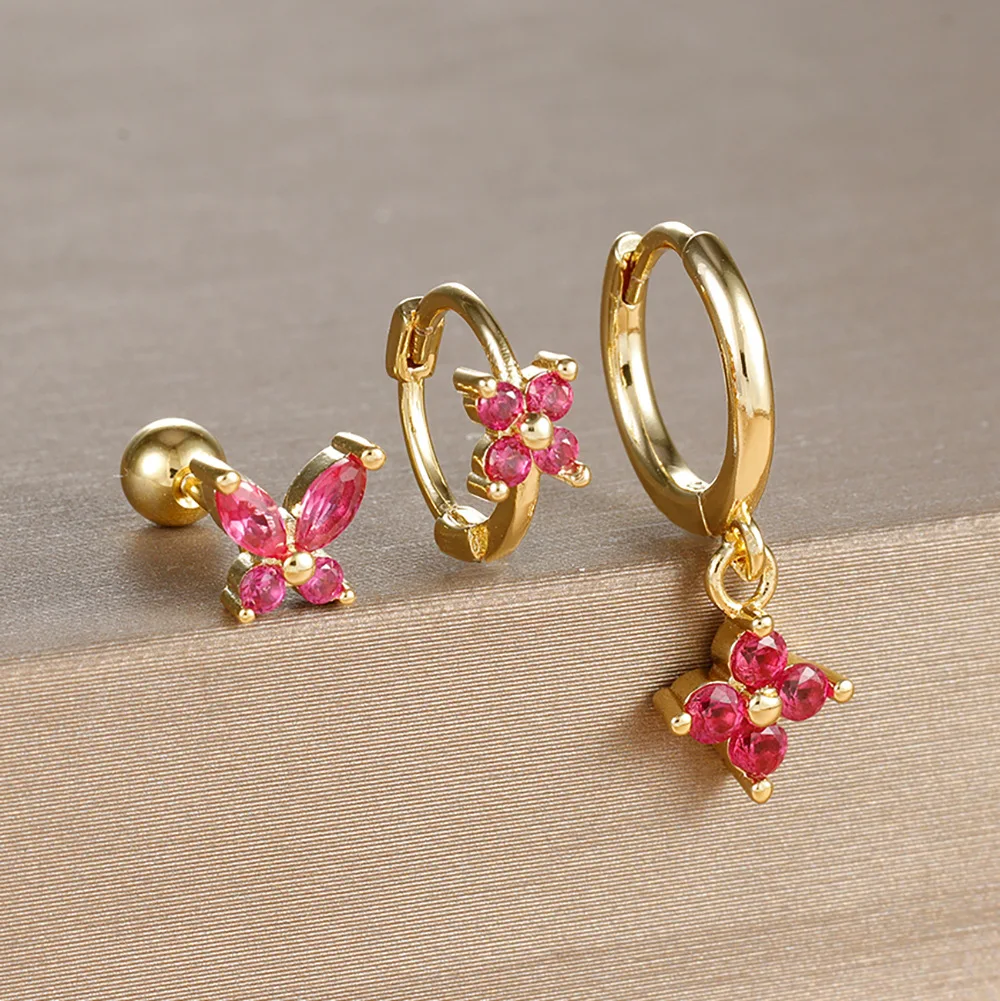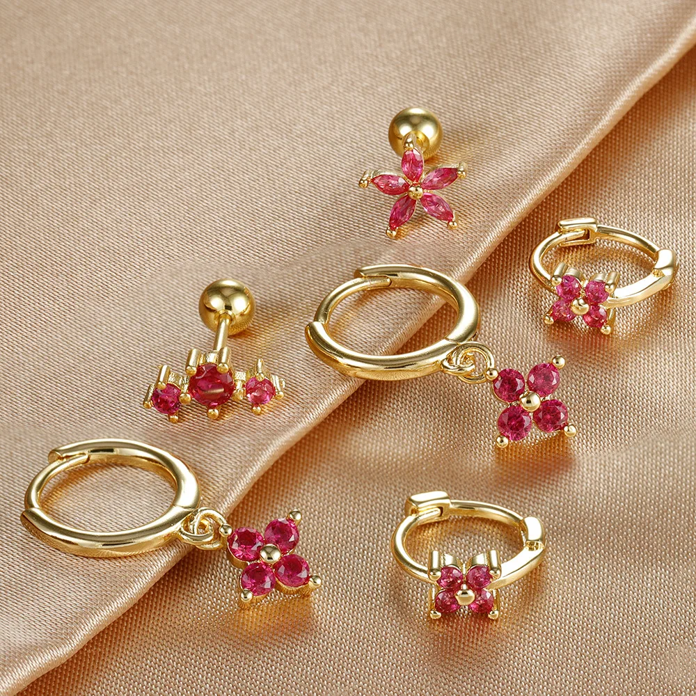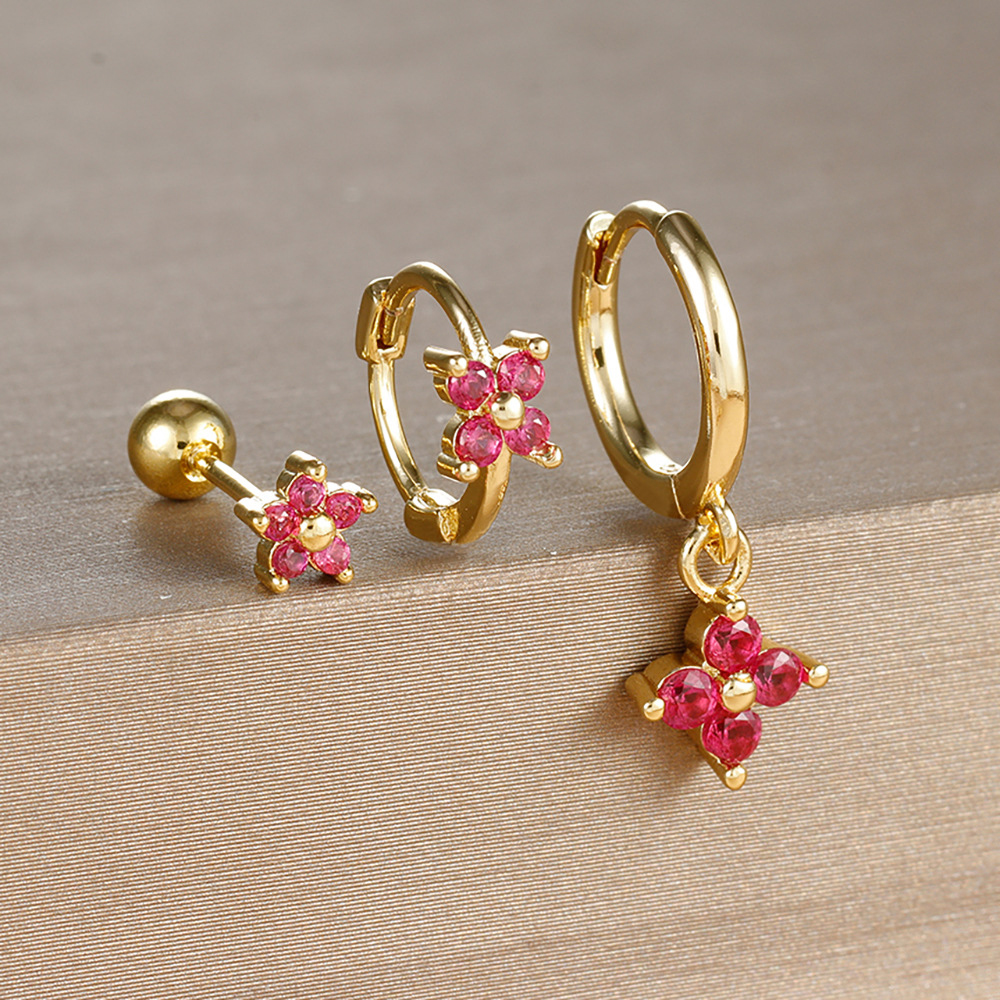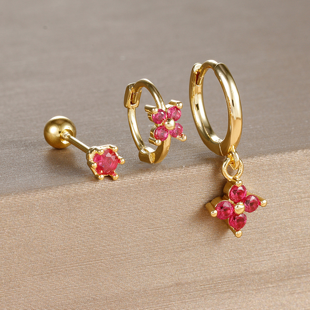 3PCS Rose Red Zircon Stainless Steel Crown Huggie Earrings Set for Women Tiny Round Flower Dangle Earring Piercing Jewelry