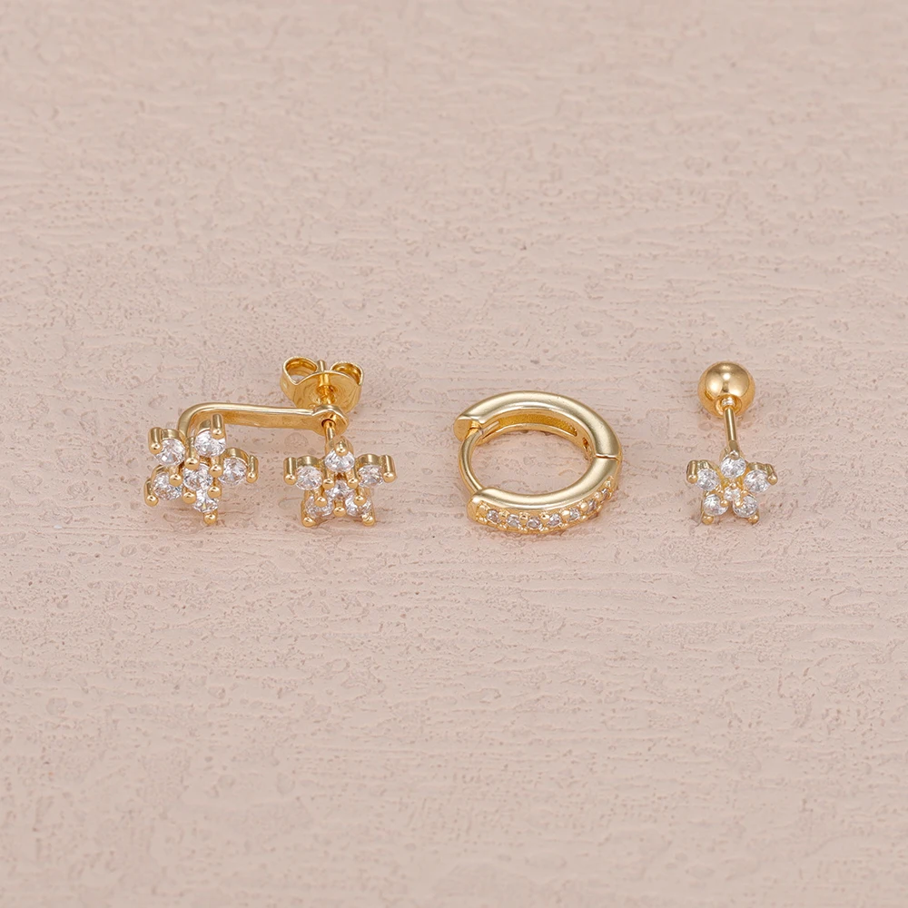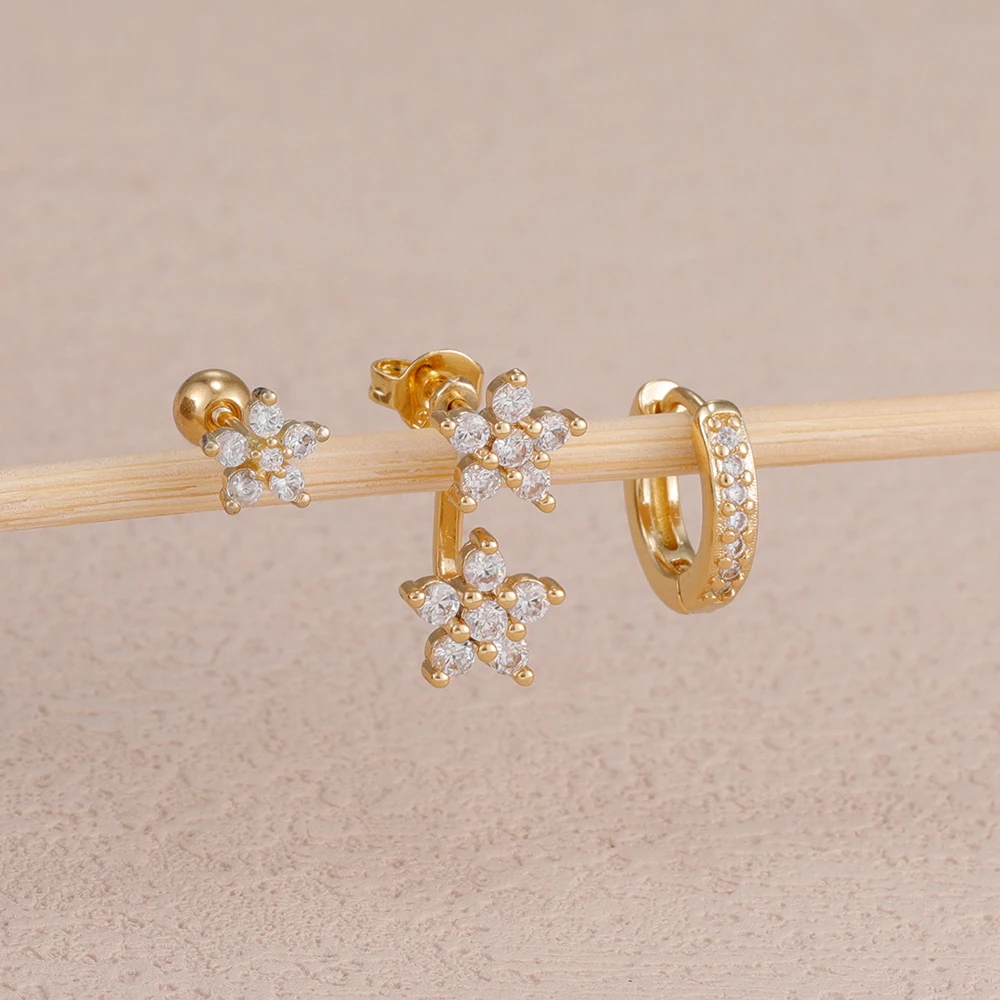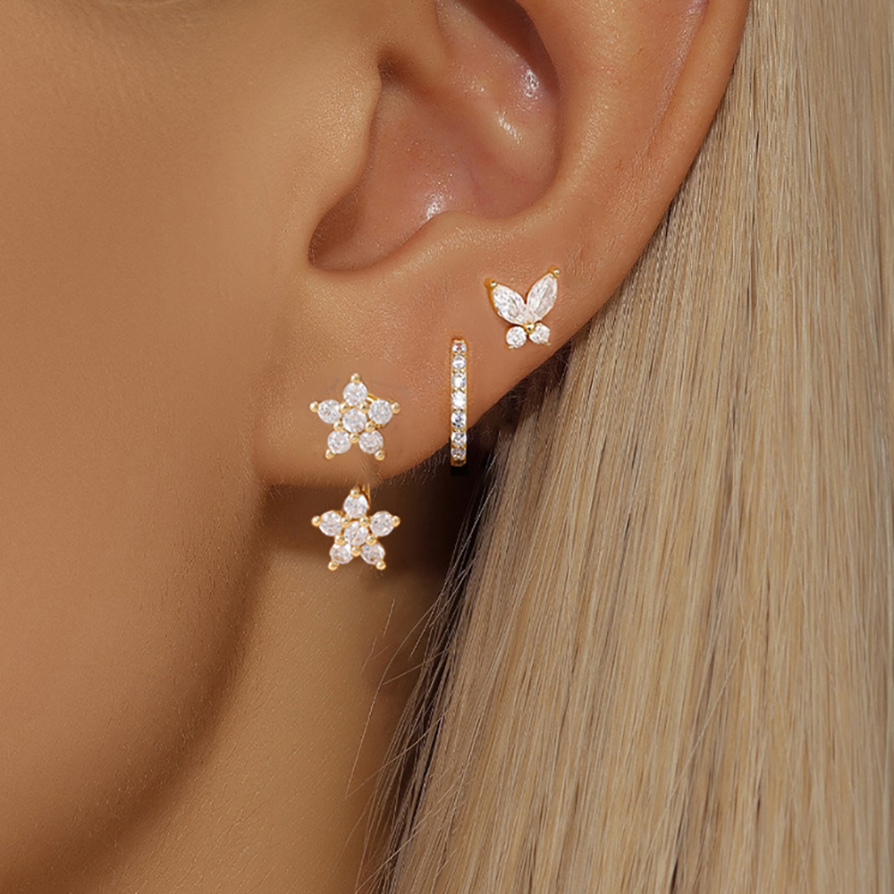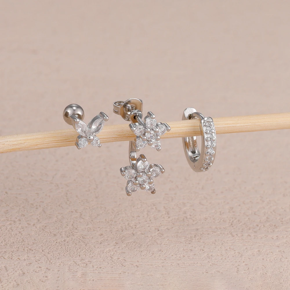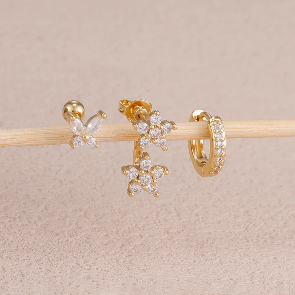 3PCS/Set Fashion Butterfly Zircon Earrings Stainless Steel 14K Gold-Plated Flower Stud Helix Cartilage Earring Piercing Jewelry
