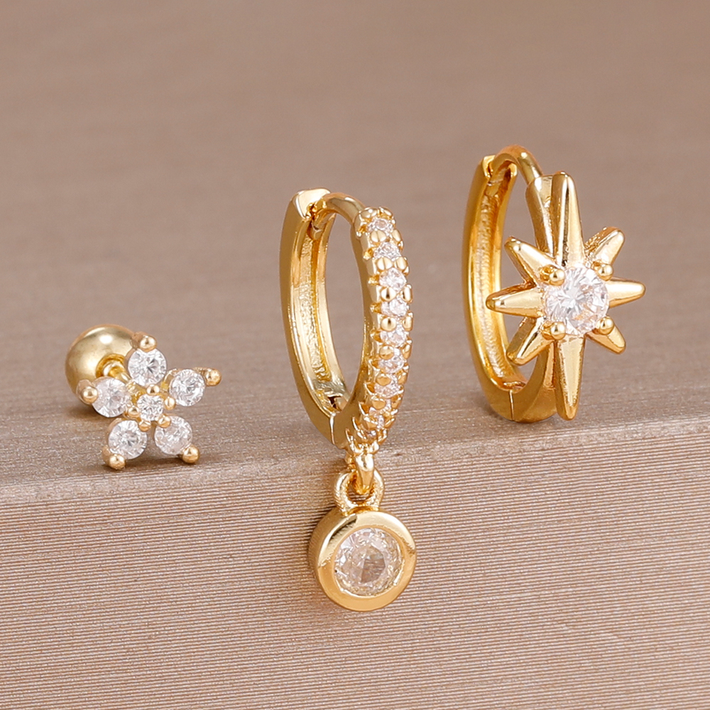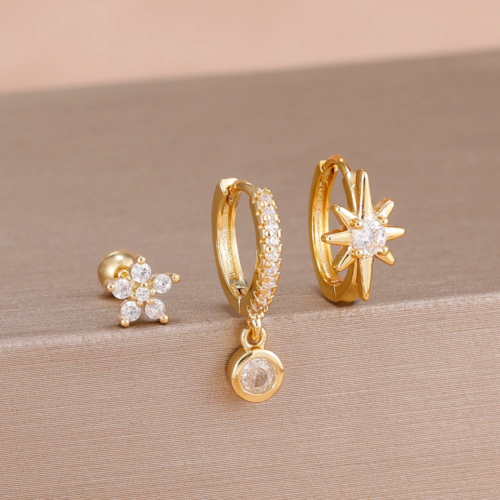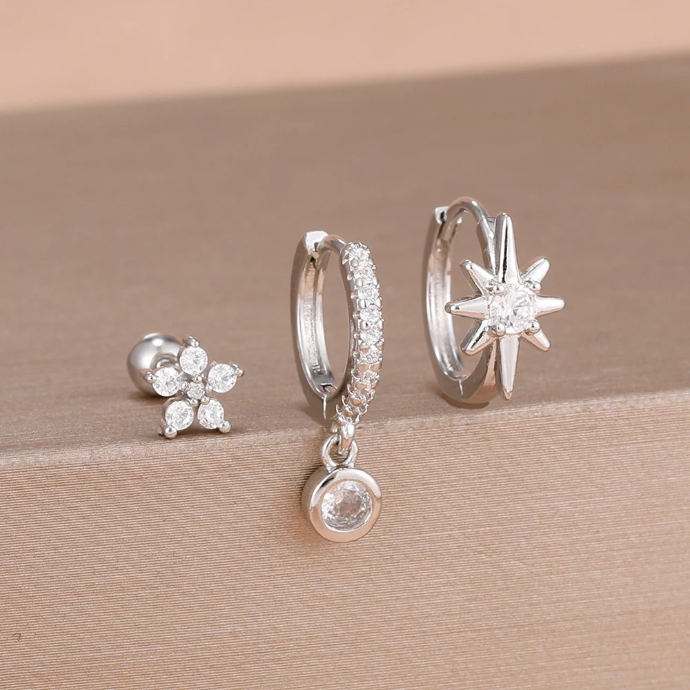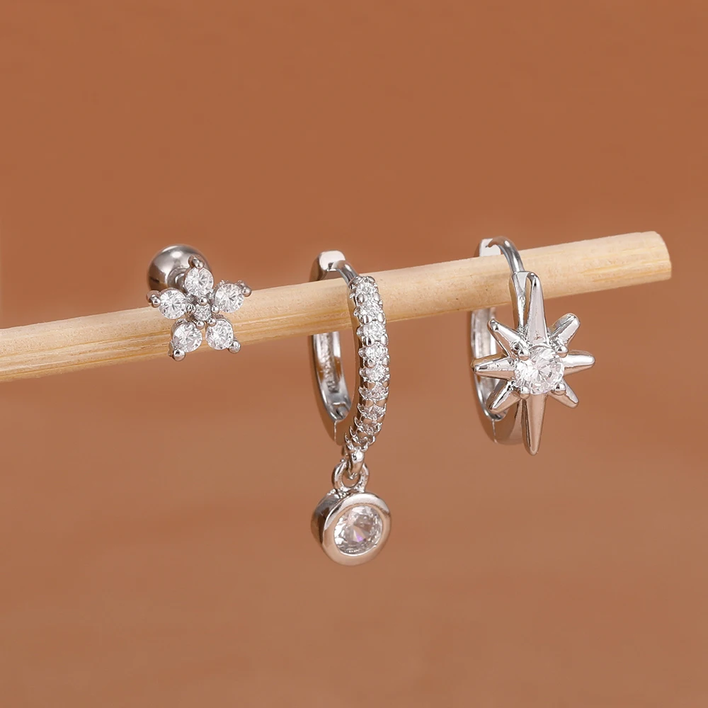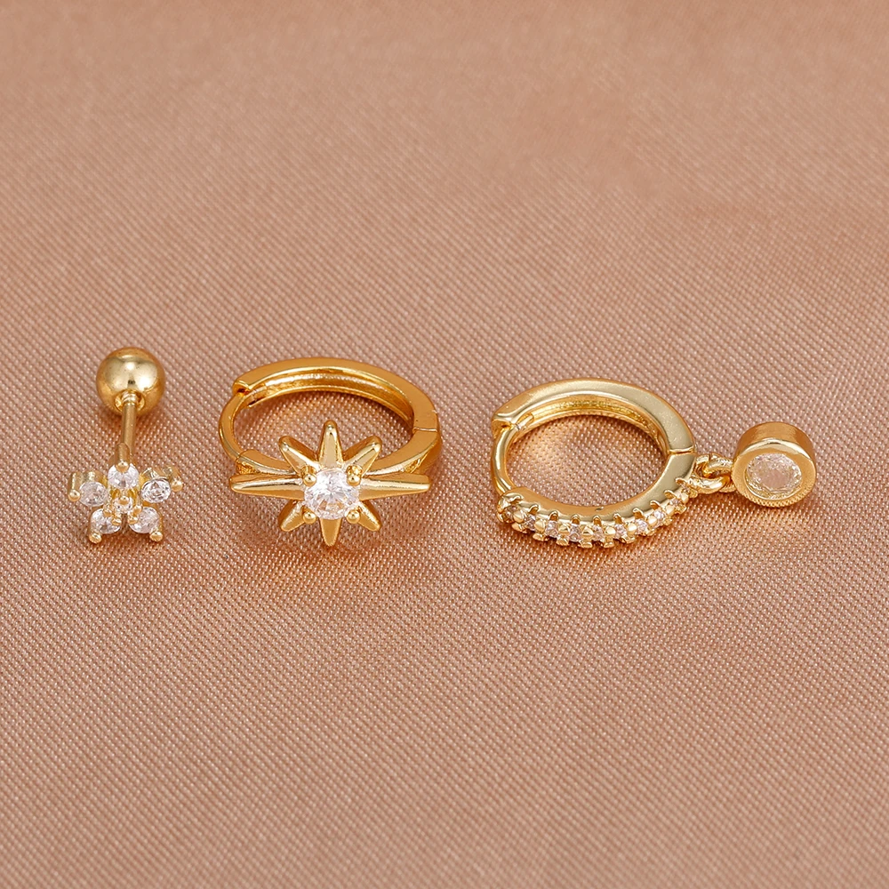 3PCS Shiny Zircon Star Stainless Steel Hoop Earrings Fashion Simple Geometric Hypoallergenic Women’s Earrings Luxury Jewelry
