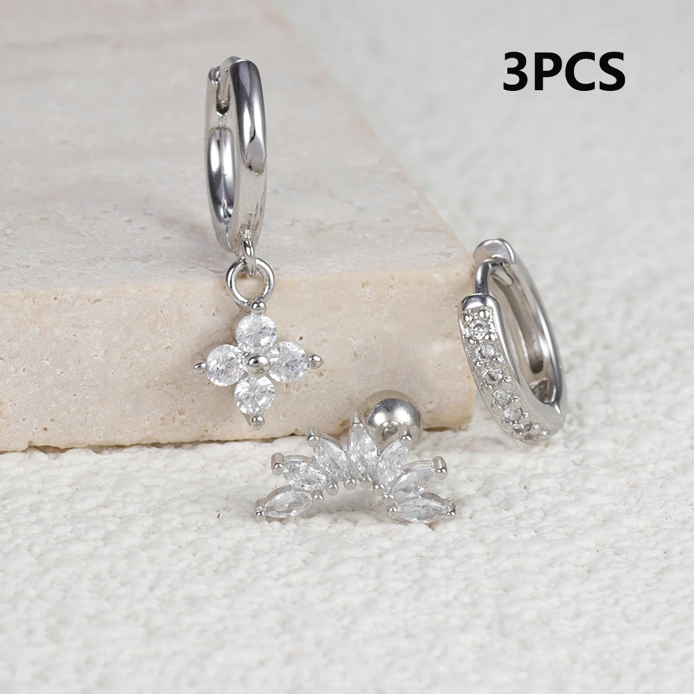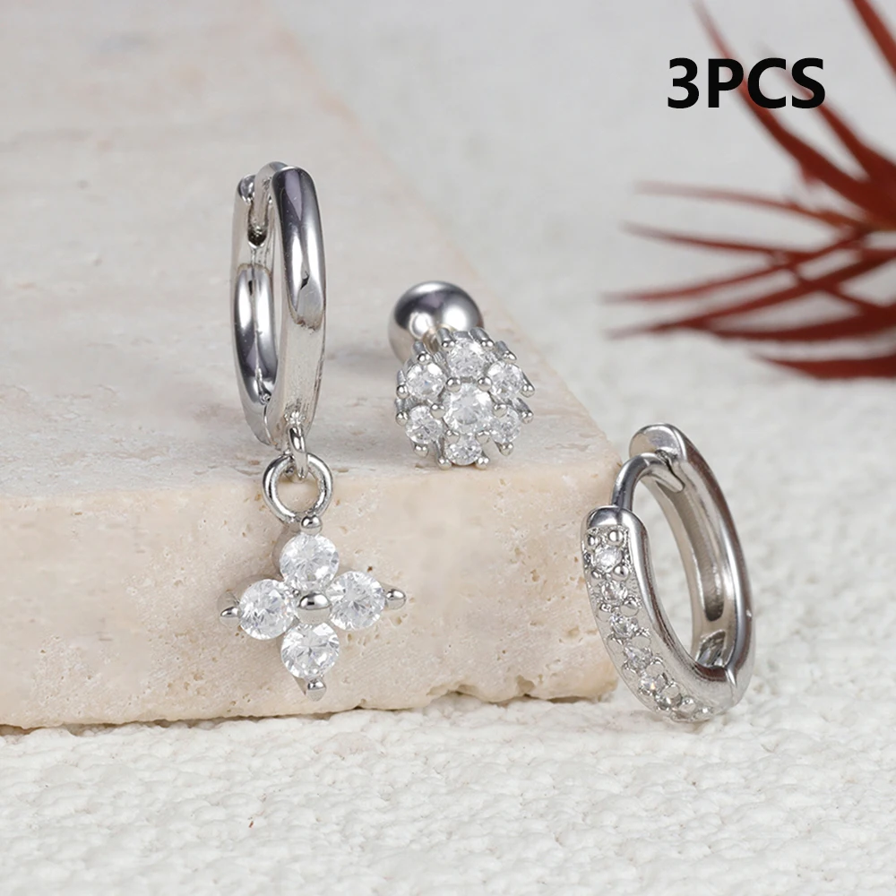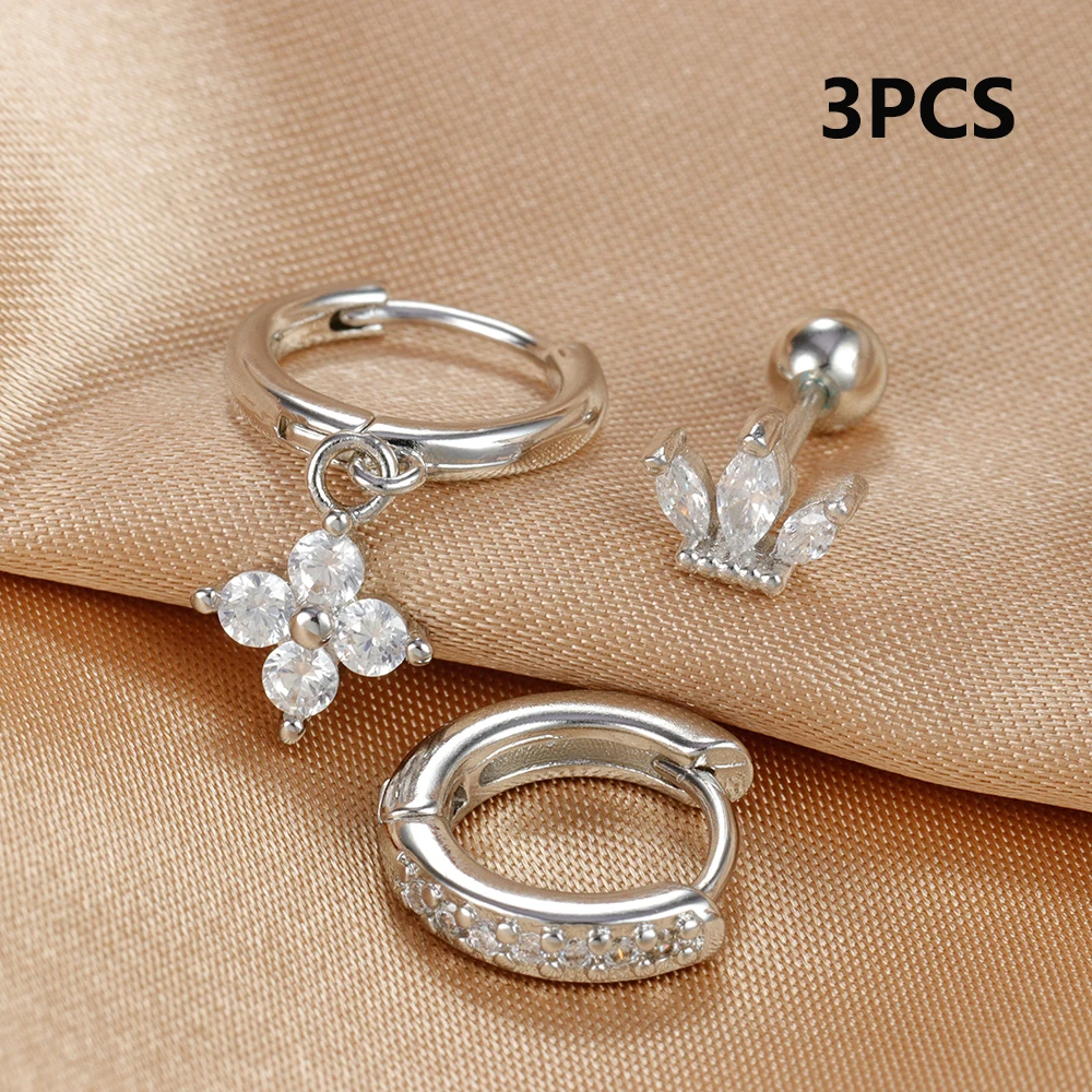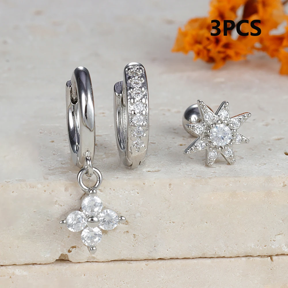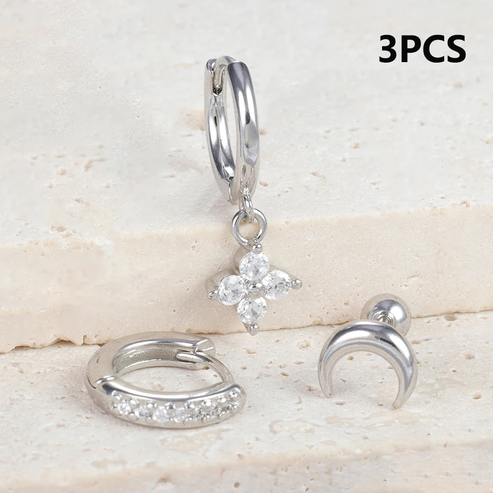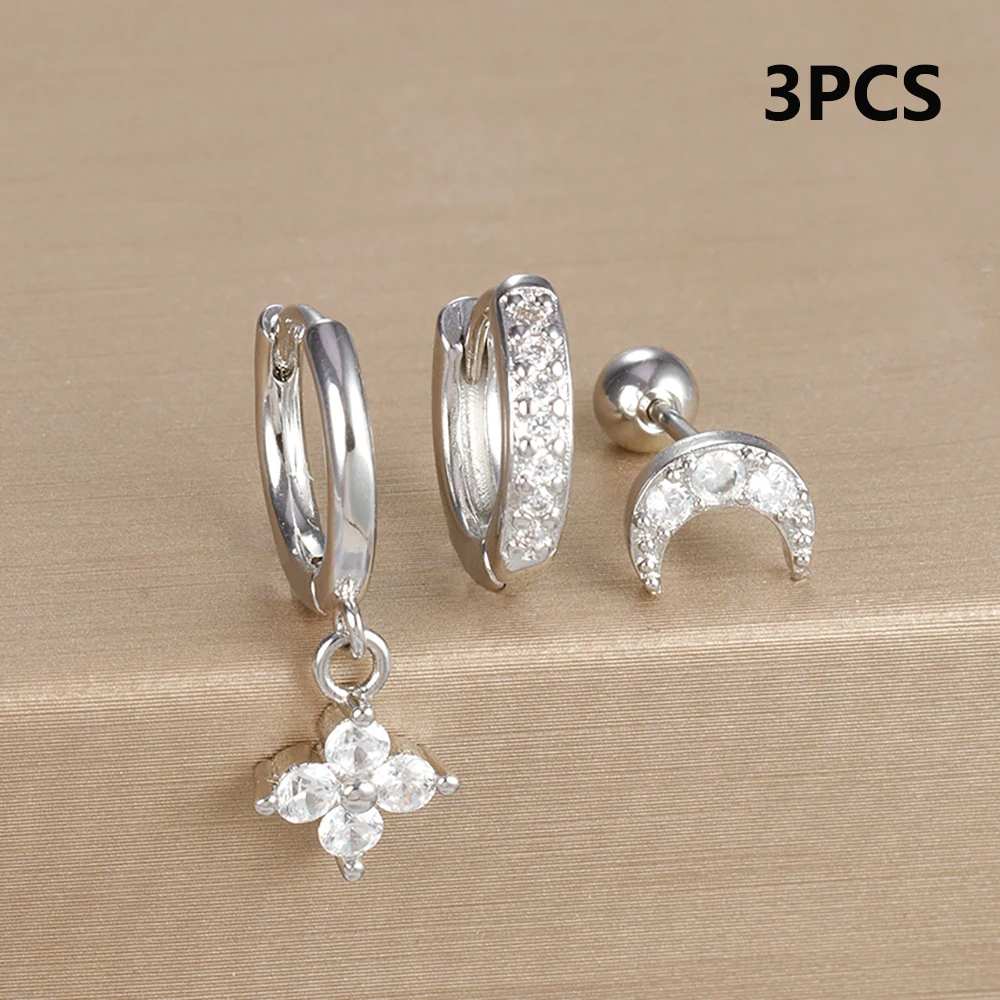 3pcs Silver Color Moon Flower Zircon Small Hoop Earring Small Stainless Steel Cartilage Piercing Earring Woman’s Jewelry Sets