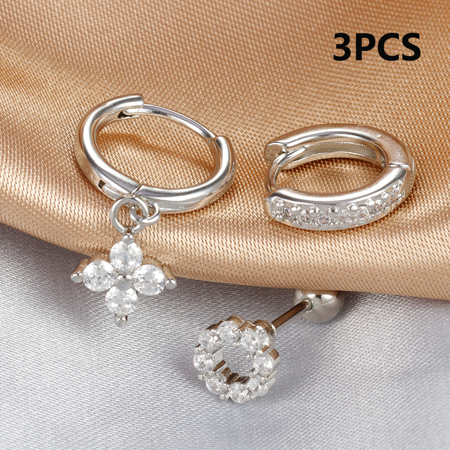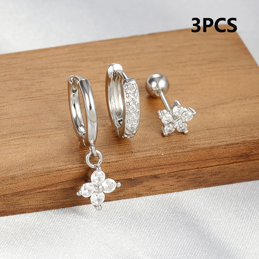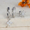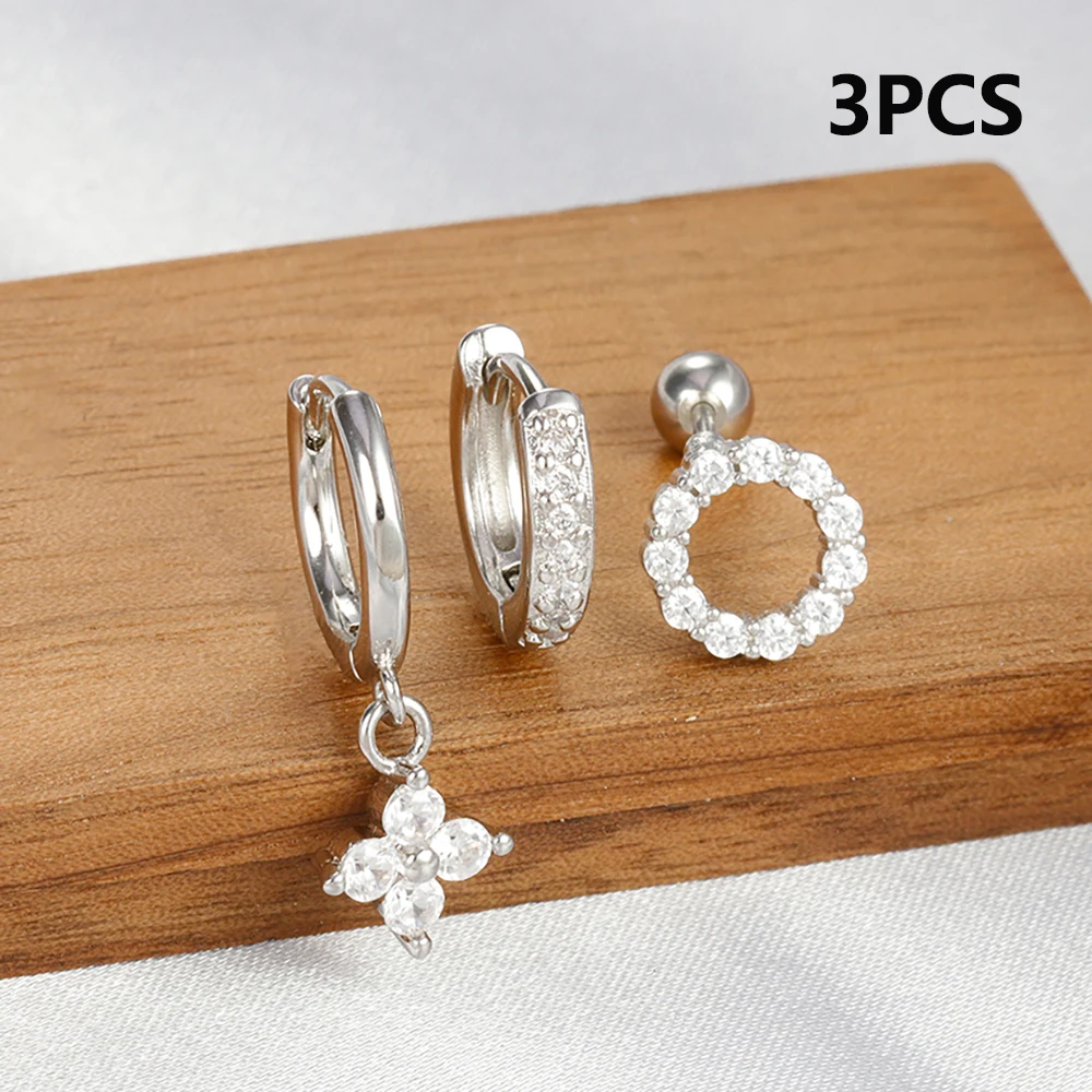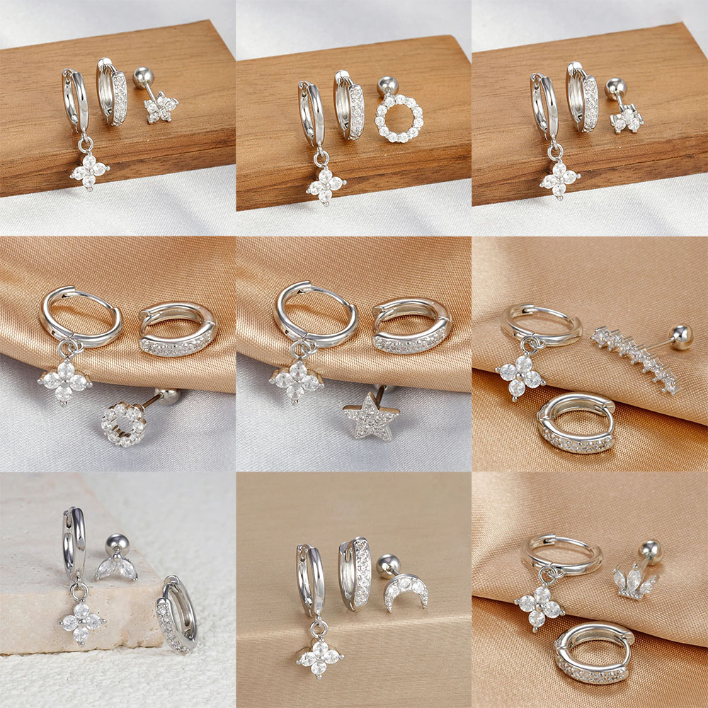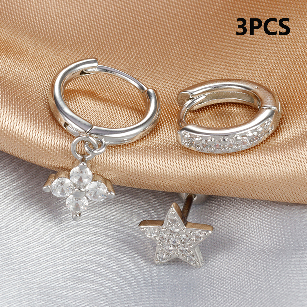 3pcs Silver Color Moon Flower Zircon Small Hoop Earring Small Stainless Steel Cartilage Piercing Earring Woman’s Jewelry Sets