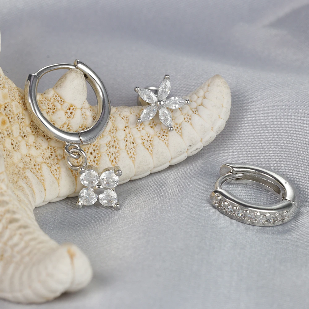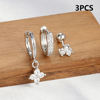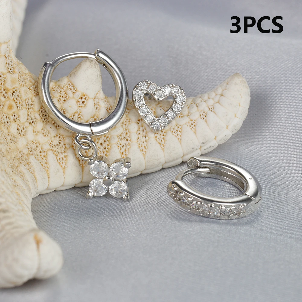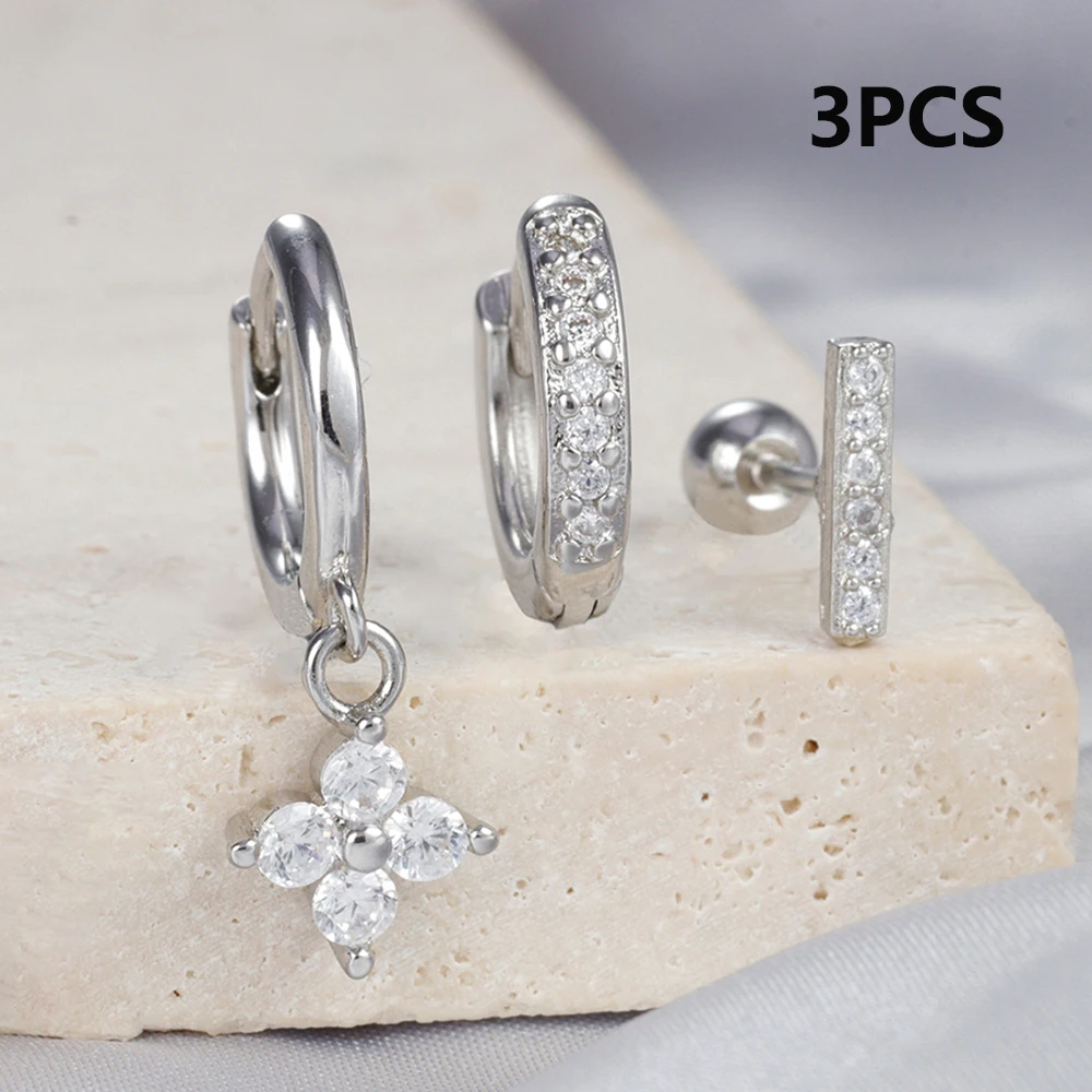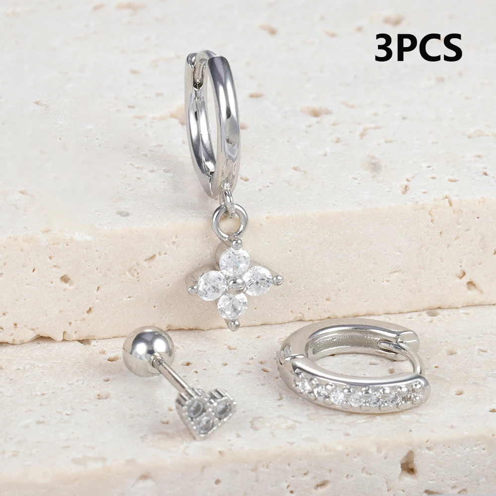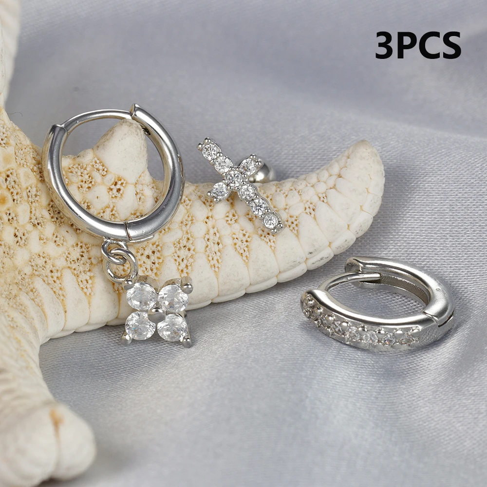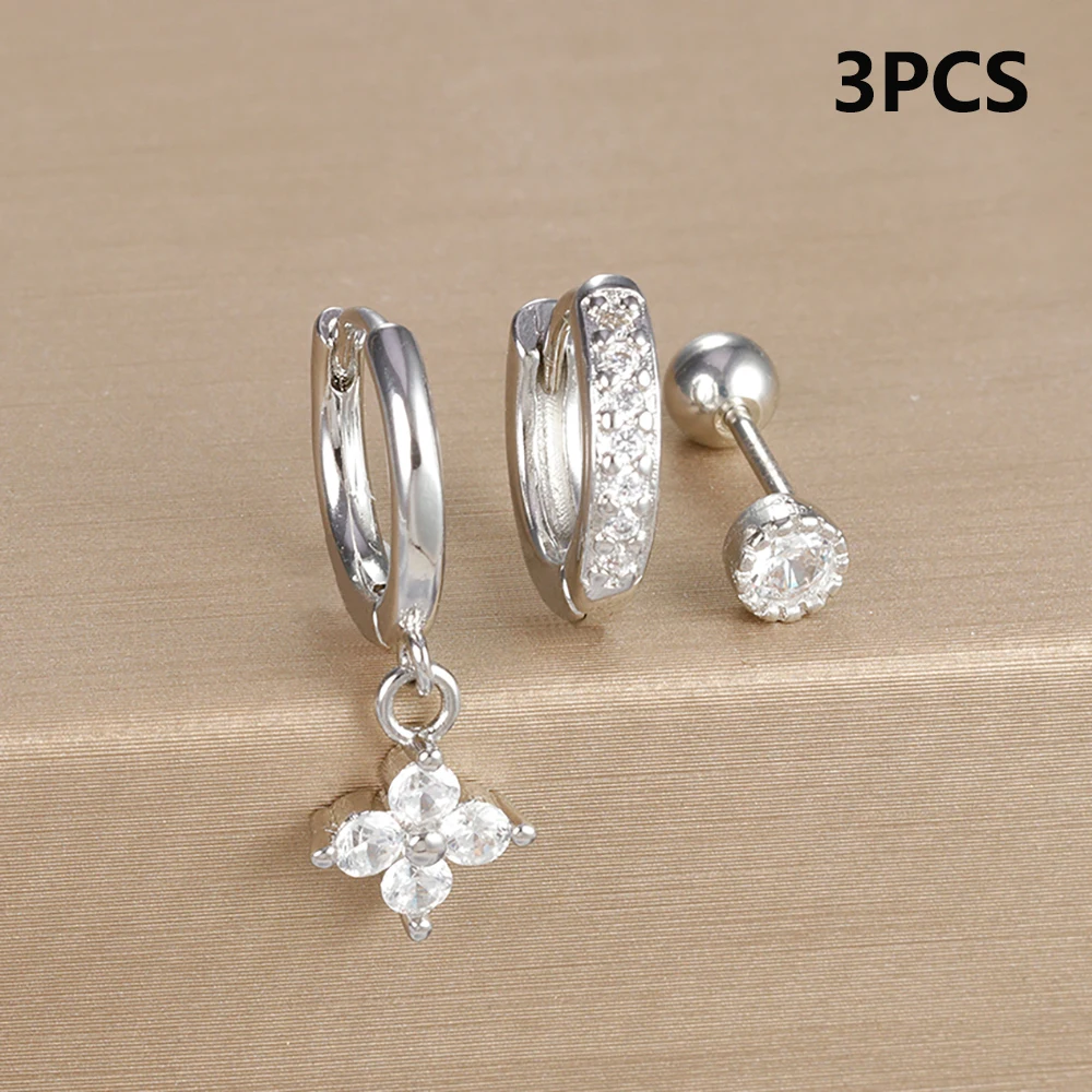 3pcs Silver Color Moon Flower Zircon Small Hoop Earring Small Stainless Steel Cartilage Piercing Earring Woman’s Jewelry Sets