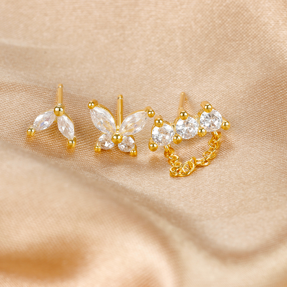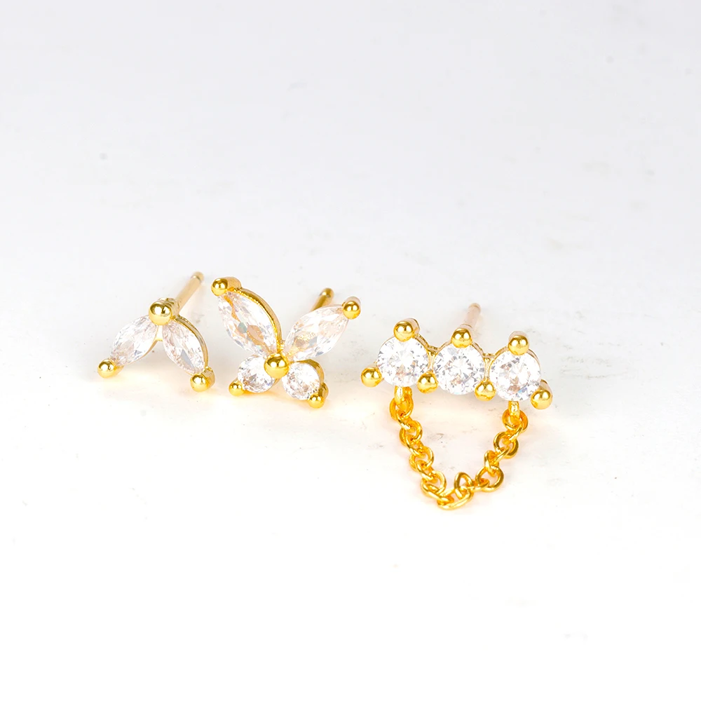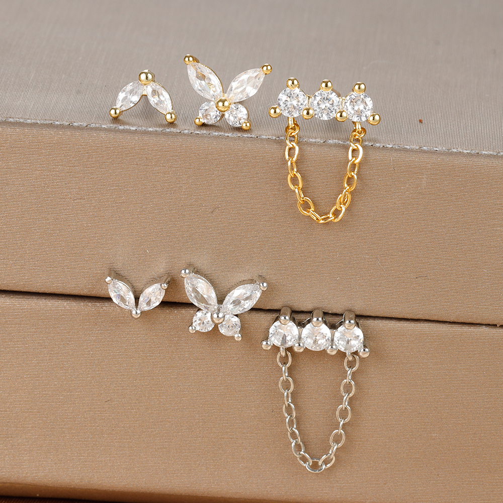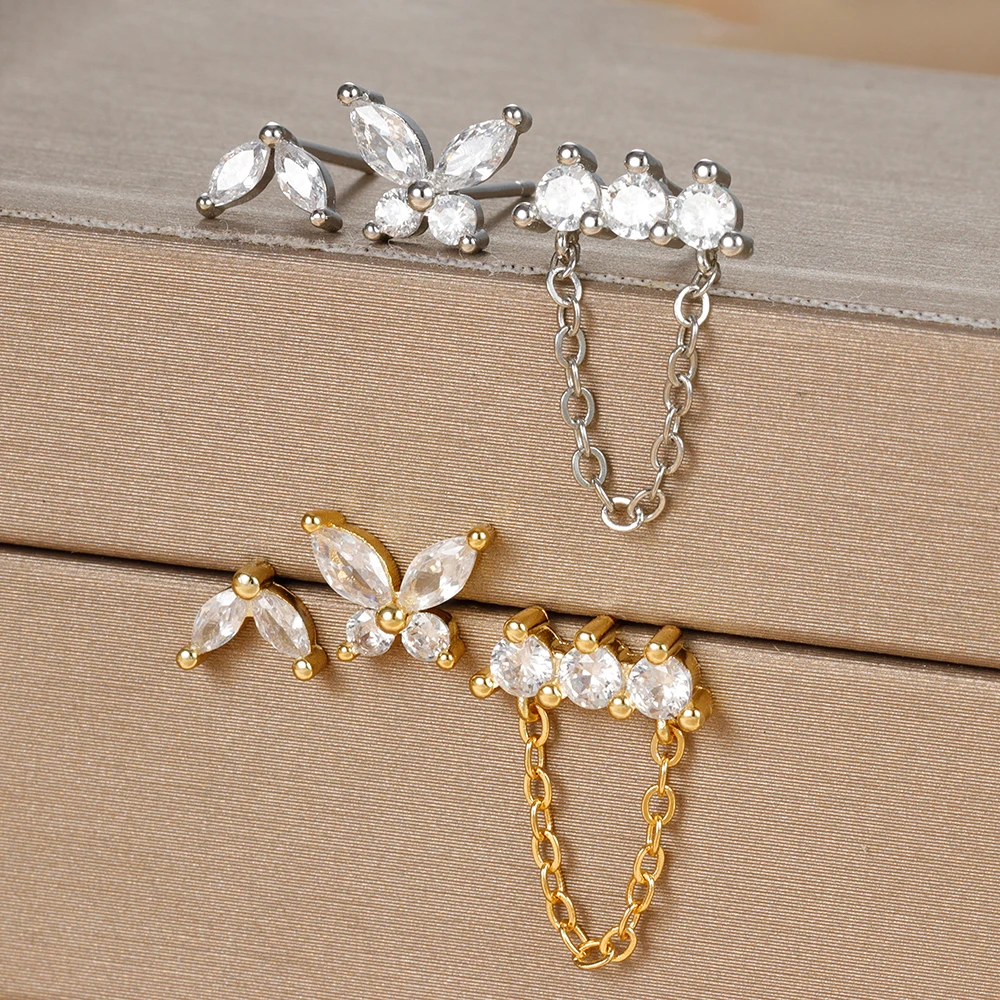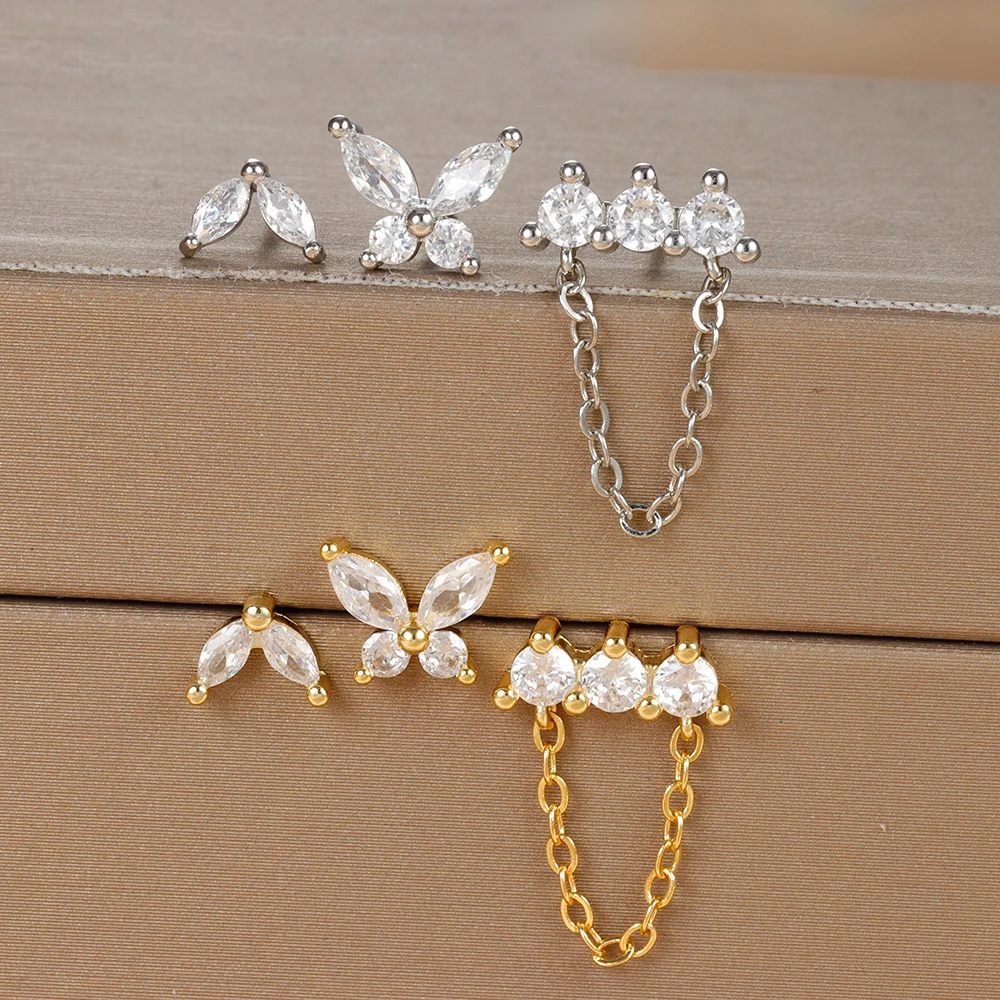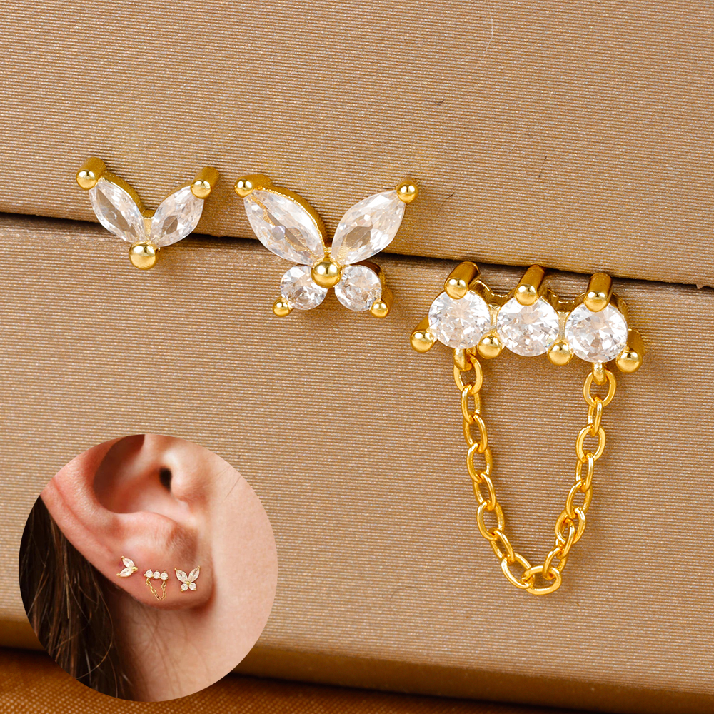3PCS Stainless Steel Butterfly Chain Tassel Earrings Set For Women Crystal Zirconia Cartilage Piercing Earring Wedding Jewelry