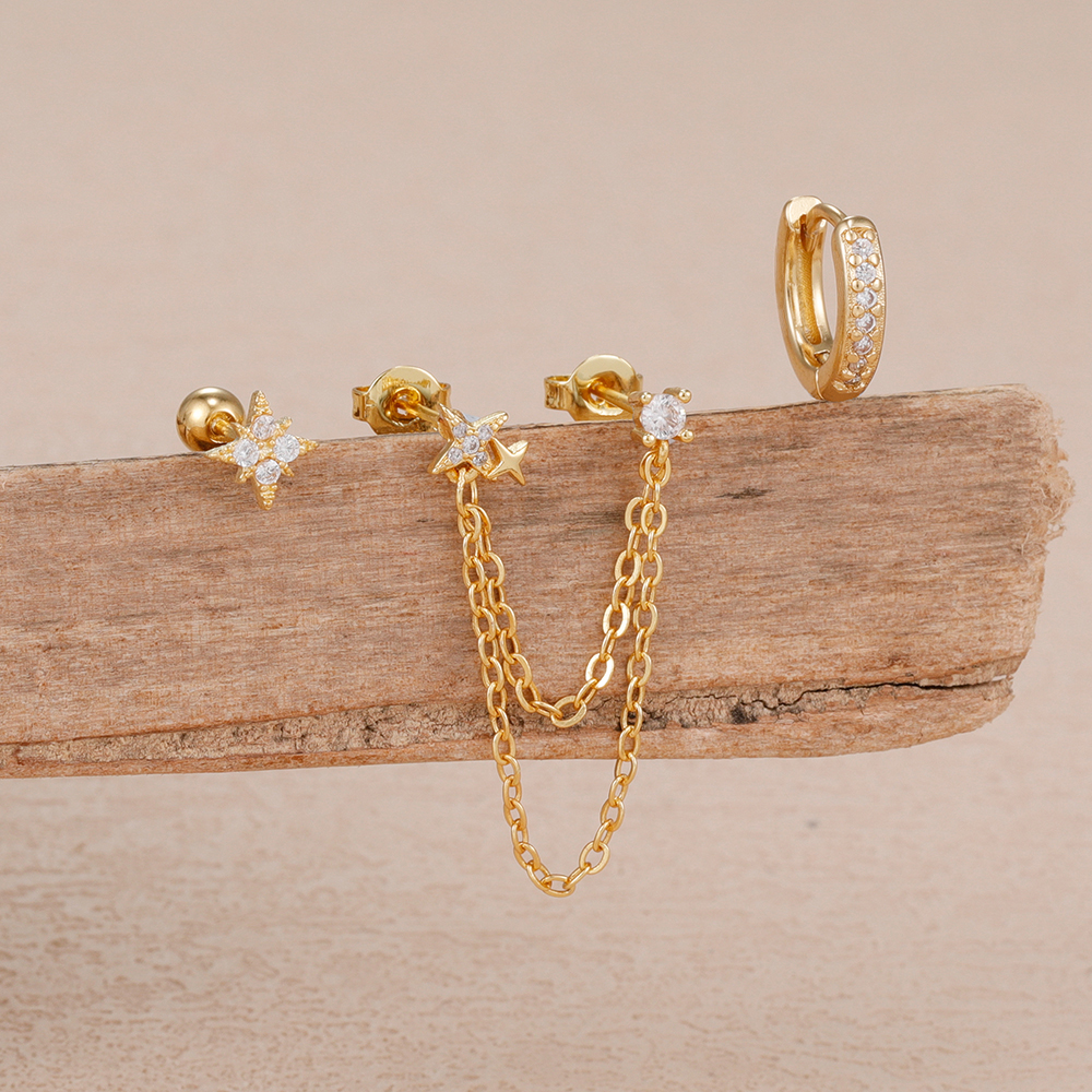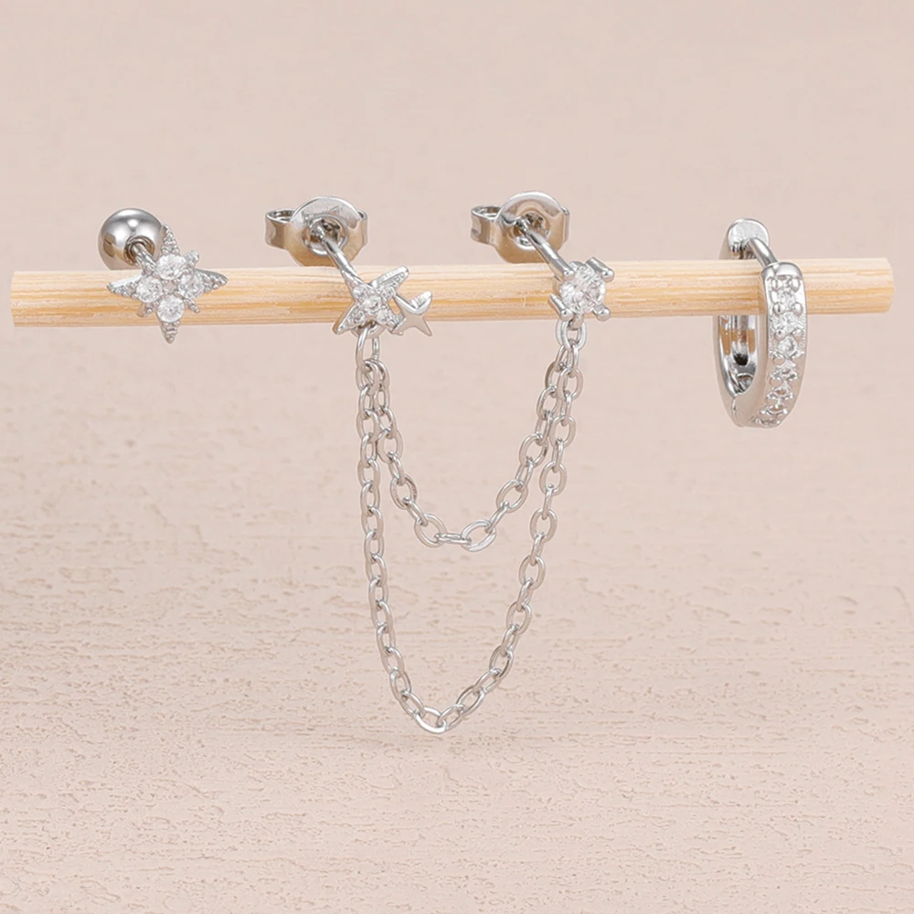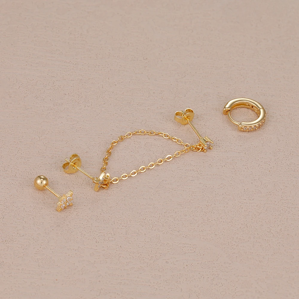 3PCS Stainless Steel Double Hole Chain Star Earrings Set For Women 18K Gold Plated Hypoallergenic Hoop Earring Piercing Jewelry