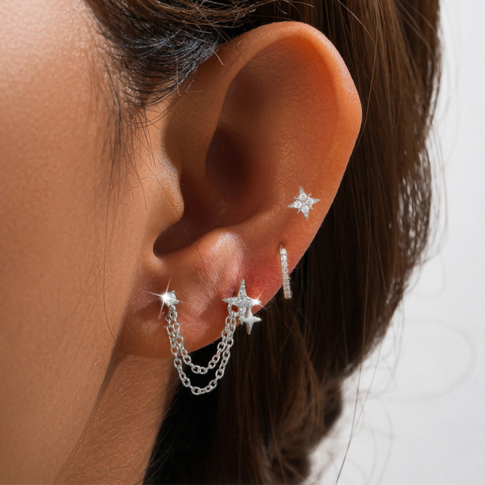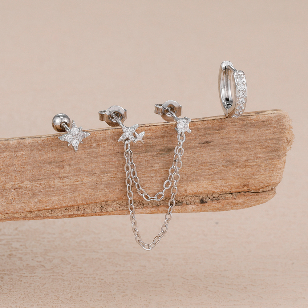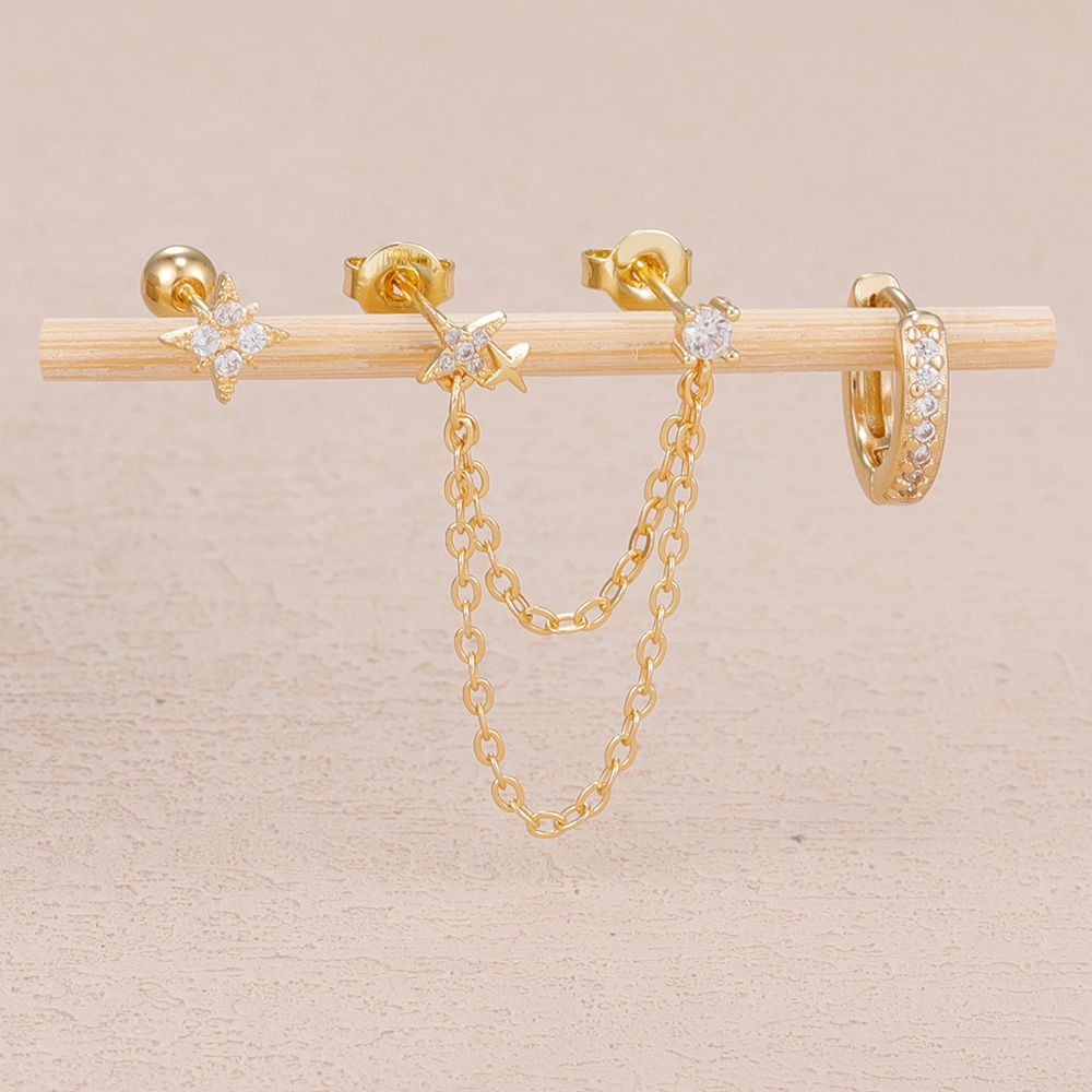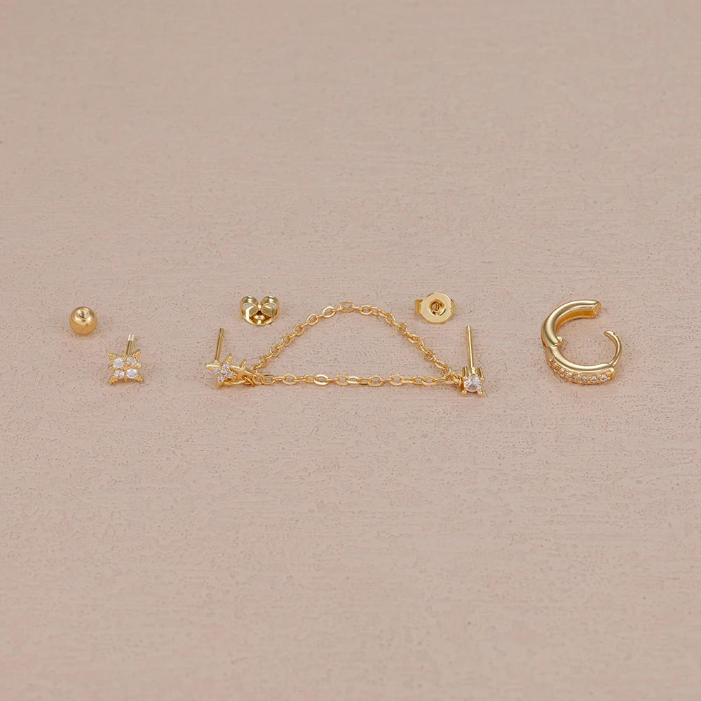 3PCS Stainless Steel Double Hole Chain Star Earrings Set For Women 18K Gold Plated Hypoallergenic Hoop Earring Piercing Jewelry