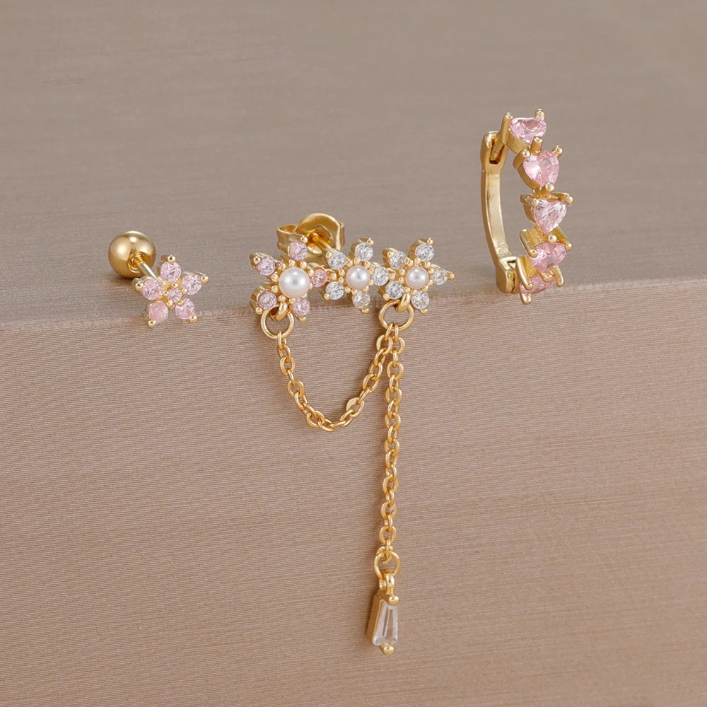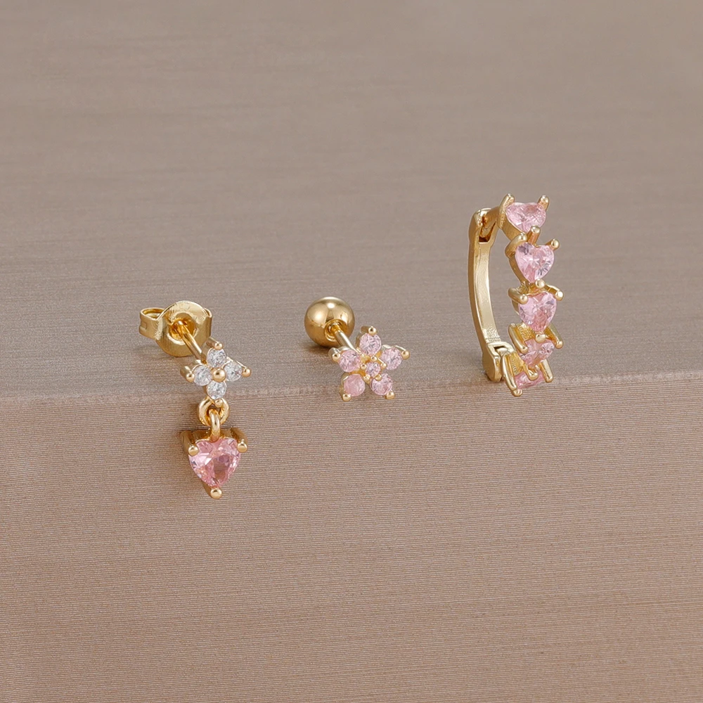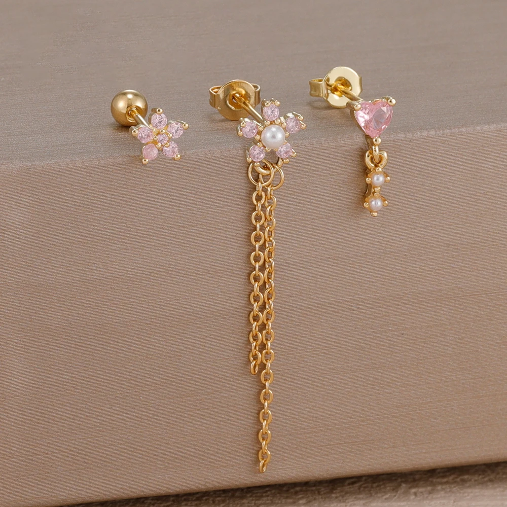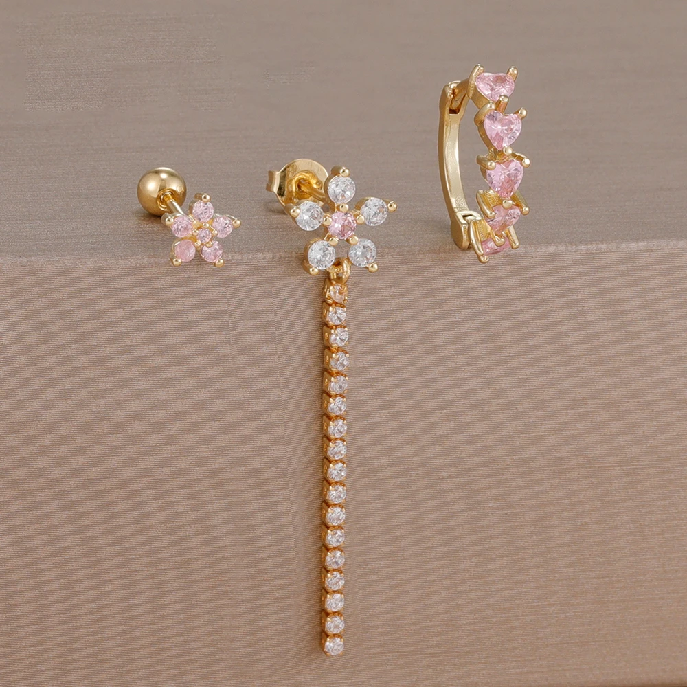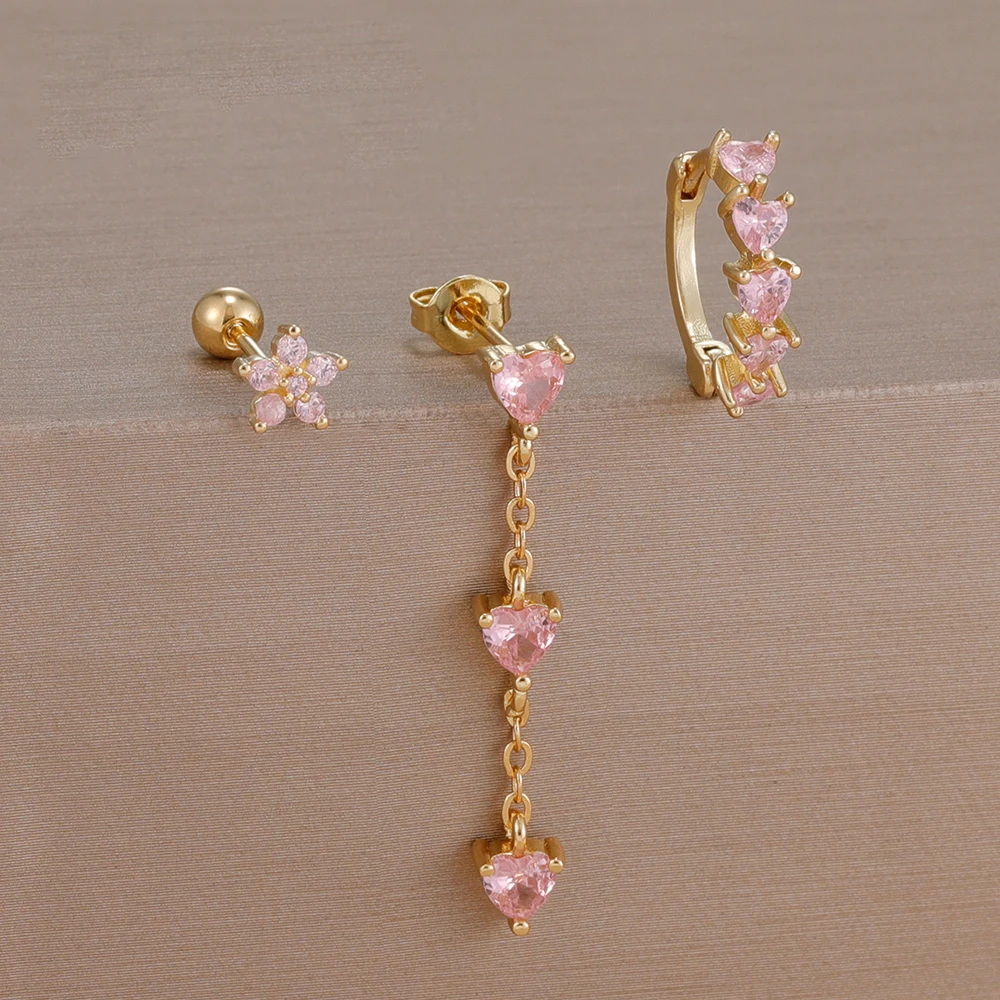 3PCS Stainless Steel Pink Zircon Flower Tassel Piercing Earrings Set For Women Heart-shaped Pendant Hoop Earings Wedding Jewelry