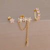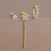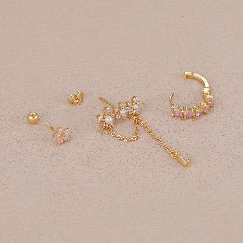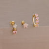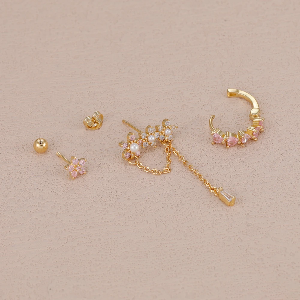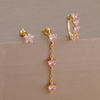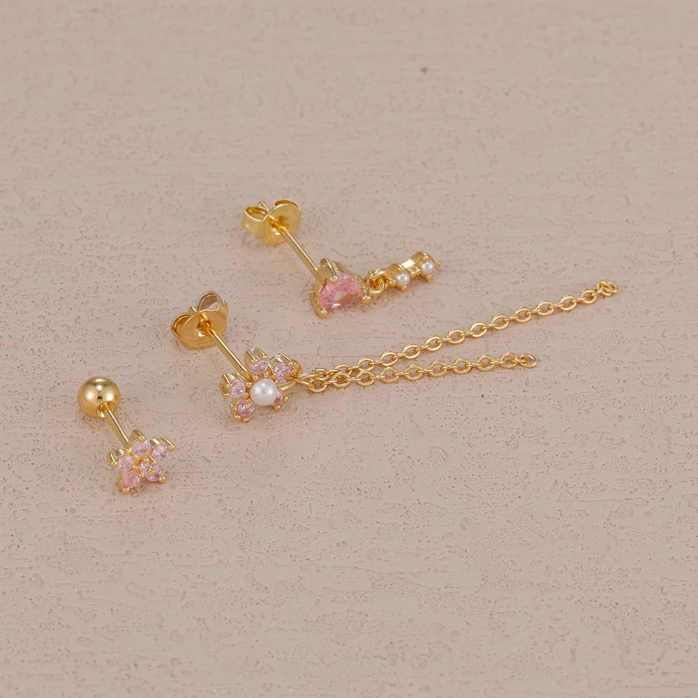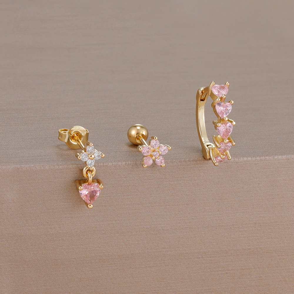 3PCS Stainless Steel Pink Zircon Flower Tassel Piercing Earrings Set For Women Heart-shaped Pendant Hoop Earings Wedding Jewelry