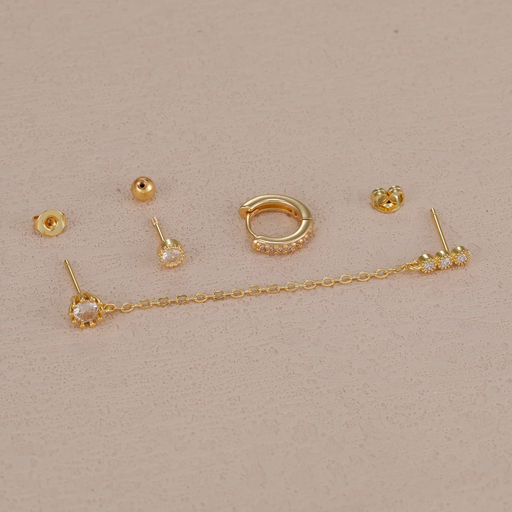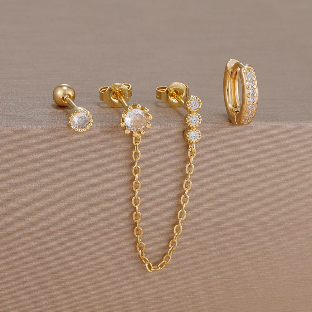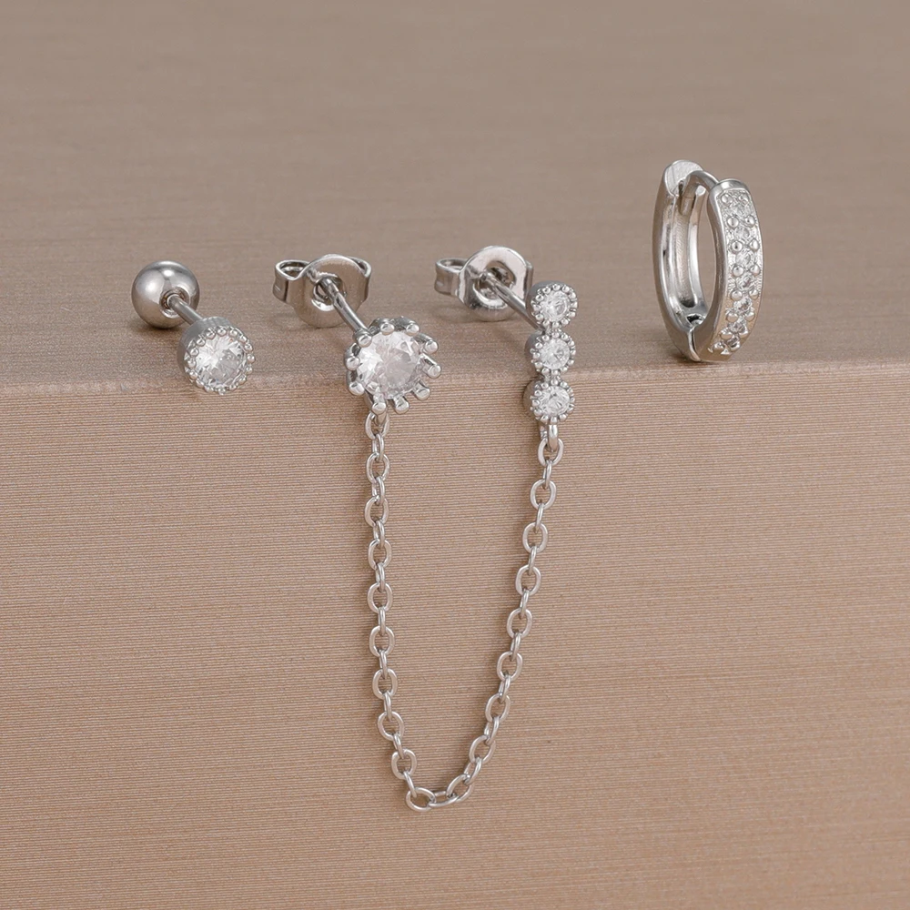 3PCS Vintage Stainless Steel Round Crystal Cylinder Shape Earrings Set For Women Trendy Punk Chain Pendant Hoop Earrings Jewelry