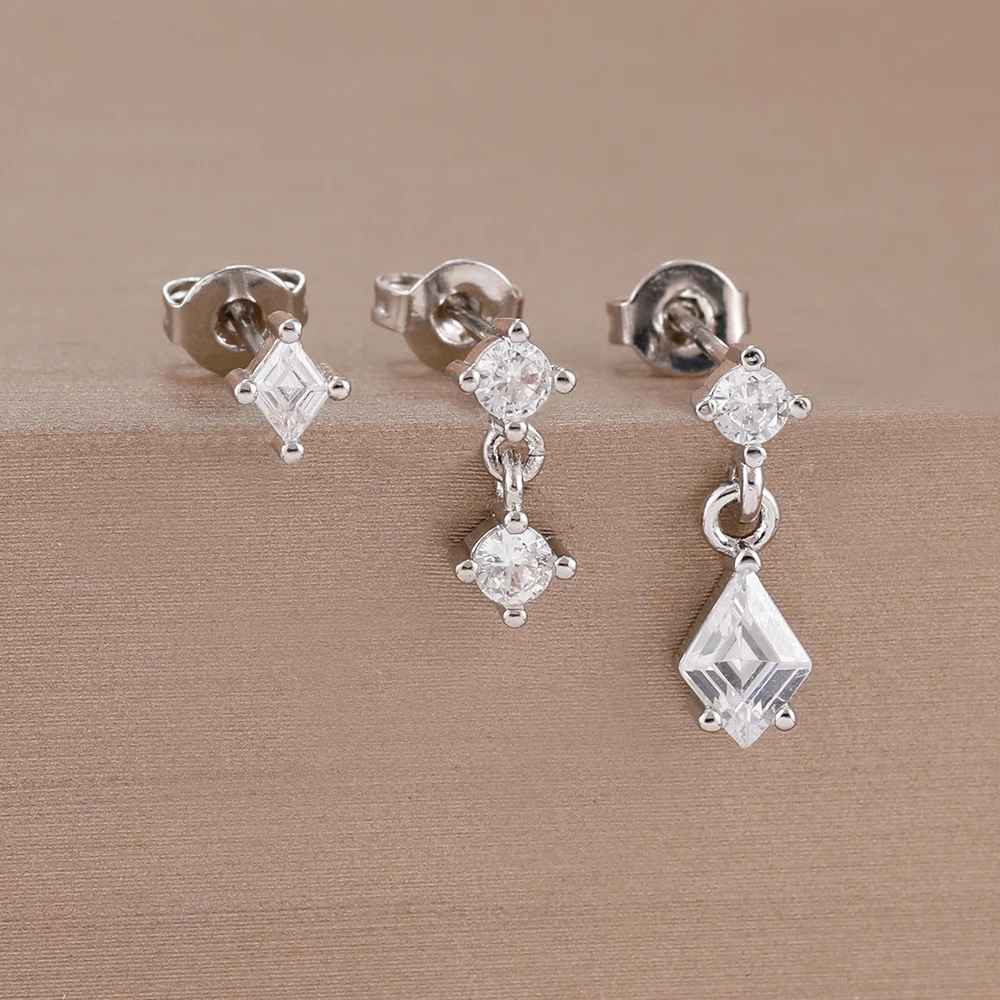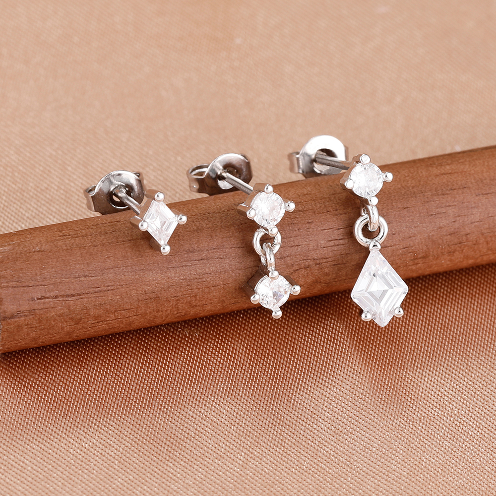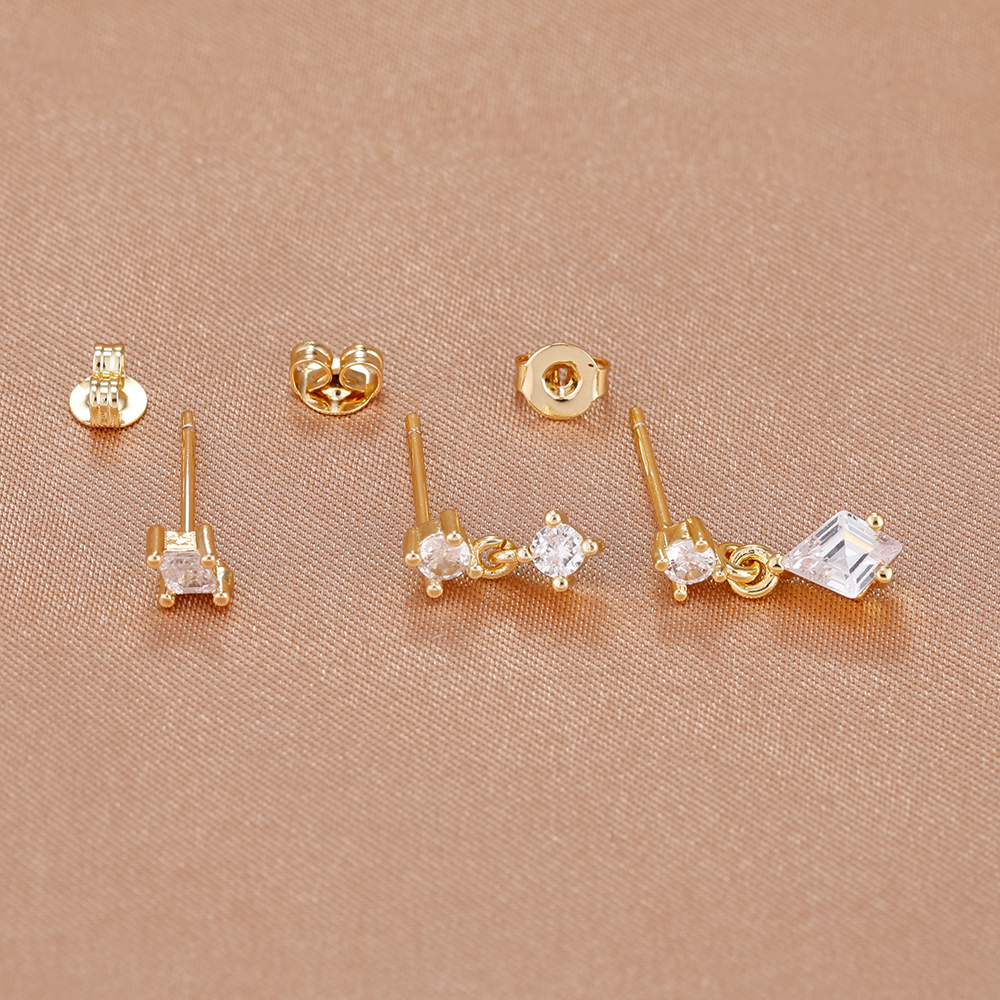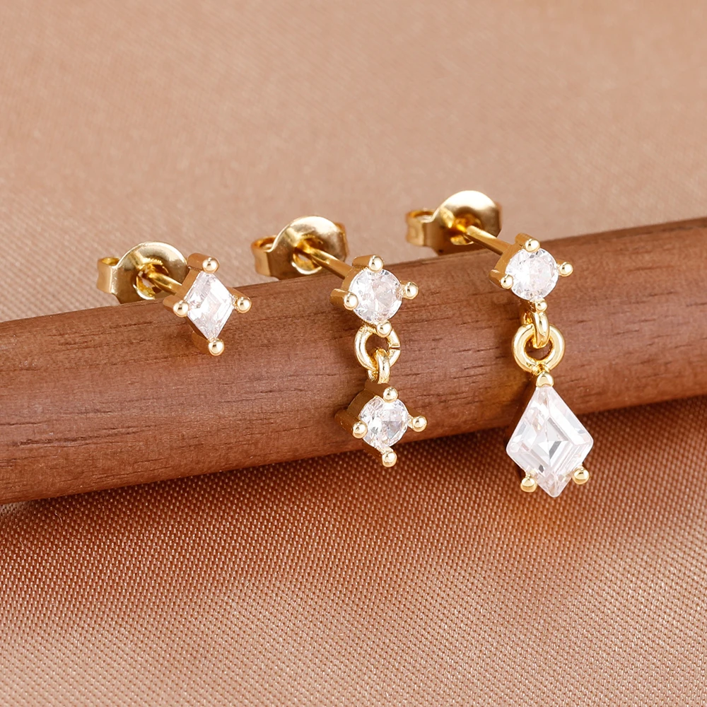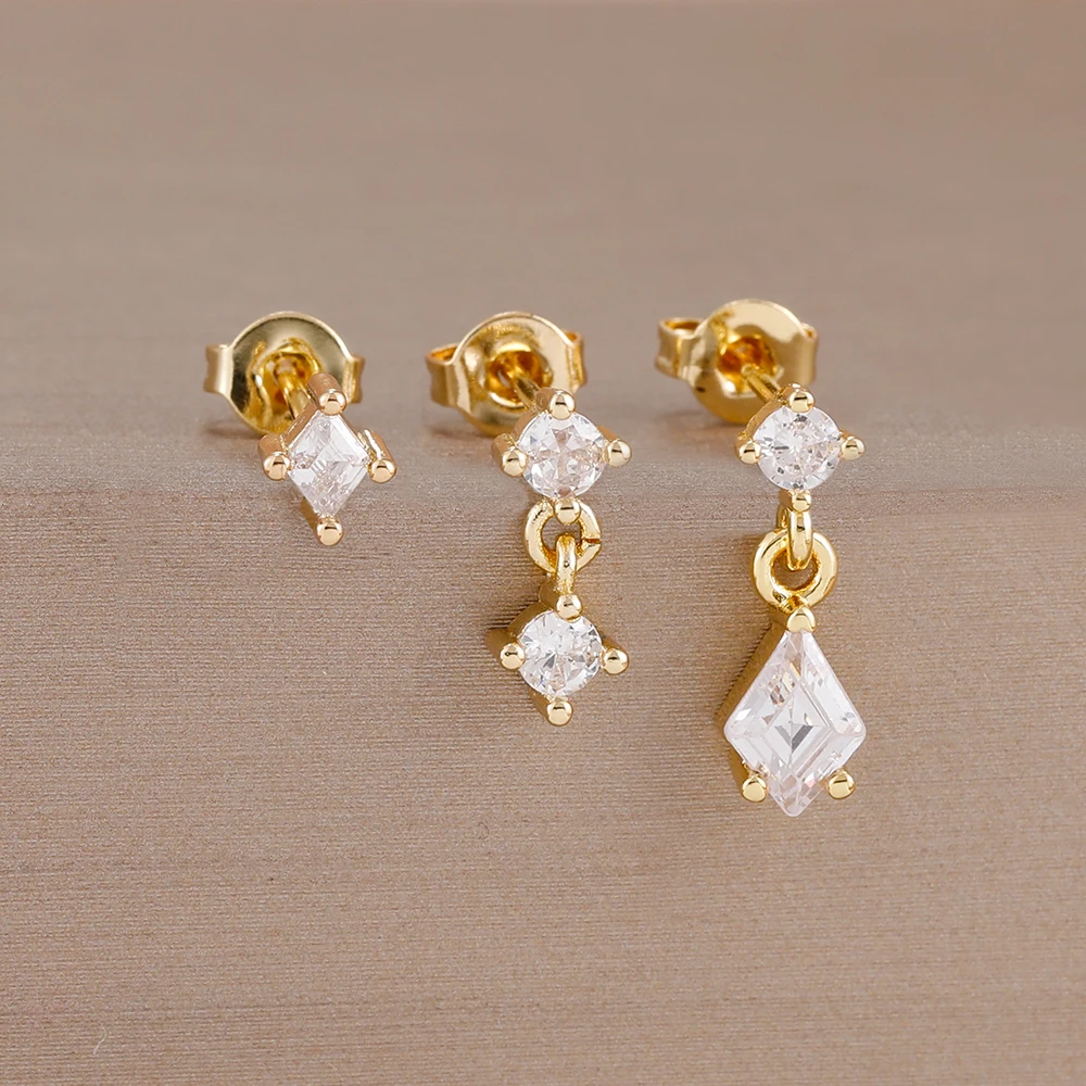 3PCS Women New Rhombus Zircon Pendant Ear Stud Set 14K Plated Gold Simple Temperament Light Luxury Earrings Jewelry
