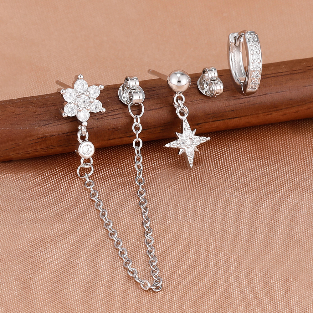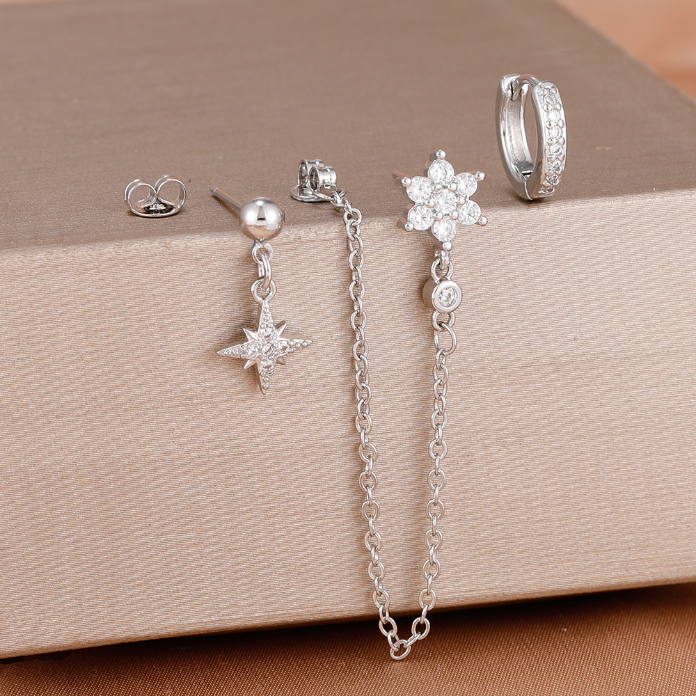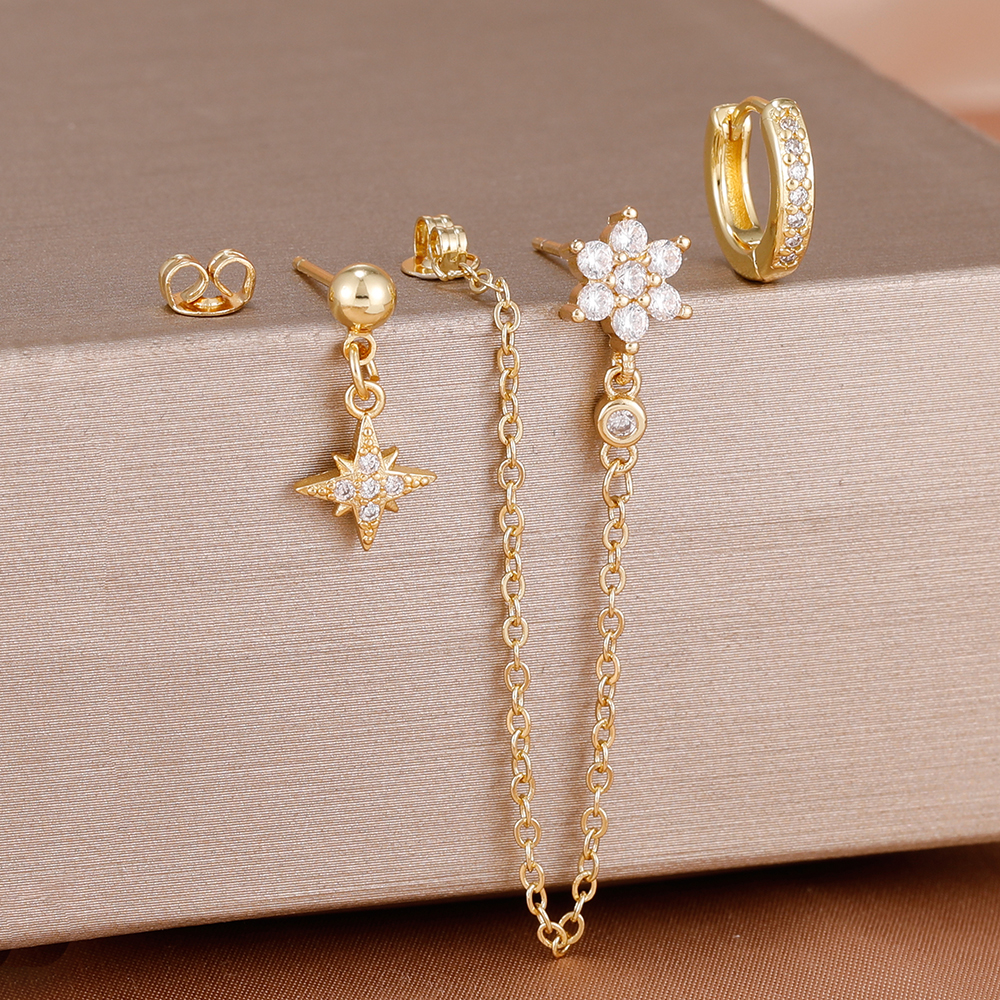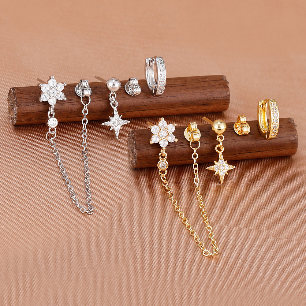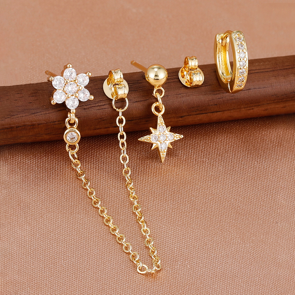 Fast delivery and prettier in person. The set arrived very quickly and matches the listing. In person the earrings look more delicate and nicer than photos can show. I used my own display box for the pics since they came in a small zip bag. The dangling ones have butterfly backs and the hoop has a hinged clasp. Good quality and i’m happy with the purchase.