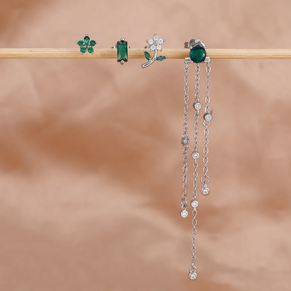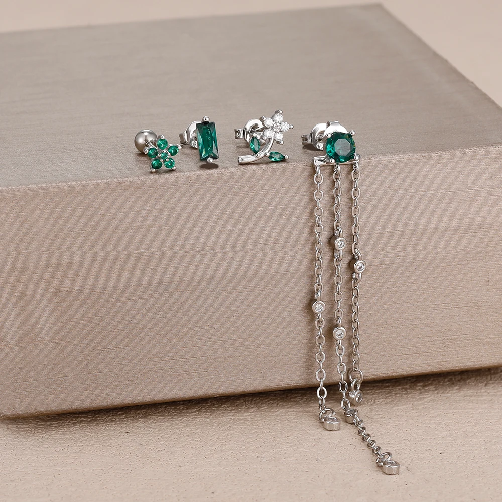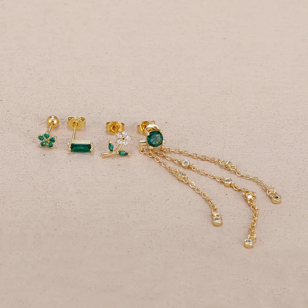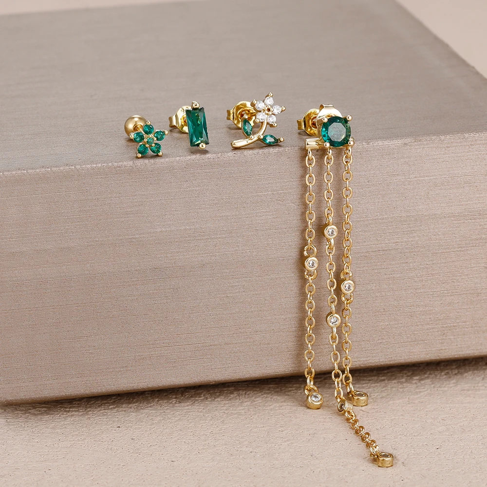 4PCS Green Zircon Tassel Chain Stainless Steel Ear Stud Earrings Set 18K Gold Plated Flower Piercing Earrings Fashion Jewelry