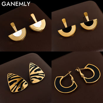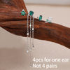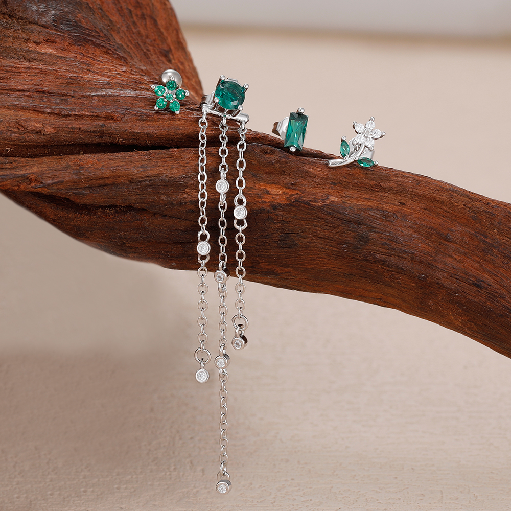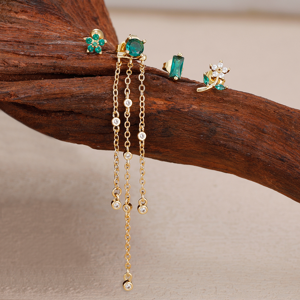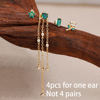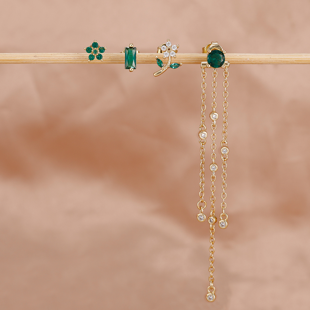 4PCS Green Zircon Tassel Chain Stainless Steel Ear Stud Earrings Set 18K Gold Plated Flower Piercing Earrings Fashion Jewelry