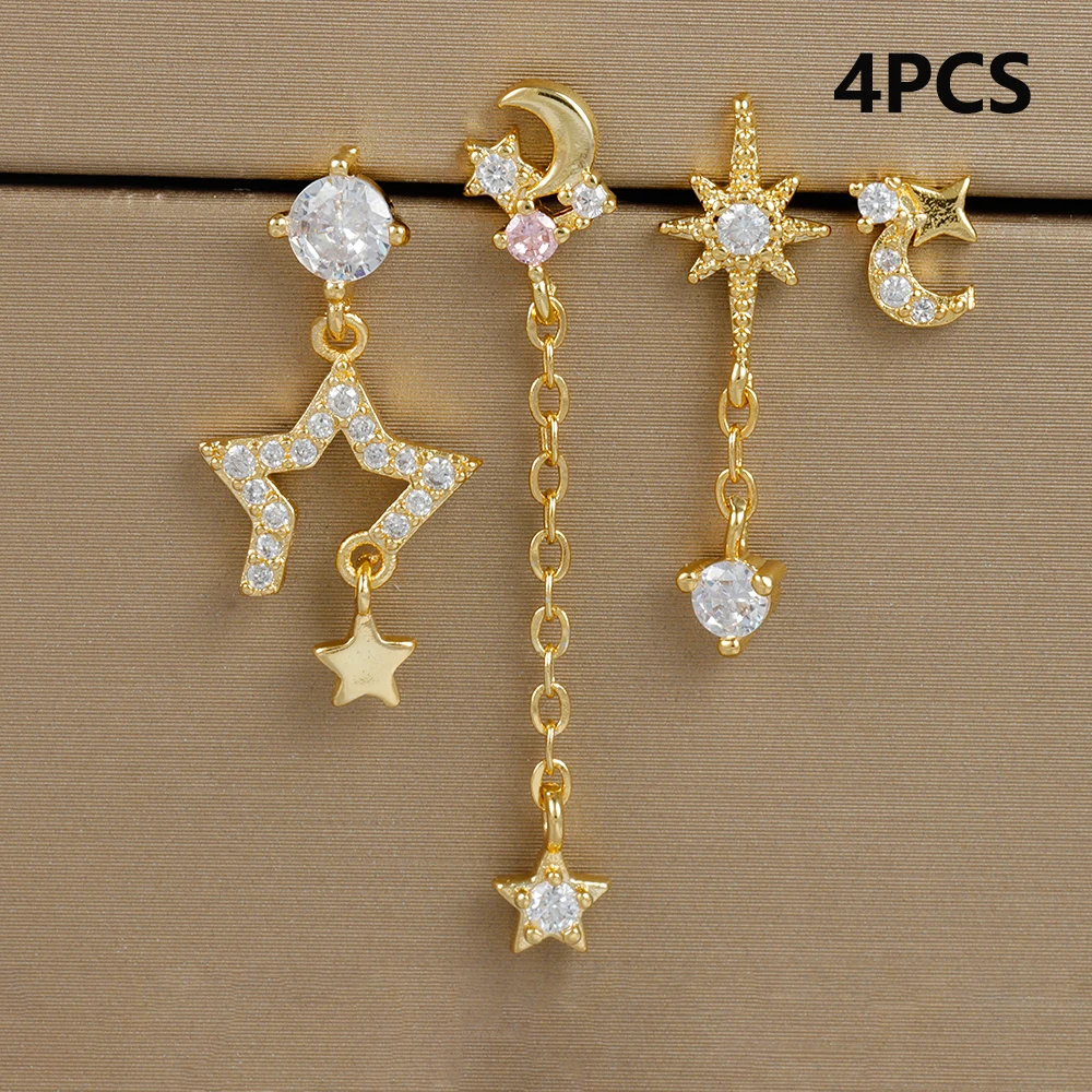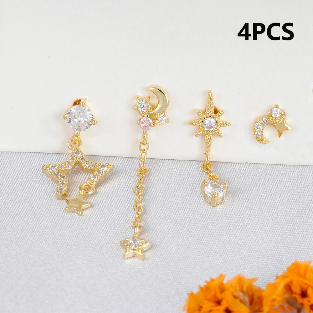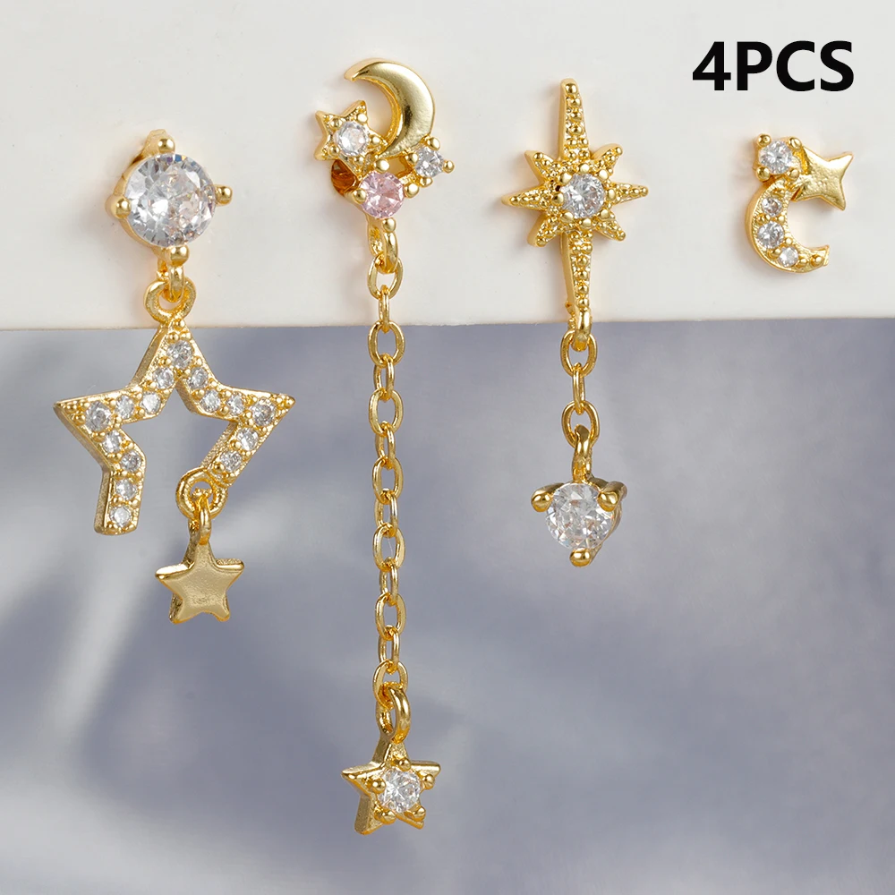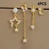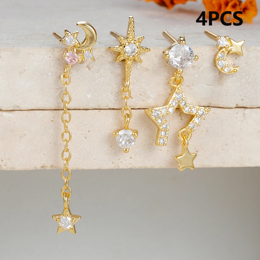 4PCS Stainless Steel Moon Star Tiny Ear Stud Earrings Set for Women Student Teen Chain Small Piercing Earring Jewelry Pendientes