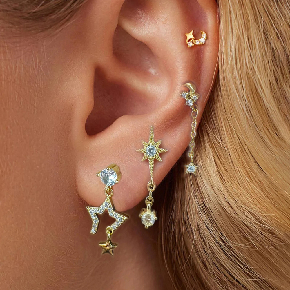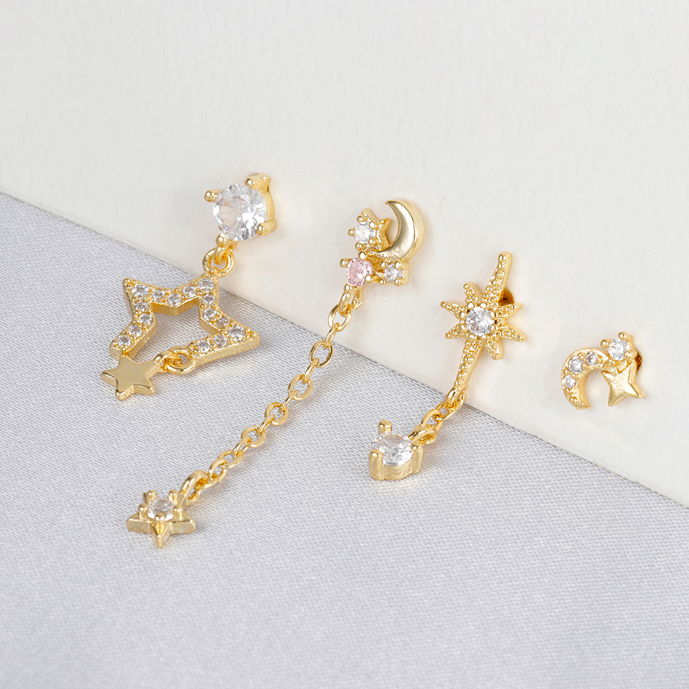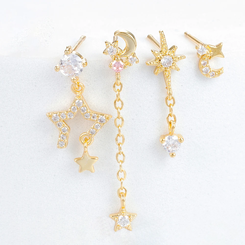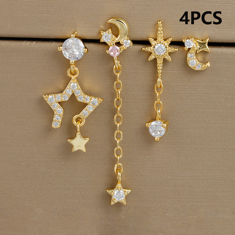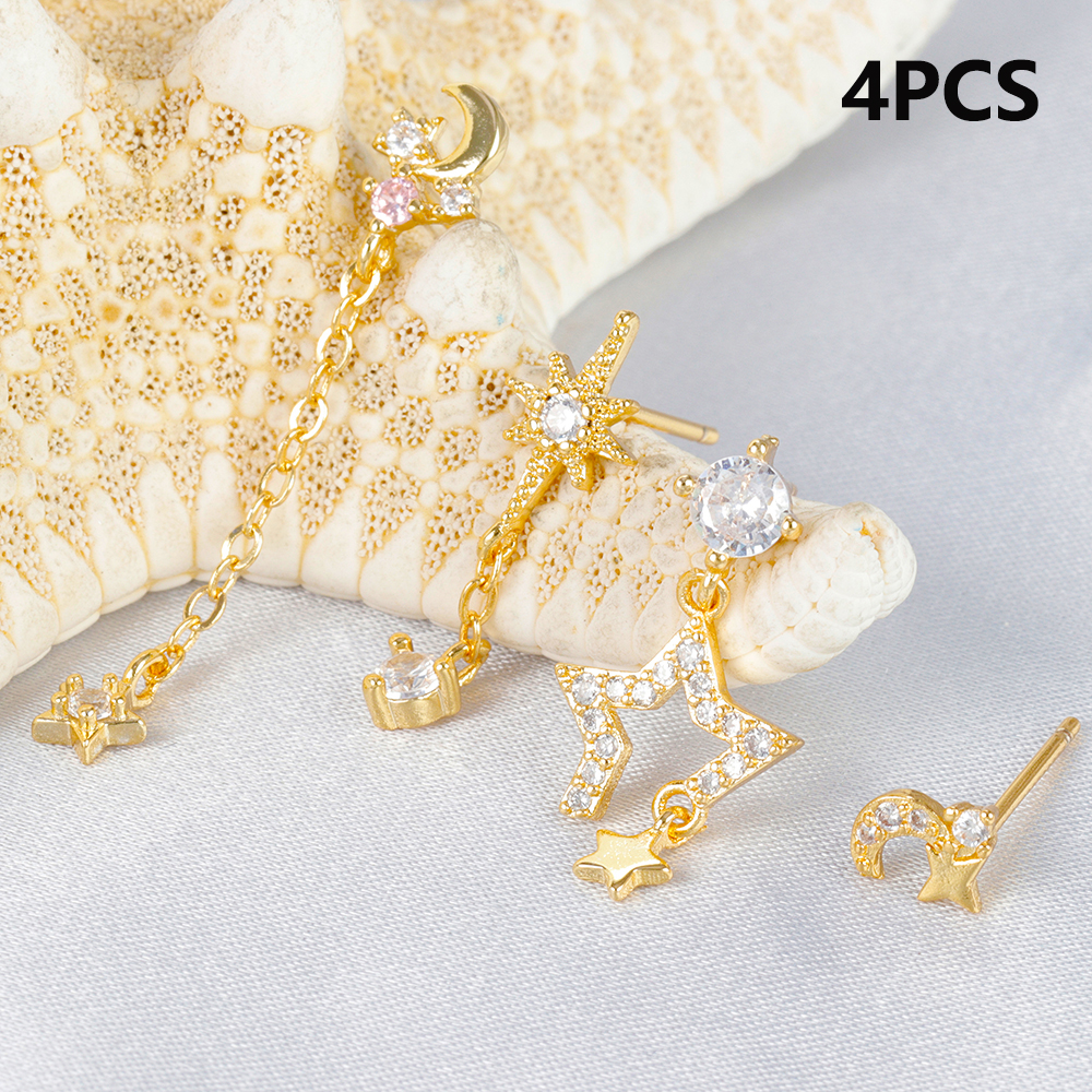4PCS Stainless Steel Moon Star Tiny Ear Stud Earrings Set for Women Student Teen Chain Small Piercing Earring Jewelry Pendientes