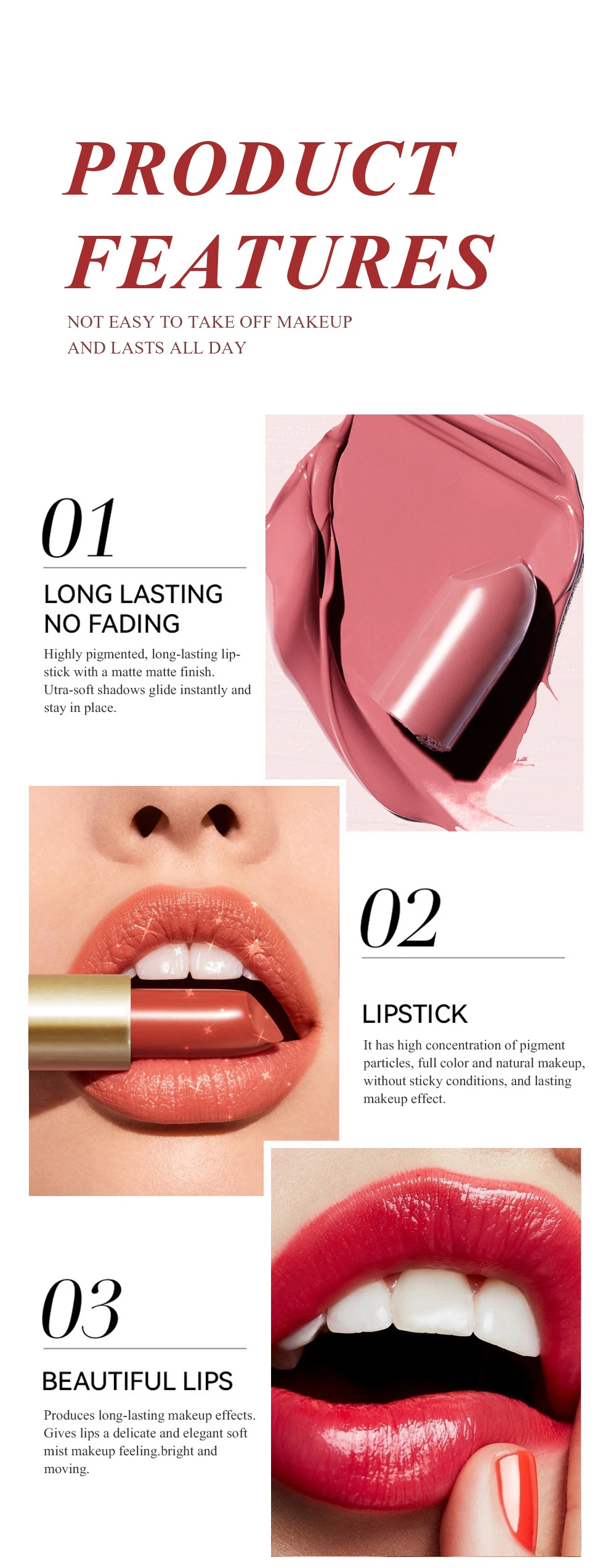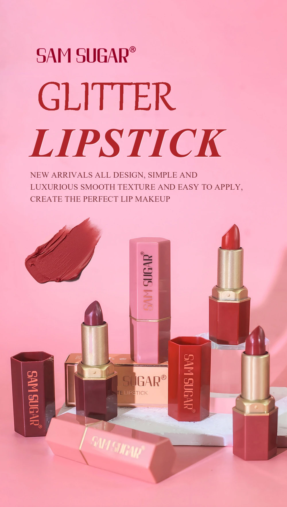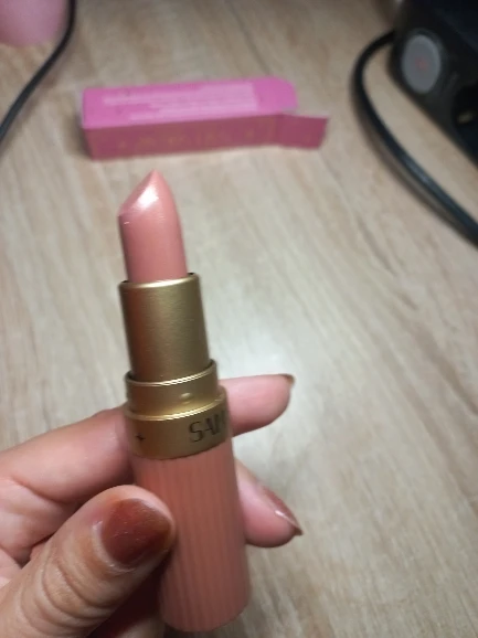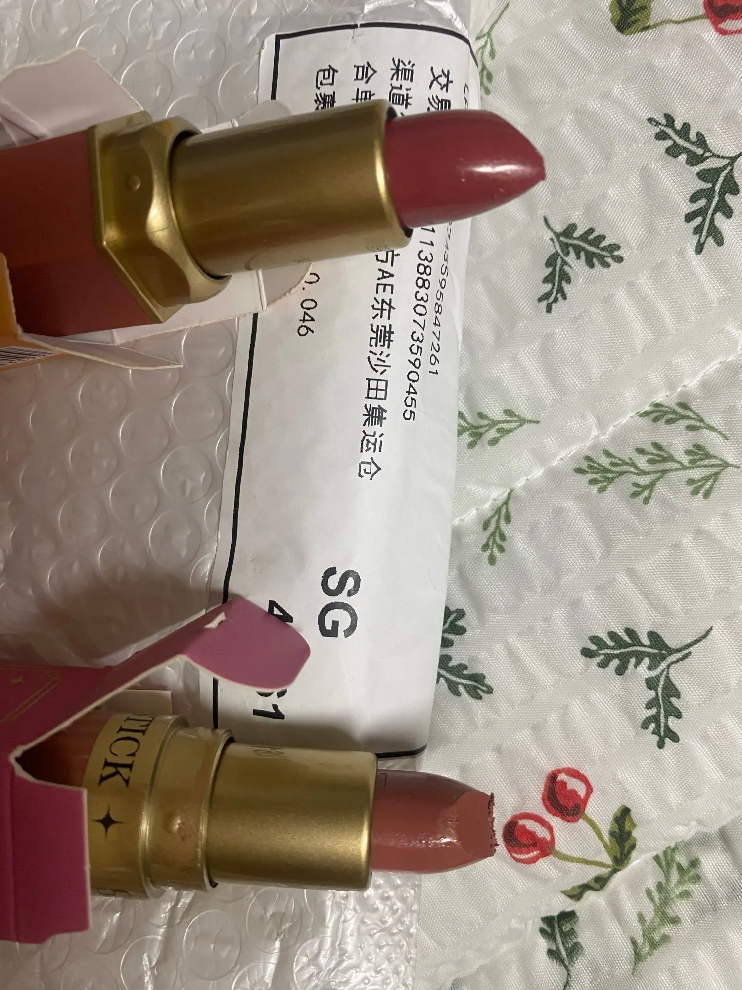 The lipstick color is pretty, but the actual color doesn't show much glitter like in the photo. The lipstick was individually wrapped in plastic packaging, so I thought there would be no problem with the product. However, the top of the lipstick came crushed against the lid.