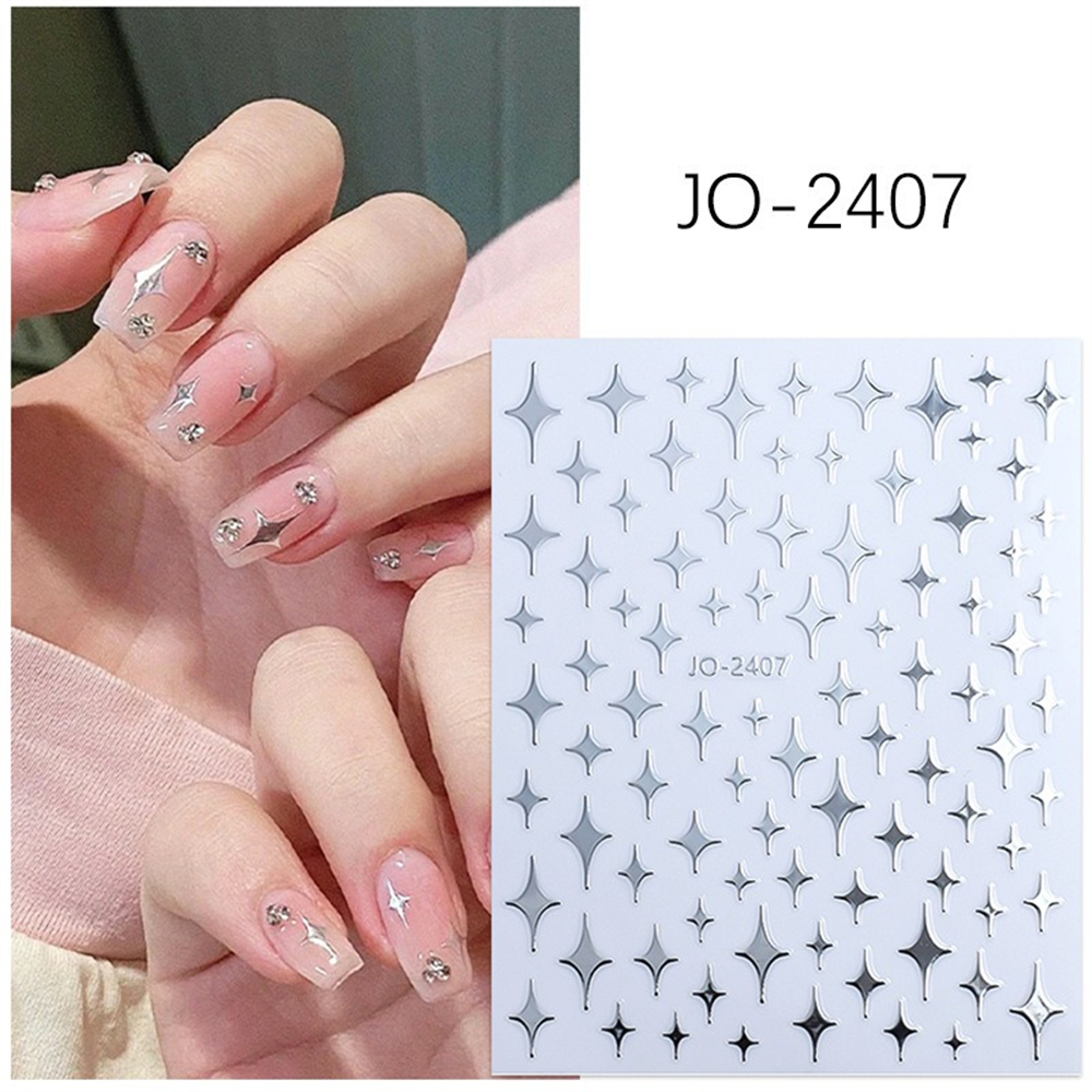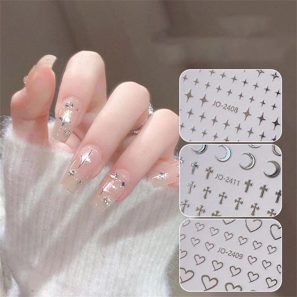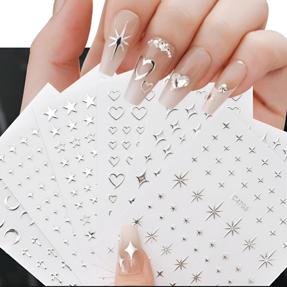6 Sheets Metal Silver Nail Stickers Metallic 3D Star Nail Art Stickers Decals Self-Adhesive Nail Art Stickers Metal Heart Tools