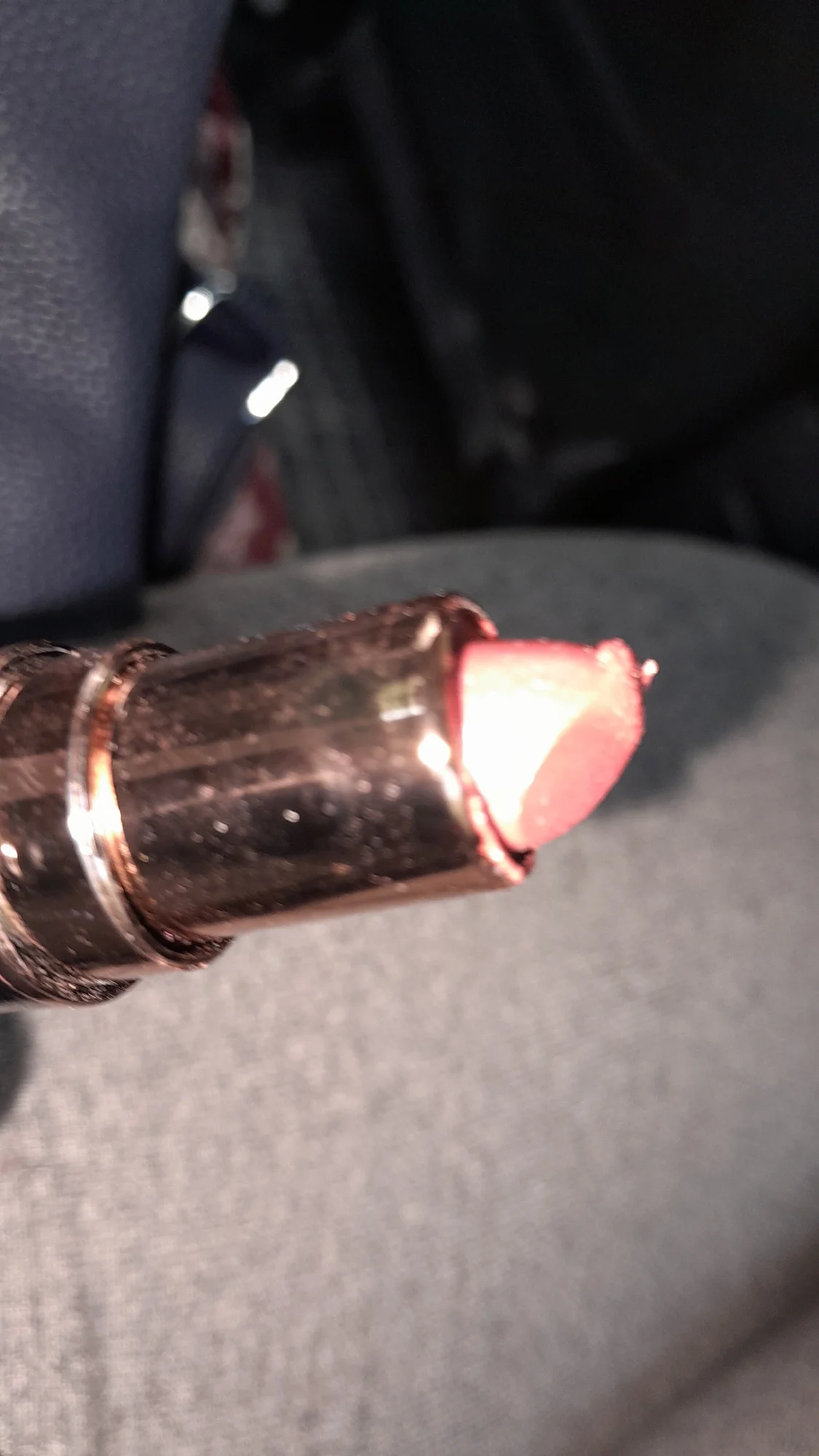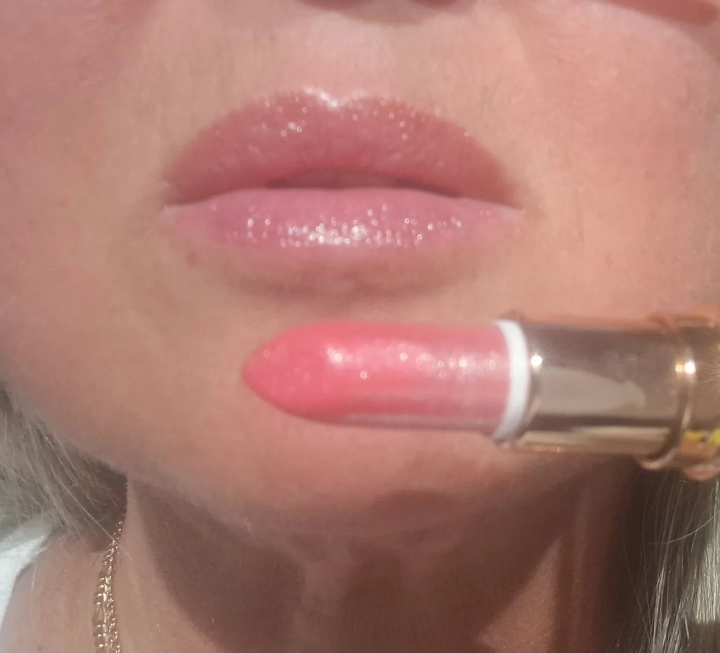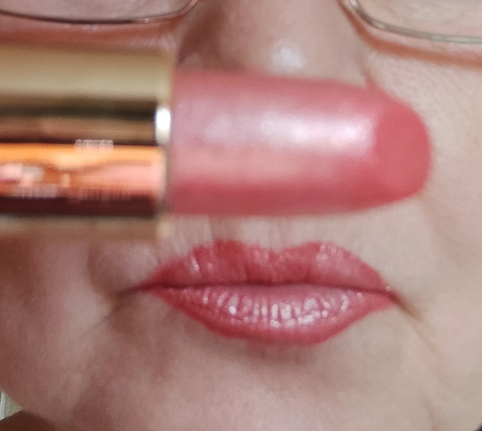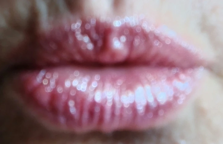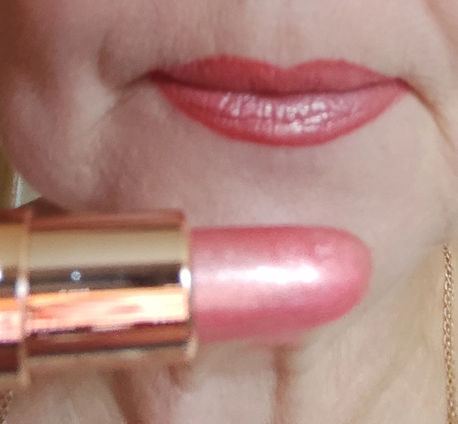 beautiful crimson color of the lipstick, looks beautiful on the lips in the sunlight. shines beautifully, doesn't stick, lasts on the lips. It looks much nicer on the lips. I will order another one just like this. I recommend this lipstick because the color and texture are really nice and good.