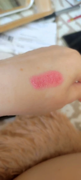 the order took a month to reach Kyiv. The smell is not very pleasant, and the lipstick is generally as advertised.. Pale pink with sparkles. It stays on the lips for a long time.