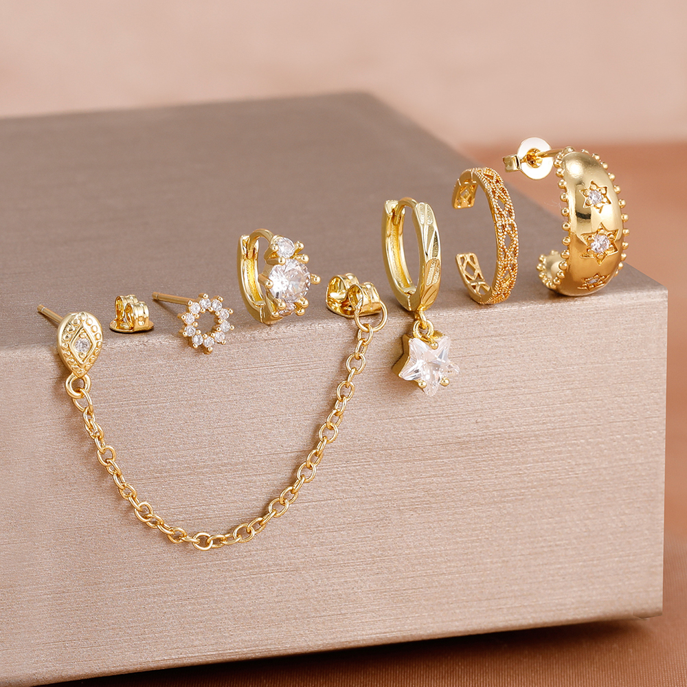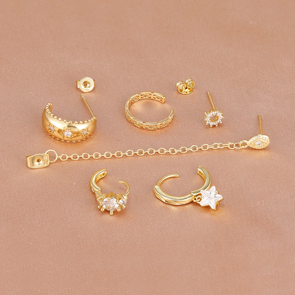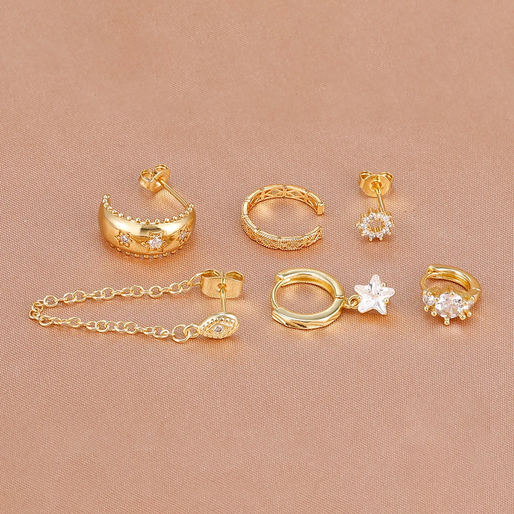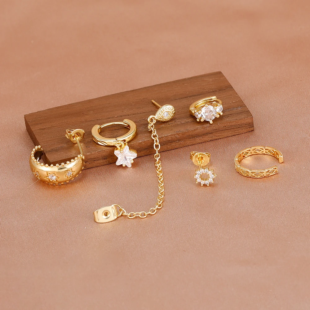 6PCS Stainless Steel 14K Gold Plated Hoop Earrings Set for Women Retro Ear Cuffs Clip Stud Zircon Star Dangle Piercing Jewelry